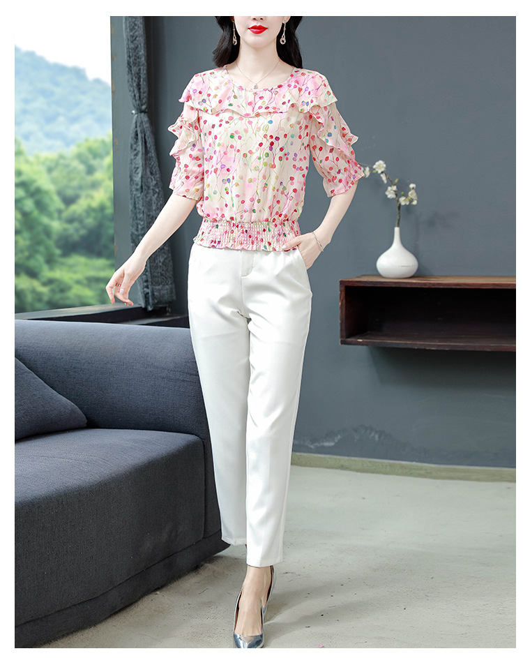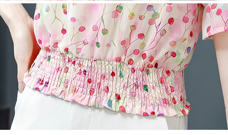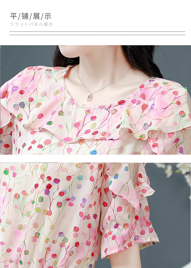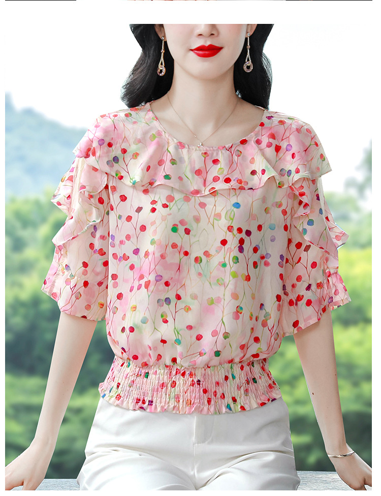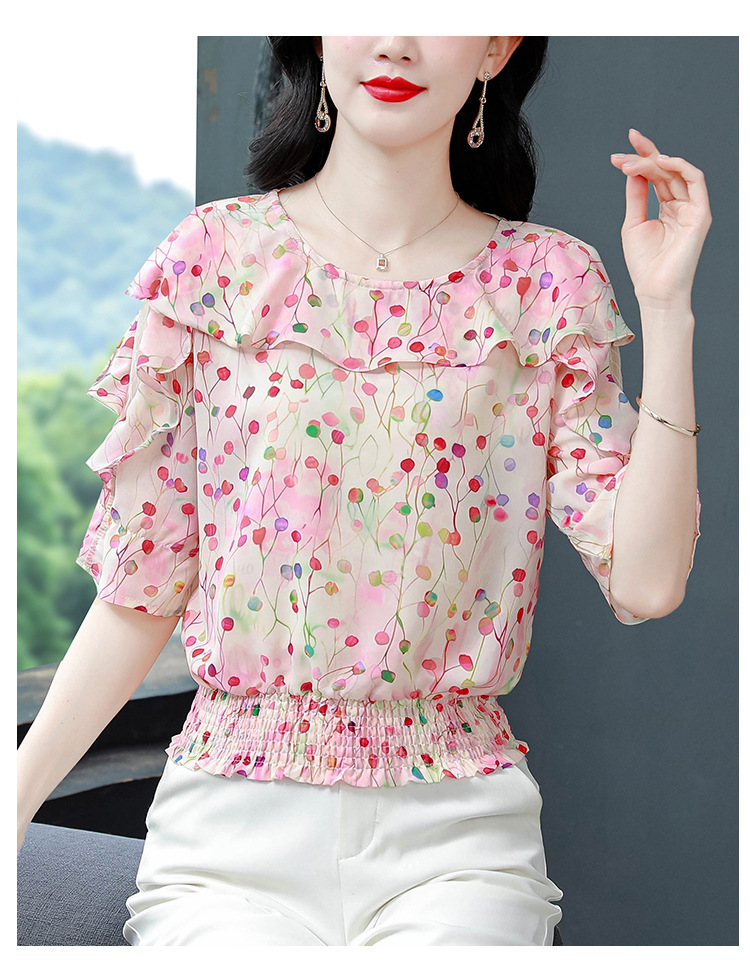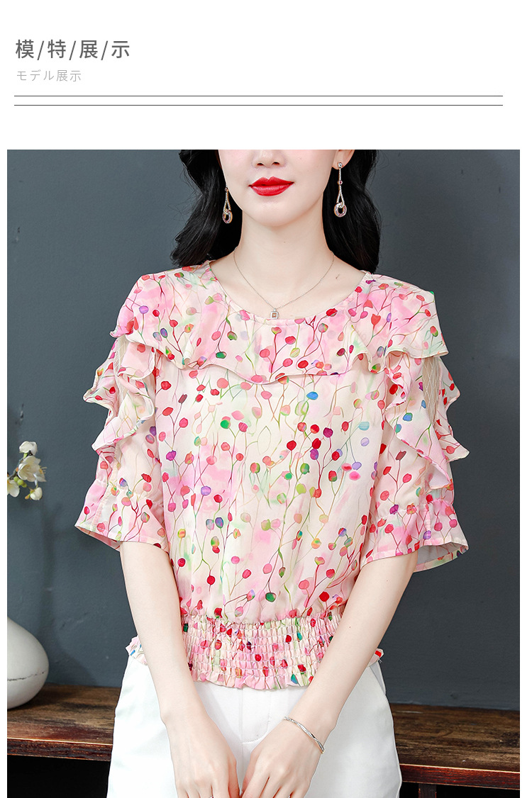 Шифоновая рубашка со средними рукавами и цветочным принтом для женщин, новый летний стиль, красивая рубашка, уменьшающая возраст, элитный короткий топ в западном стиле.