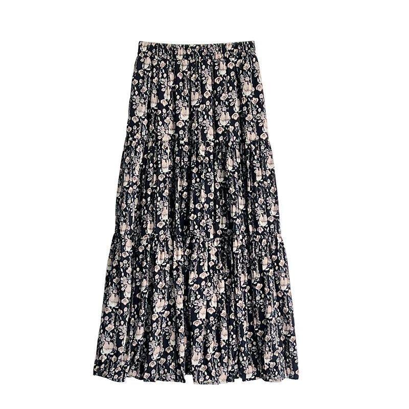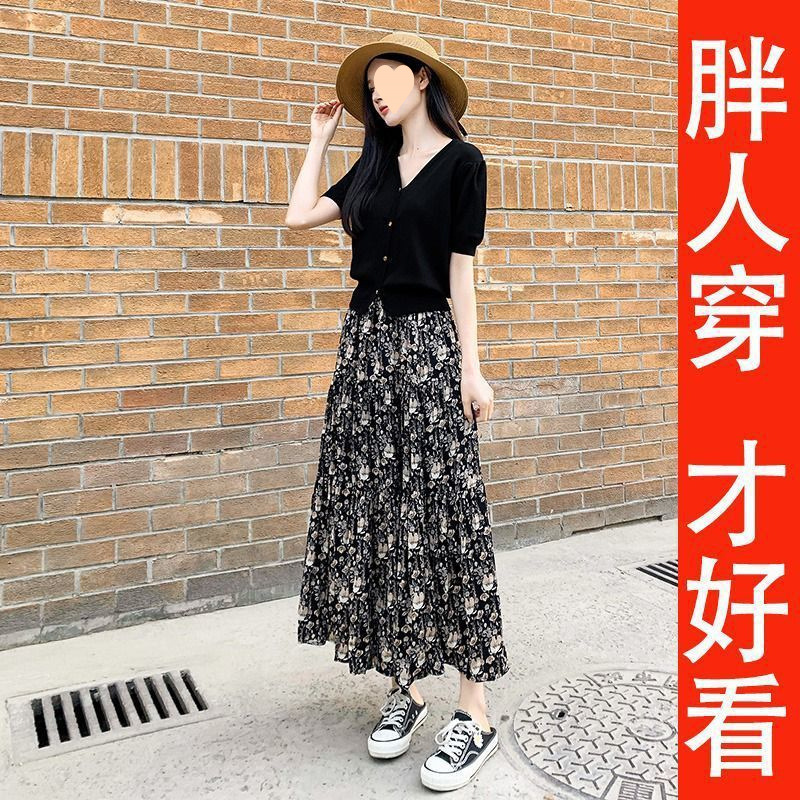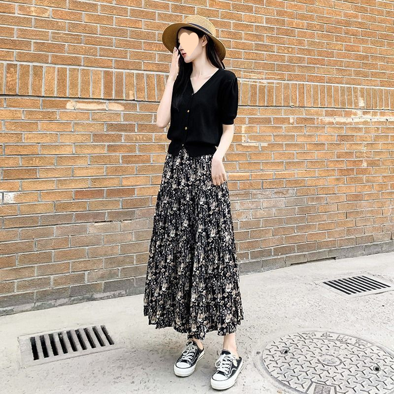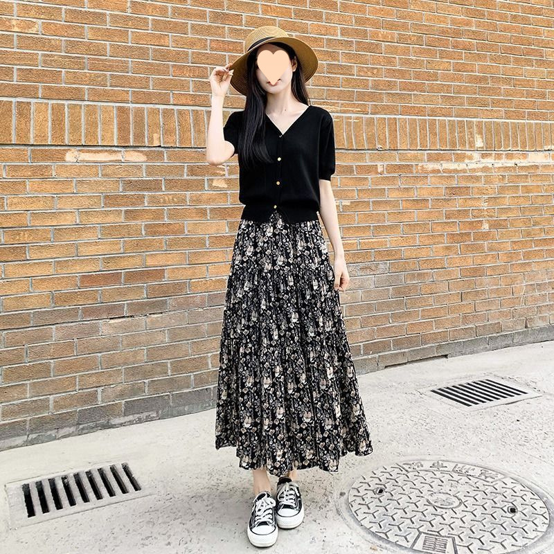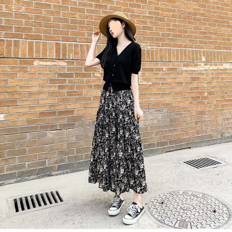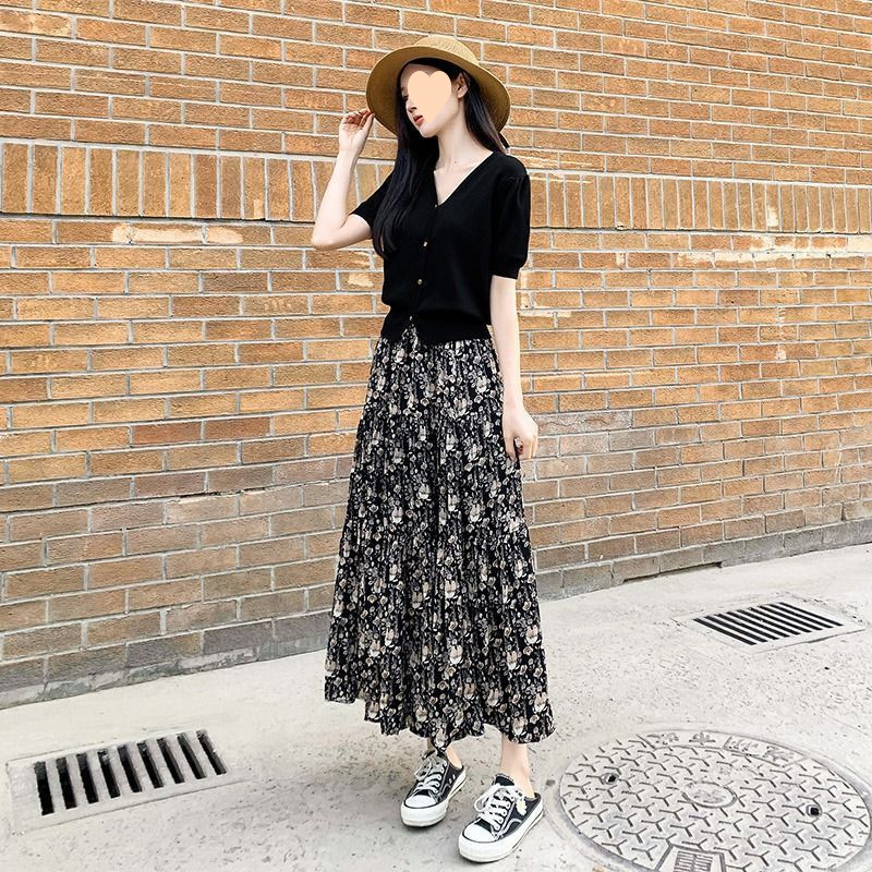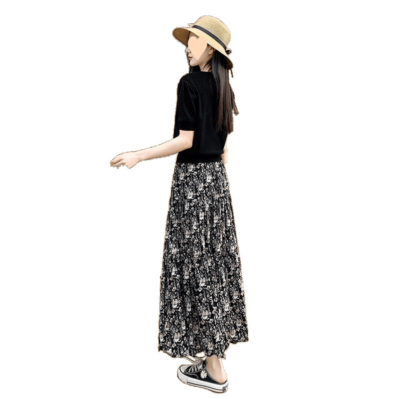 Черный топ с V-образным вырезом [одинарный топ]; Юбка с цветочным принтом [одинарная юбка]; Черный топ + юбка с цветочным принтом [комплект из двух предметов]