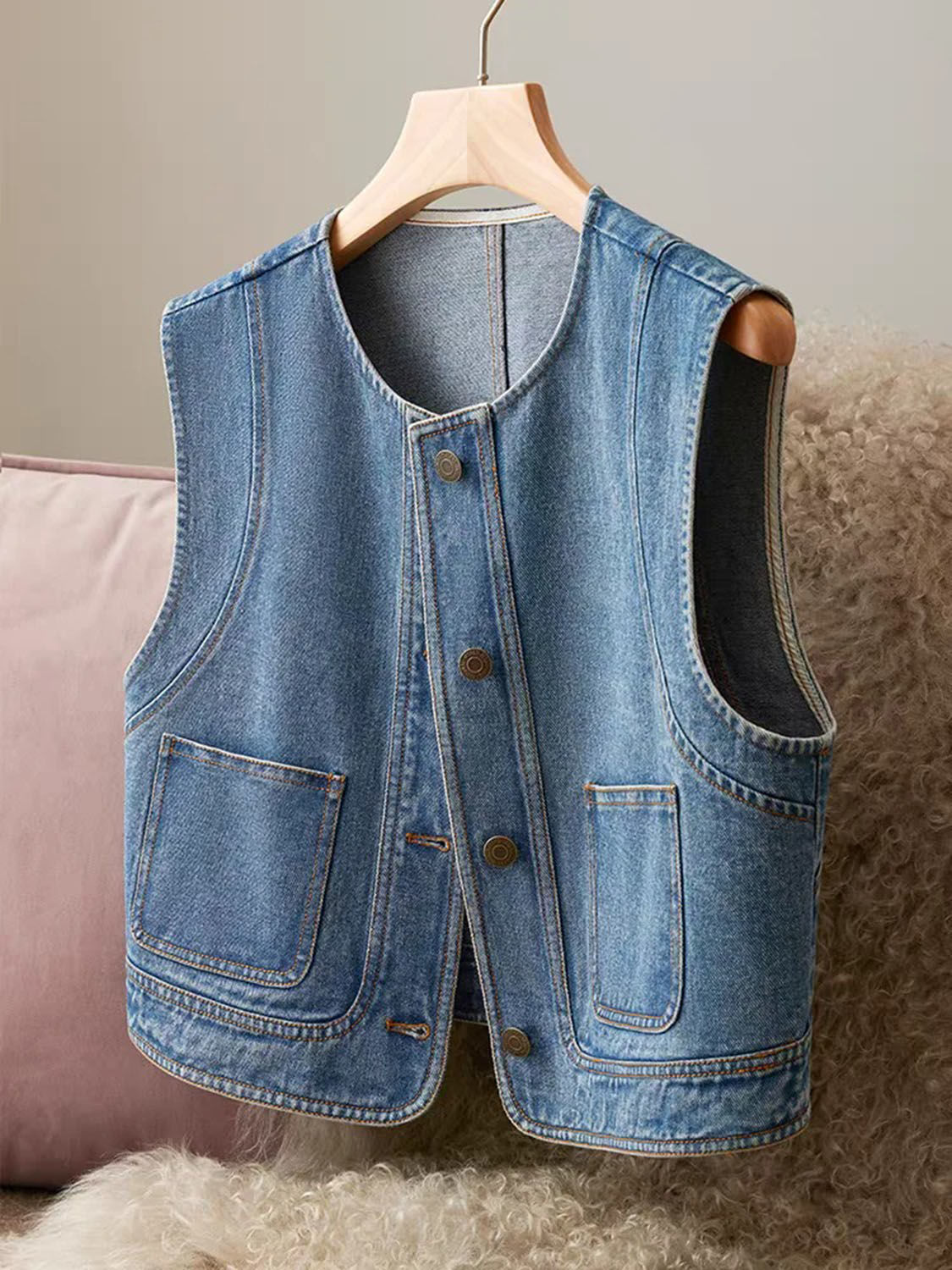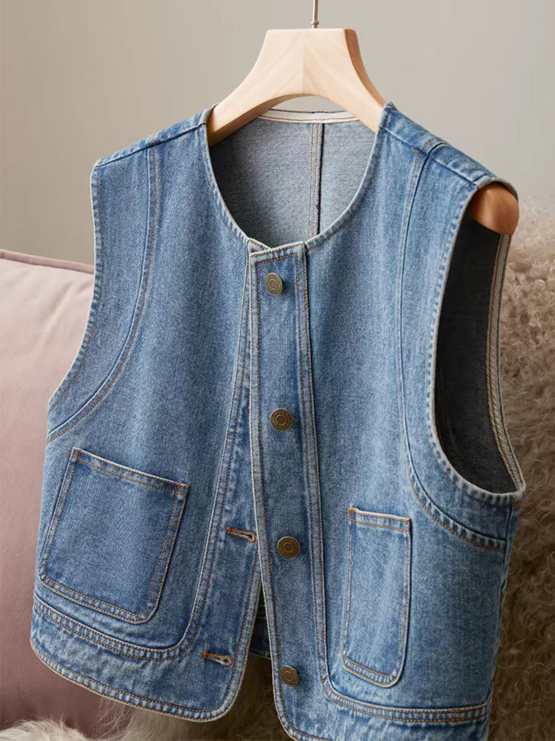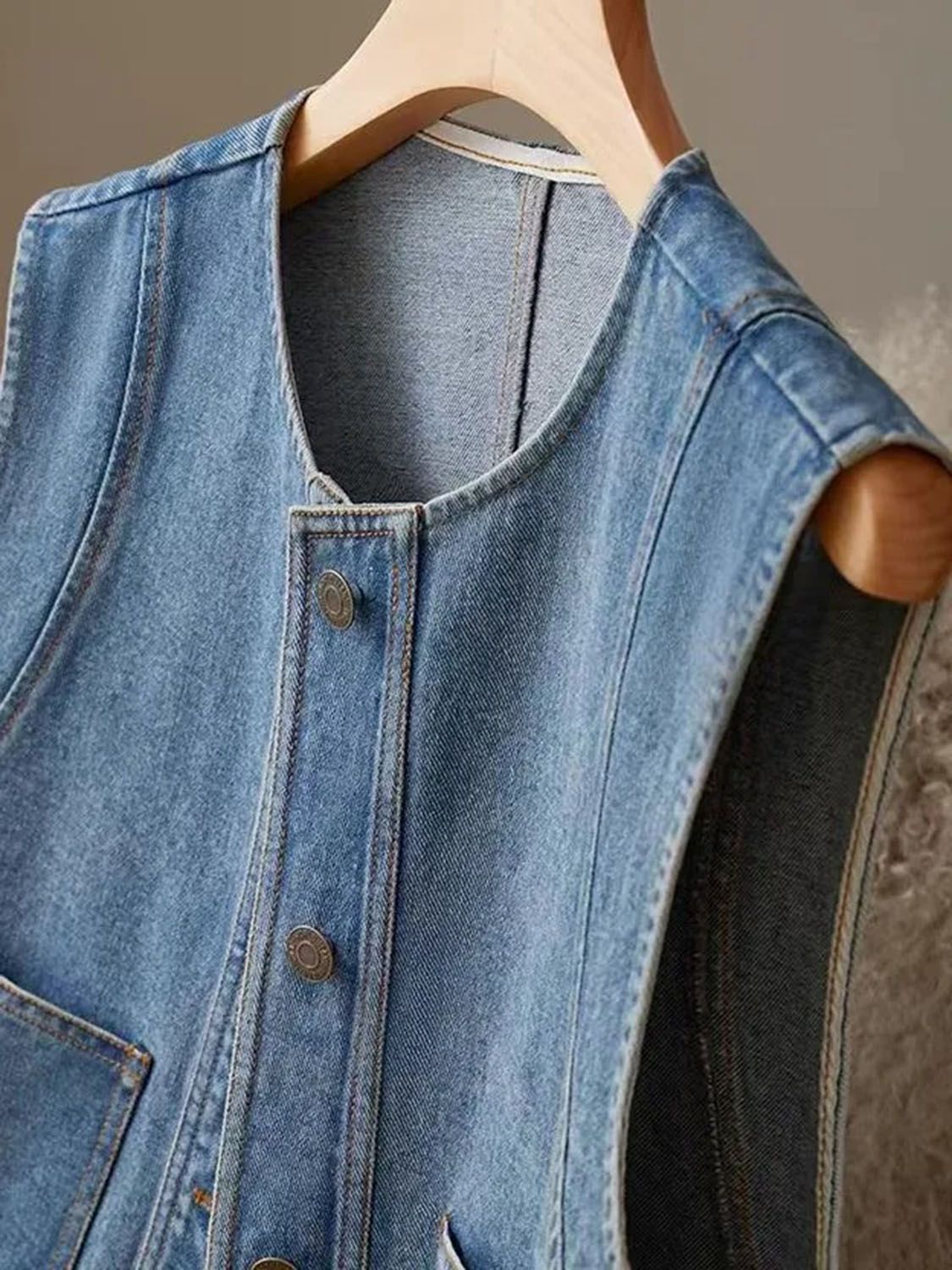 Модный универсальный многослойный джинсовый жилет для женщин, новая весенне-летняя свободная повседневная короткая куртка без рукавов для миниатюрных фигур.
