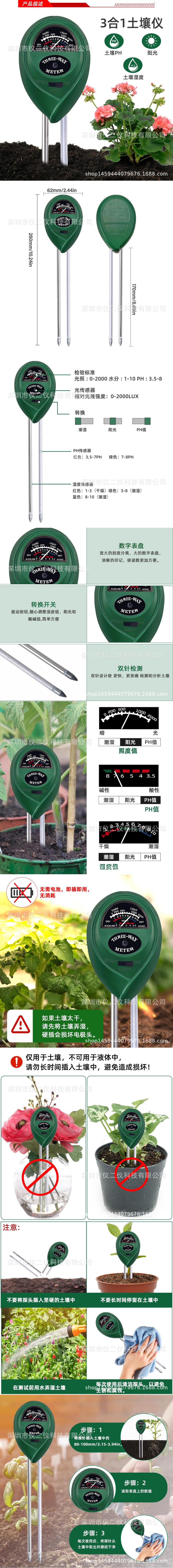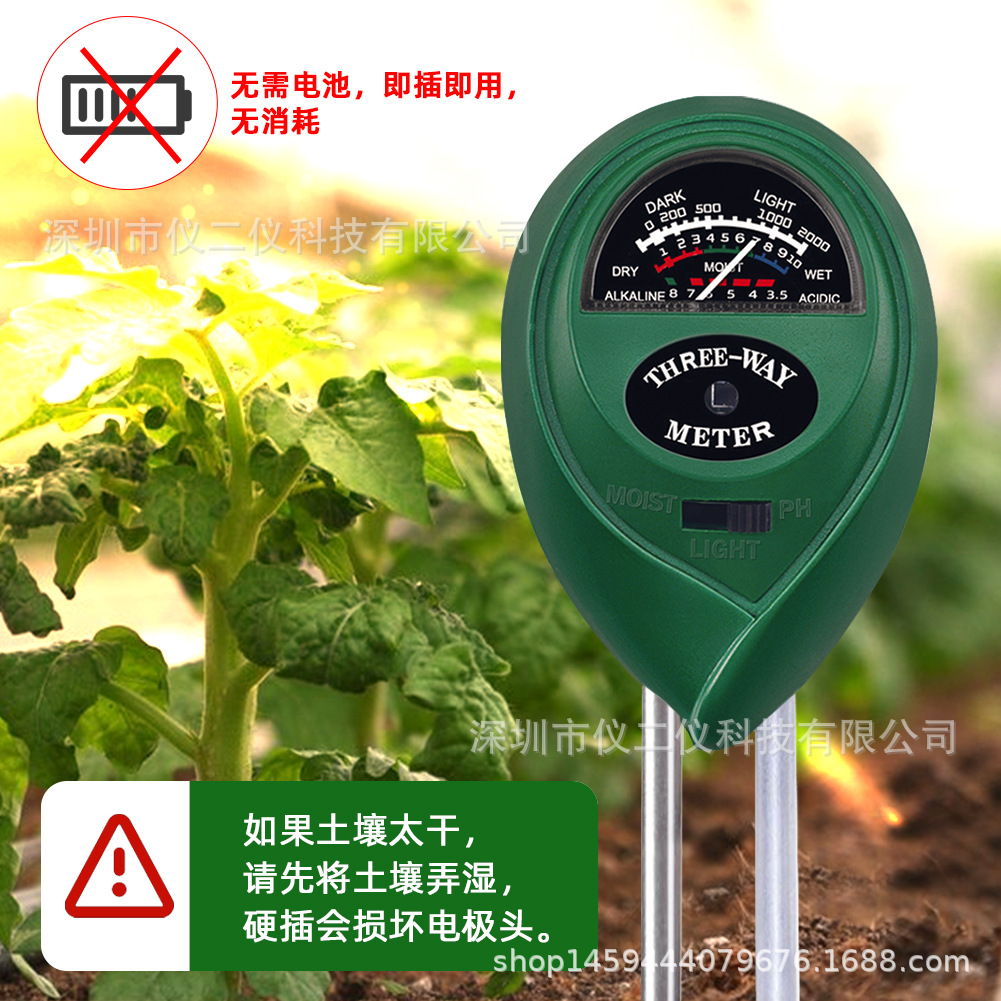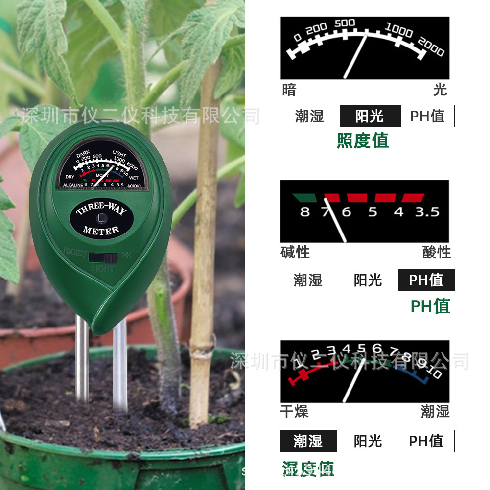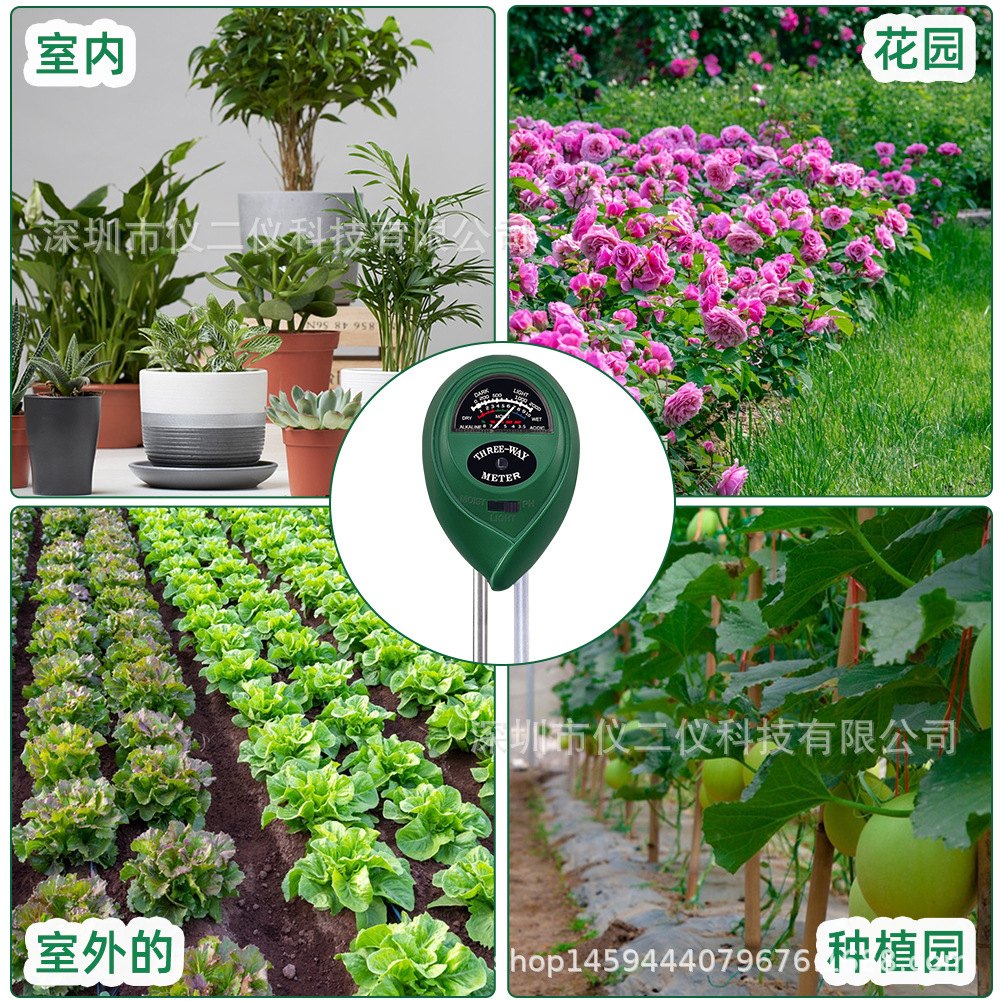 Готовый к использованию зеленый круглый тестер почвы "три в одном" от производителя: измерение влажности почвы, pH и освещенности.