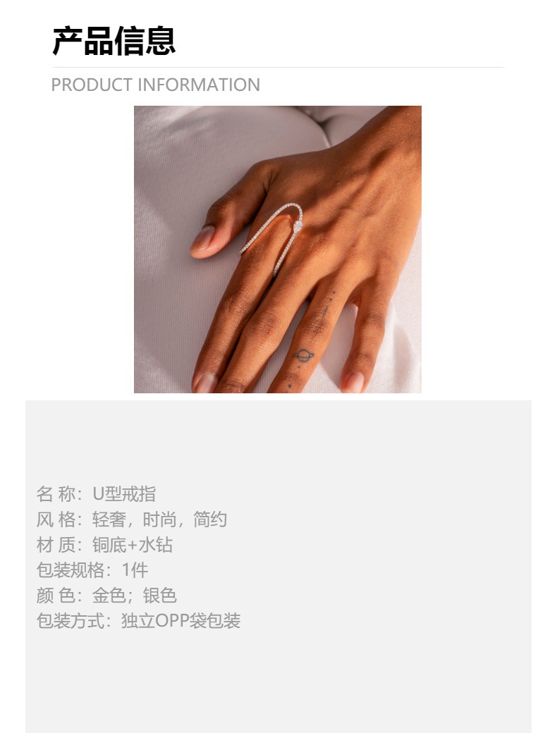 Новое трансграничное U-образное кольцо с нишевым дизайном, доступное роскошное кольцо со стразами, модное простое универсальное ювелирное кольцо для рук