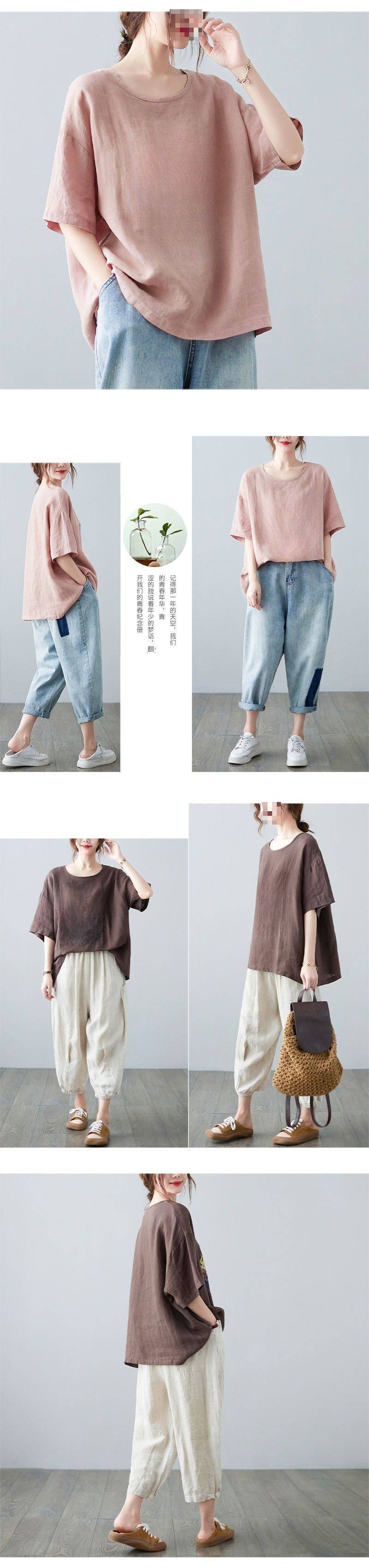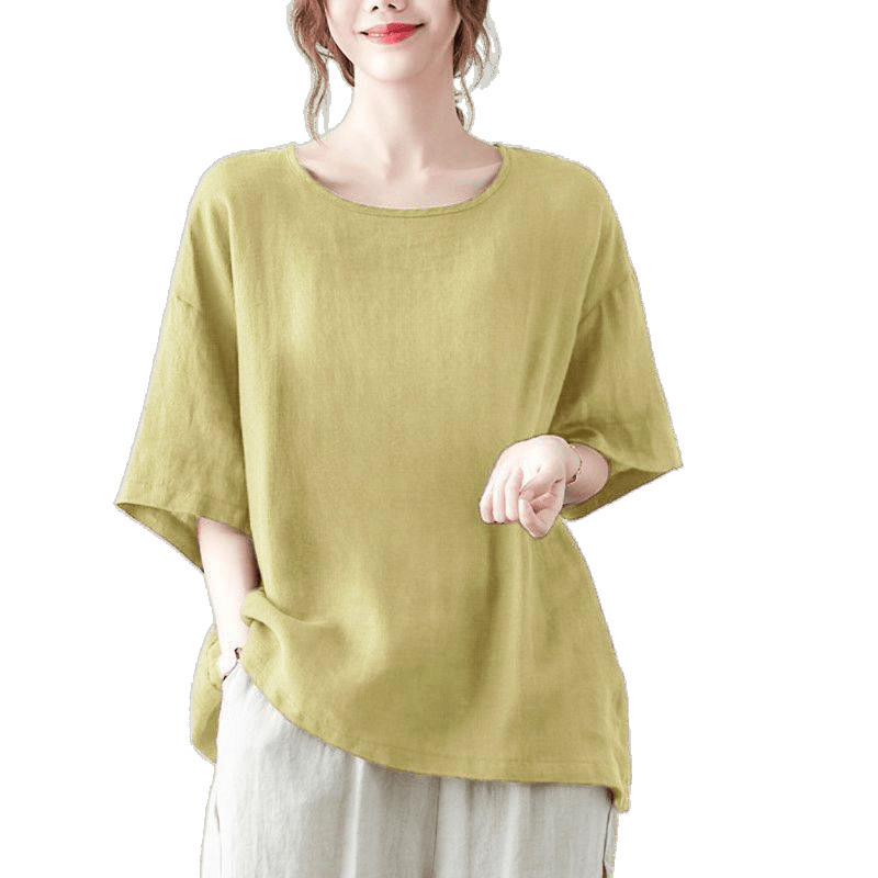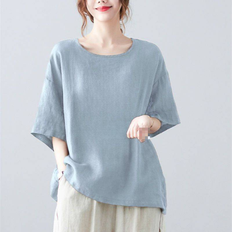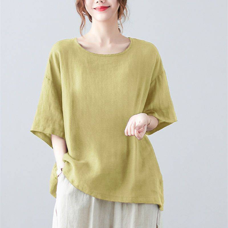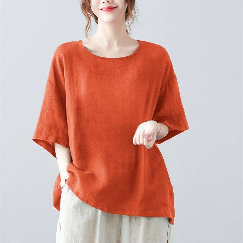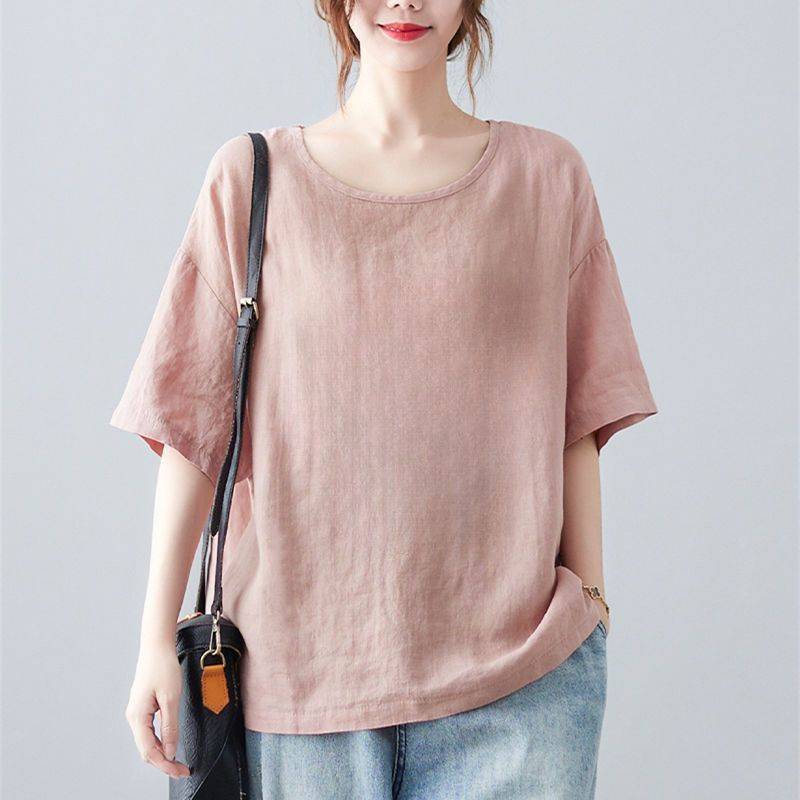 Повседневные однотонные ретро-литературные топы 2025 года, новые свободные женские хлопковые и льняные топы с короткими рукавами, облегающие и универсальные, больших размеров