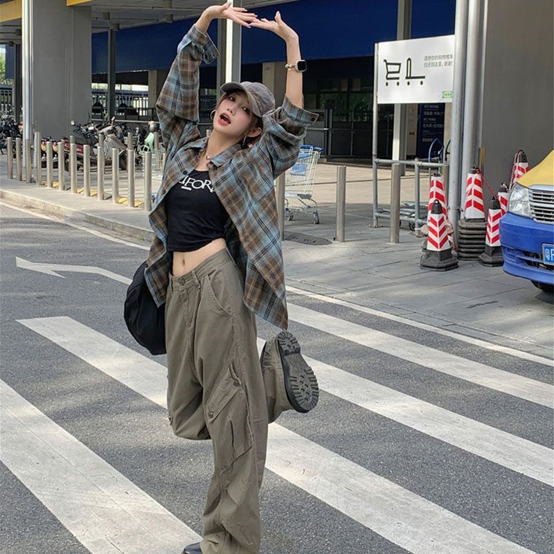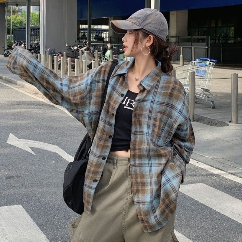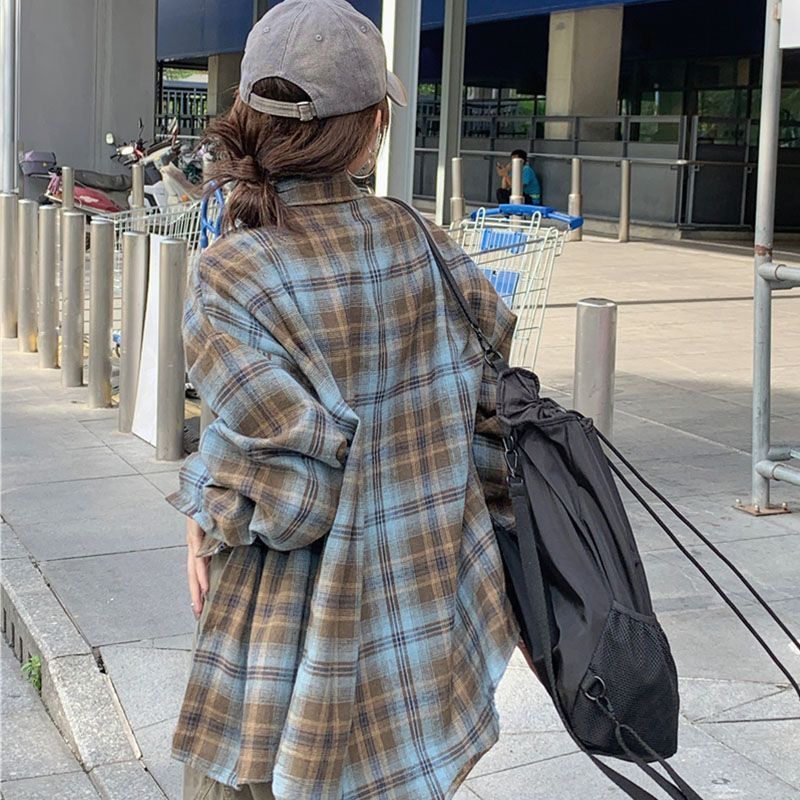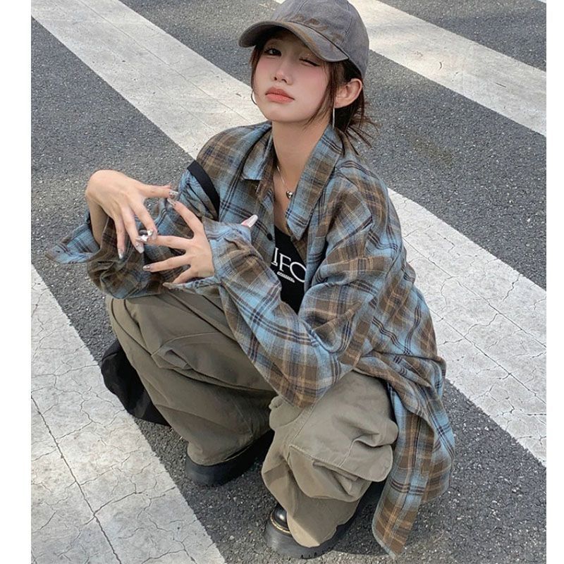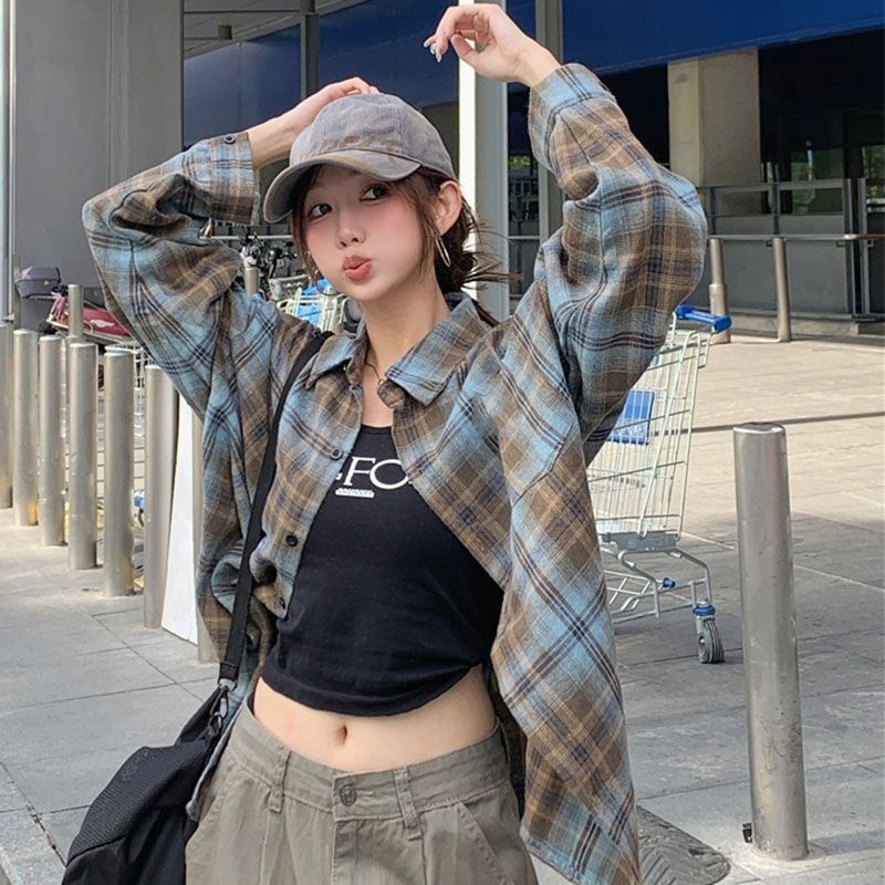 Женская рубашка-поло в клетку, новый стиль 2025 года, ленивый стиль, ранняя осень, американский ретро, свободного кроя, средней длины, с защитой от солнца