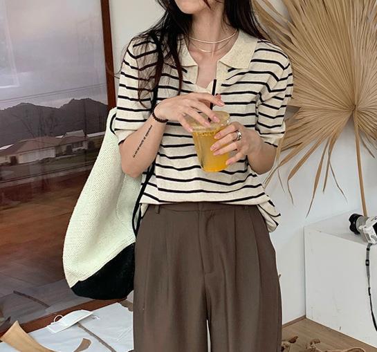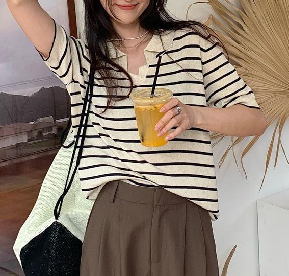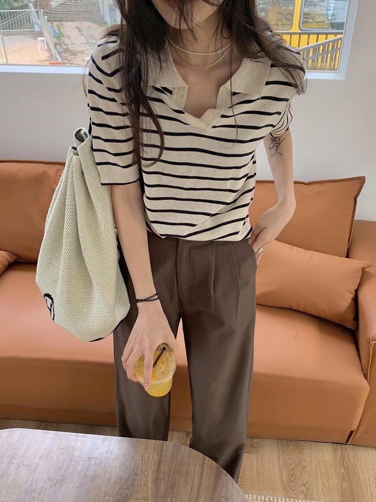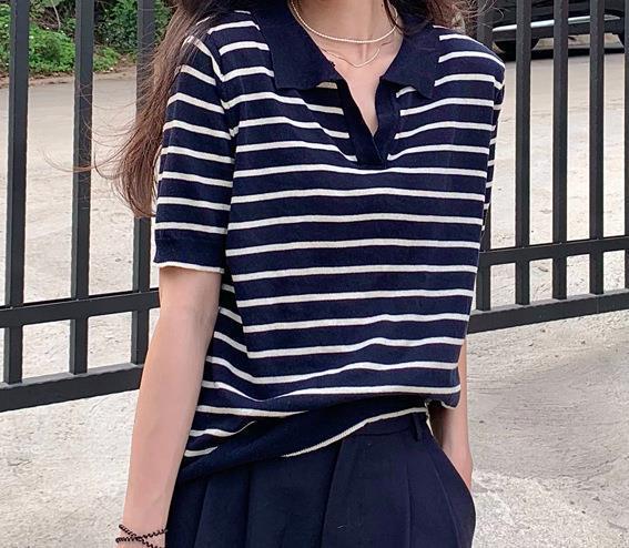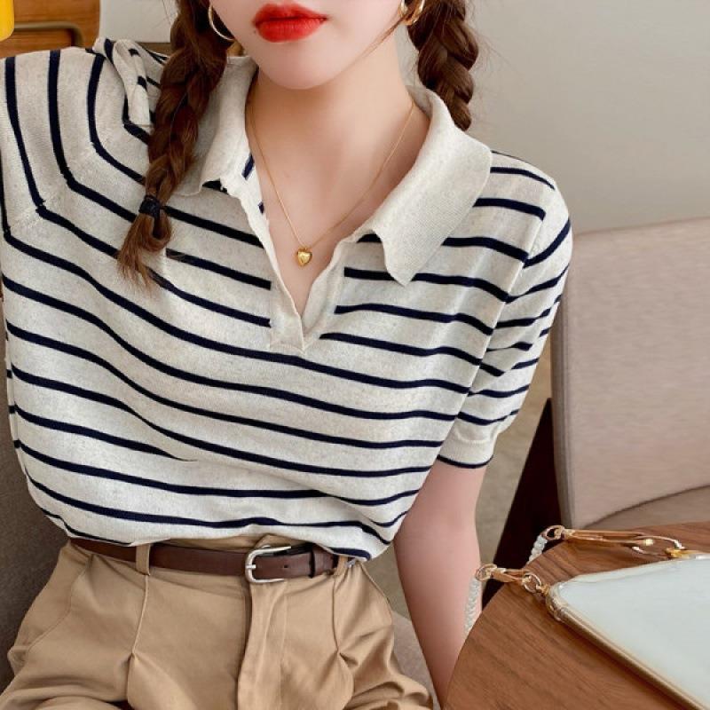 Японский и корейский экспортный полосатый трикотаж с v-образным вырезом для женщин, лето и осень 2025 года, корейская модная футболка с короткими рукавами, женские топы в гонконгском стиле для женщин