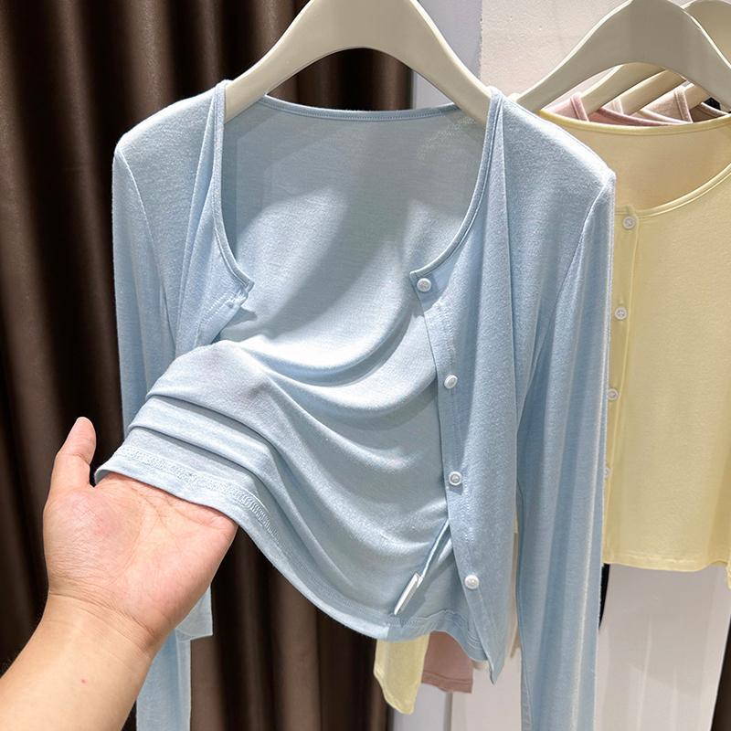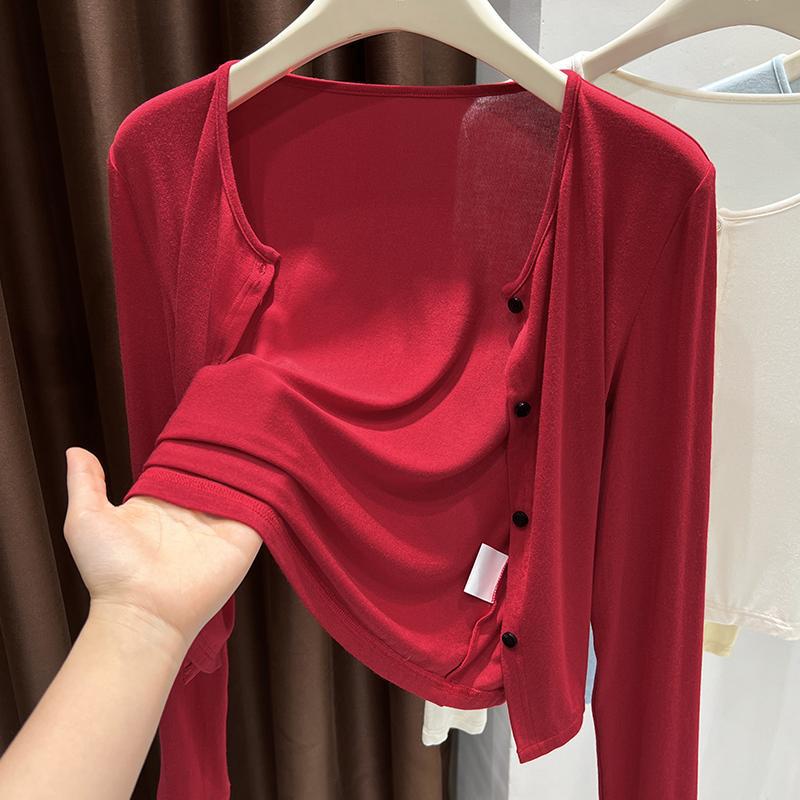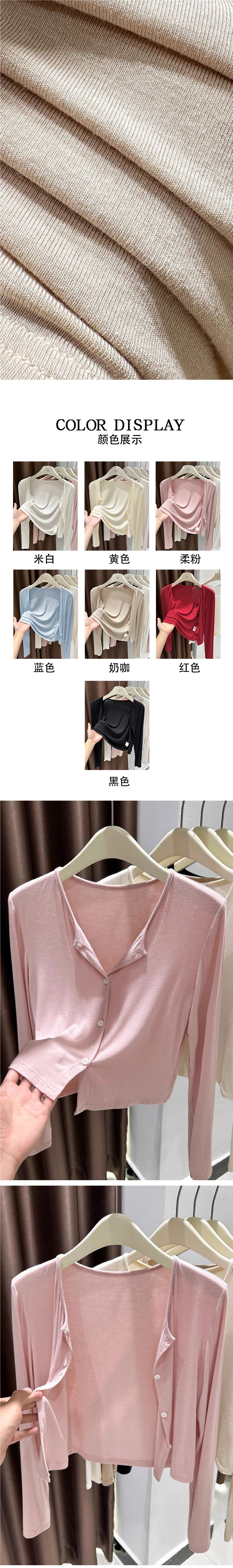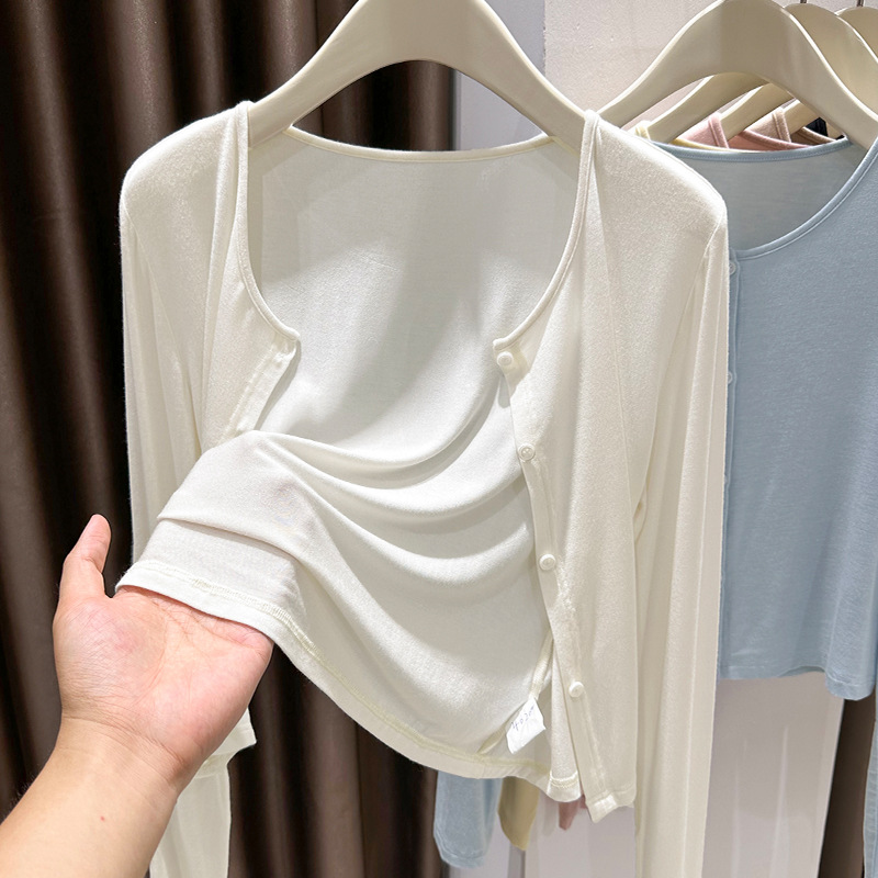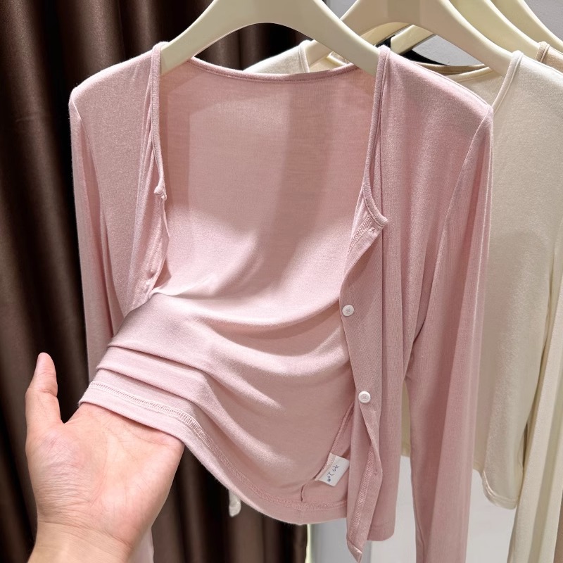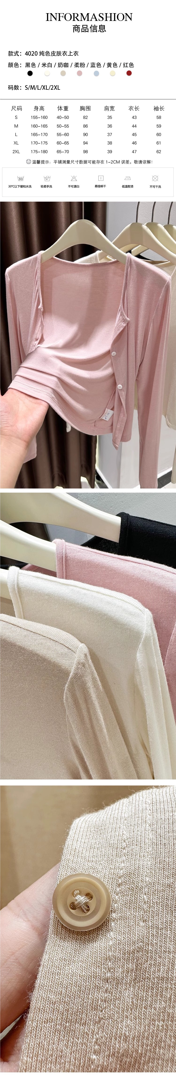 Розовый вязаный женский летний кардиган с юбкой на подтяжках, маленькой внешней шалью, тонкой блузкой из ледяного шелка с солнцезащитным кремом.
