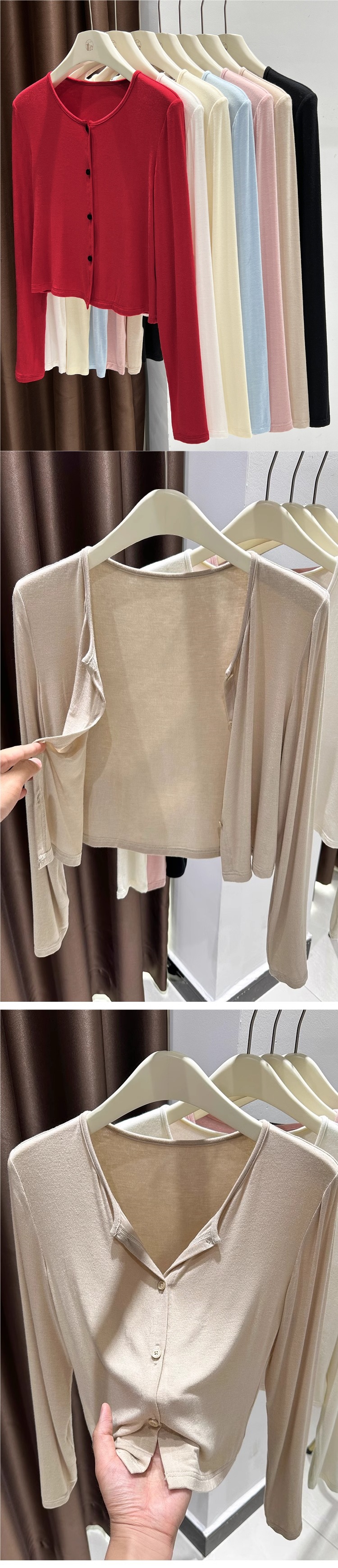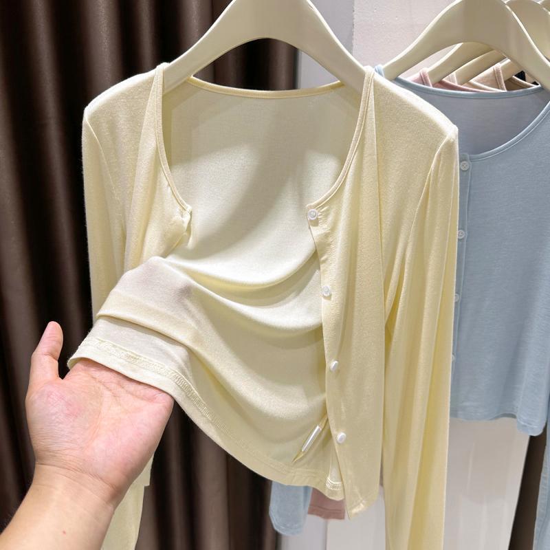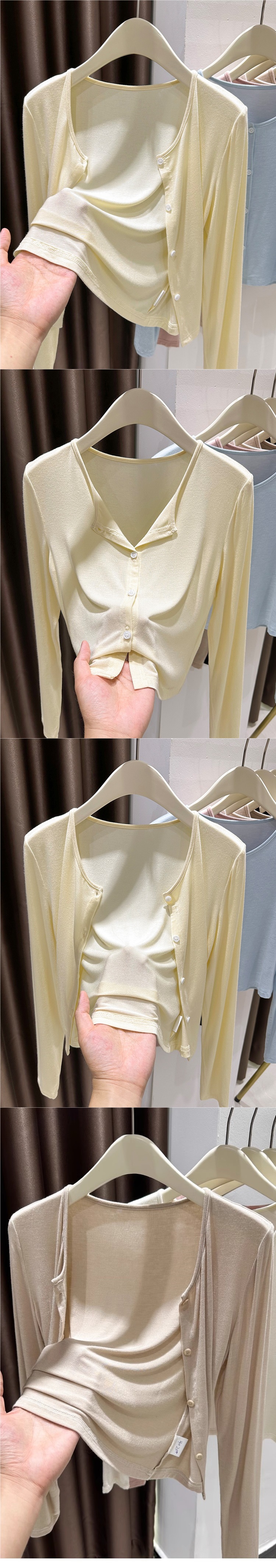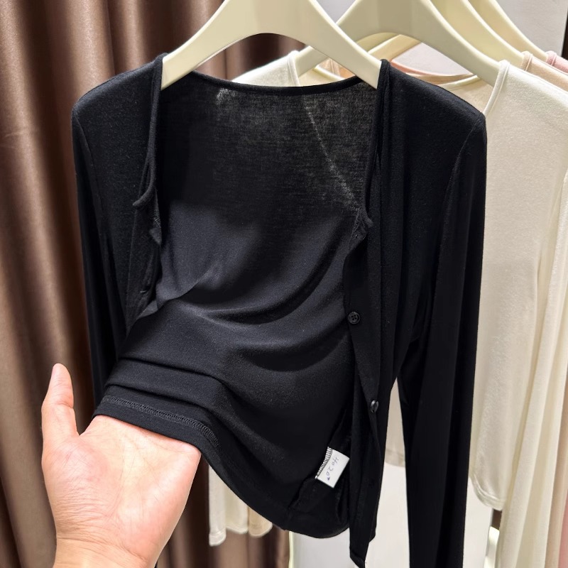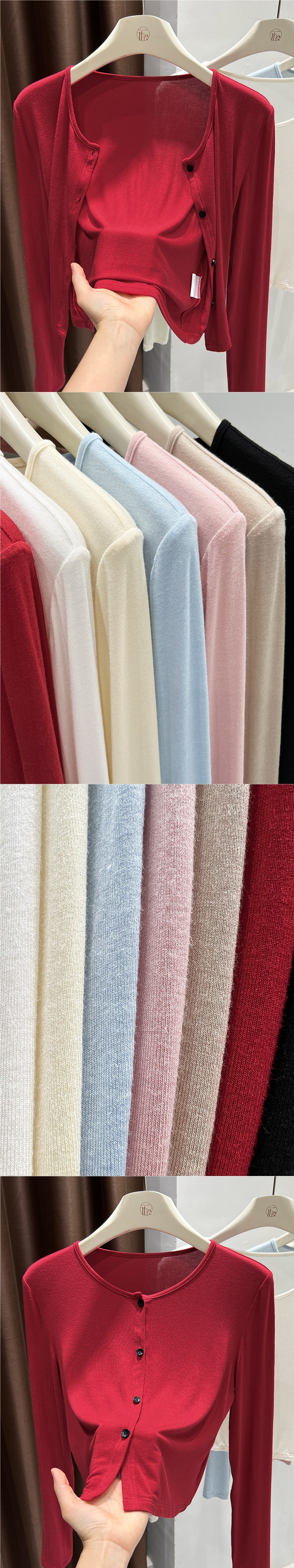 Розовый вязаный женский летний кардиган с юбкой на подтяжках, маленькой внешней шалью, тонкой блузкой из ледяного шелка с солнцезащитным кремом.