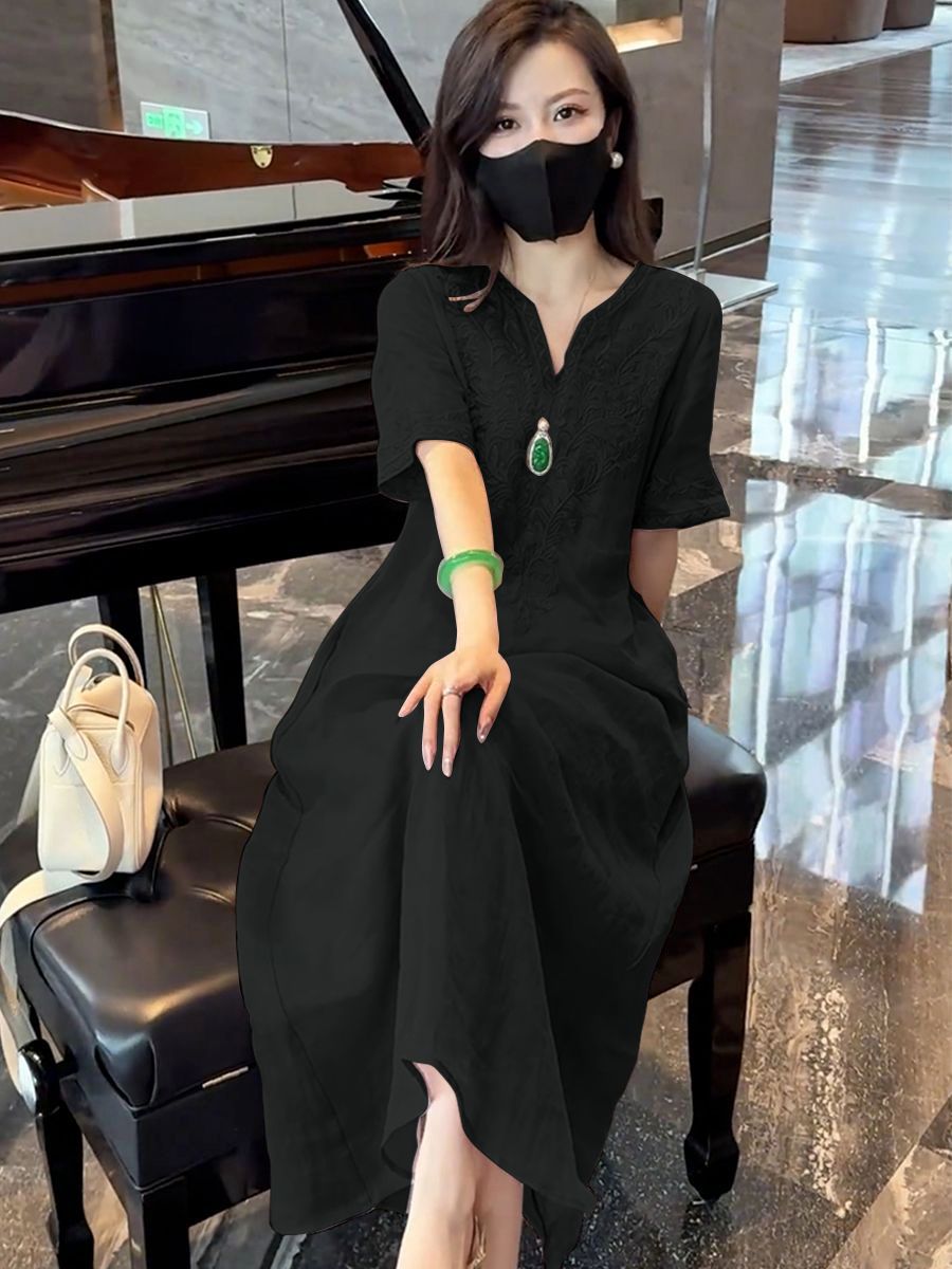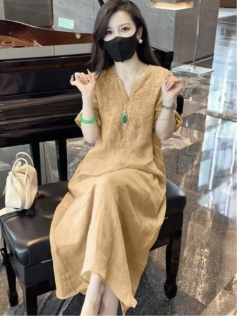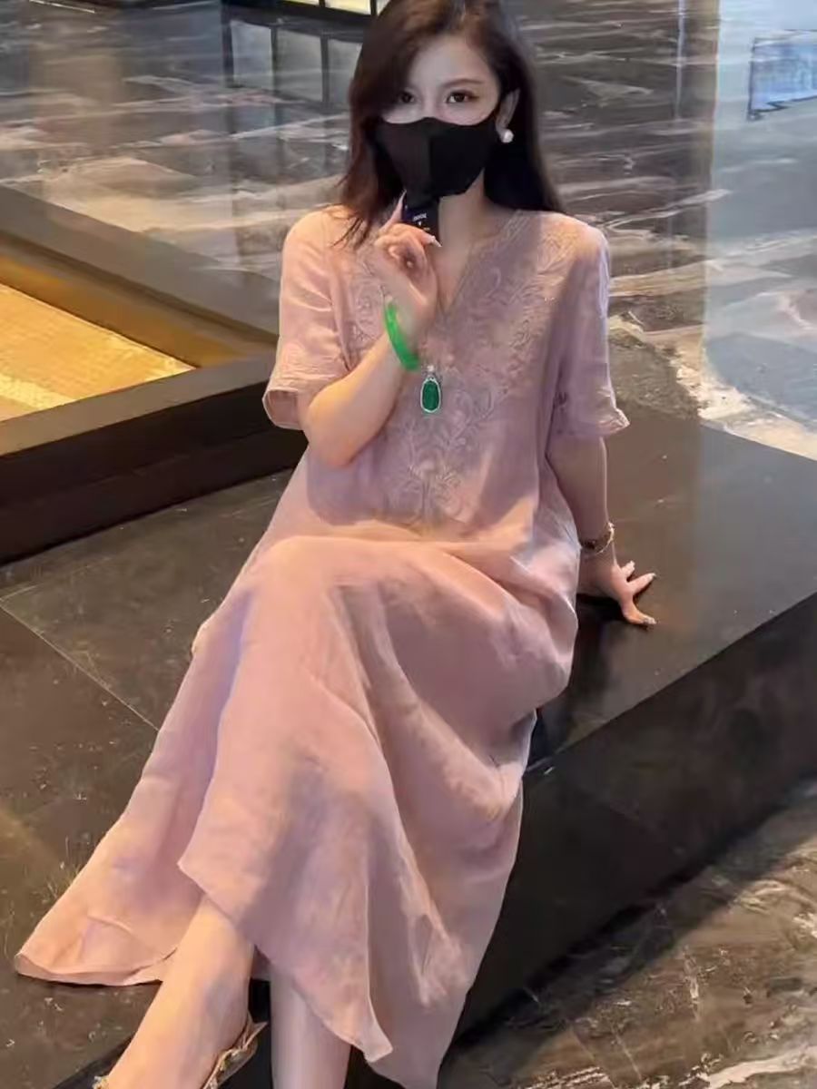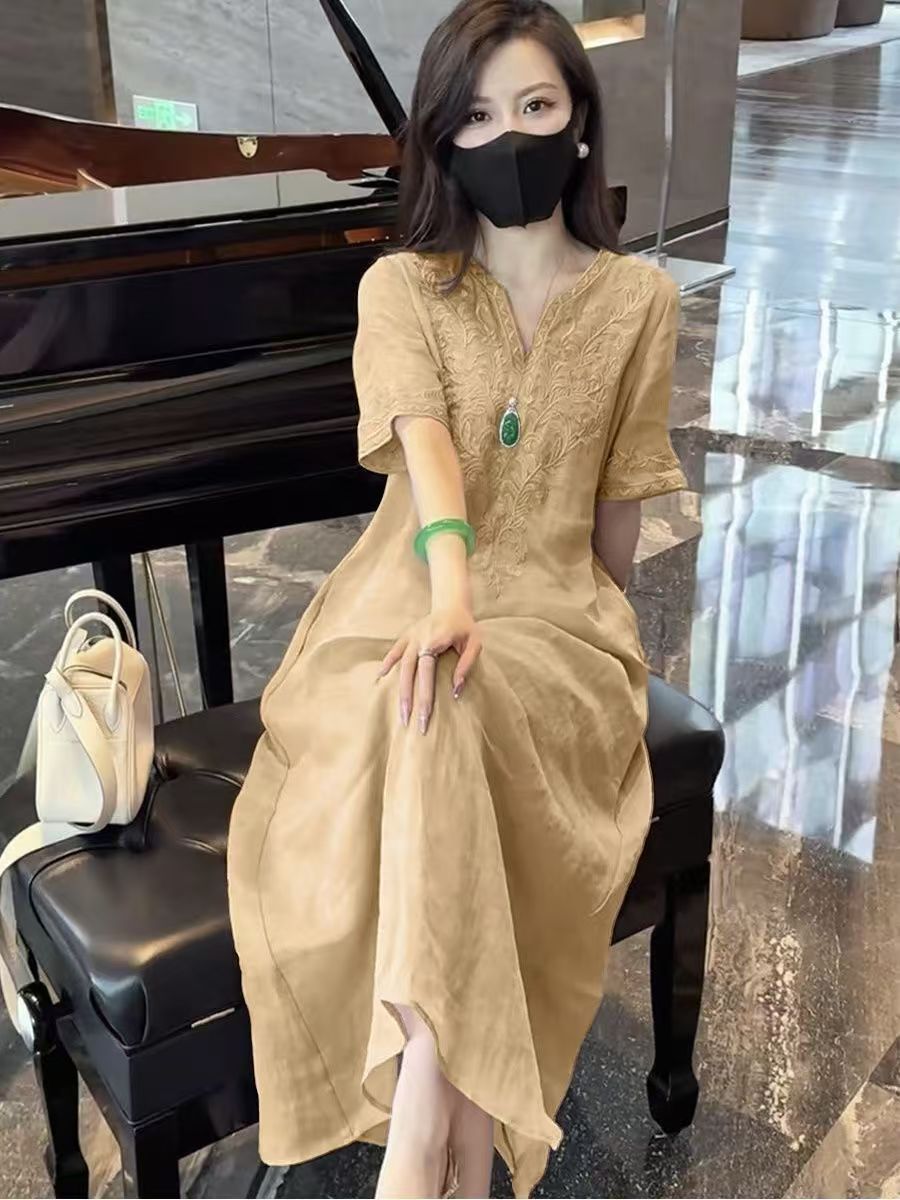 2025 новый летний стиль свободная утягивающая длинная юбка новый китайский национальный стиль платье с глубоким вырезом и тяжелой вышивкой для женщин