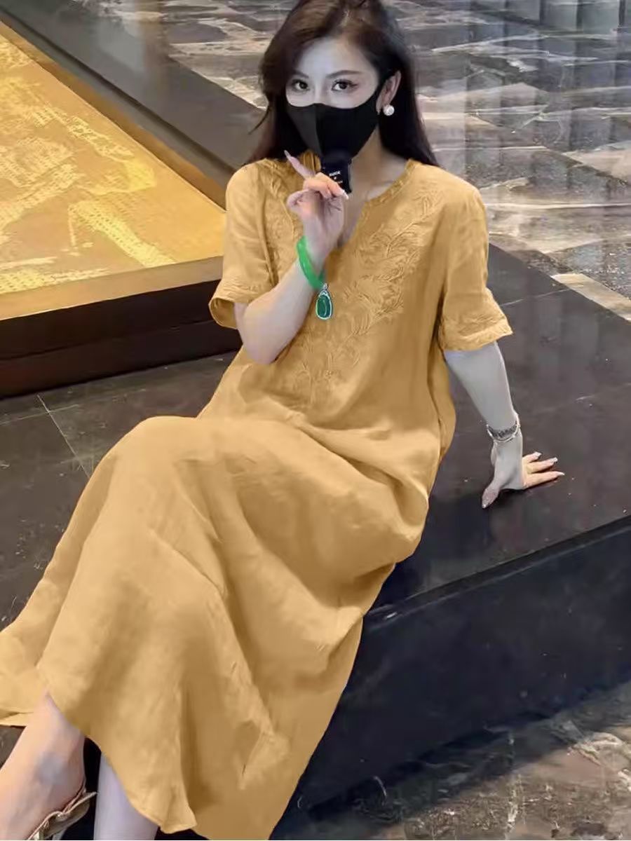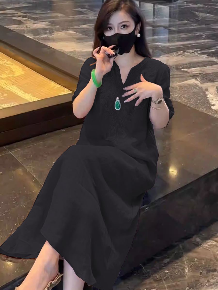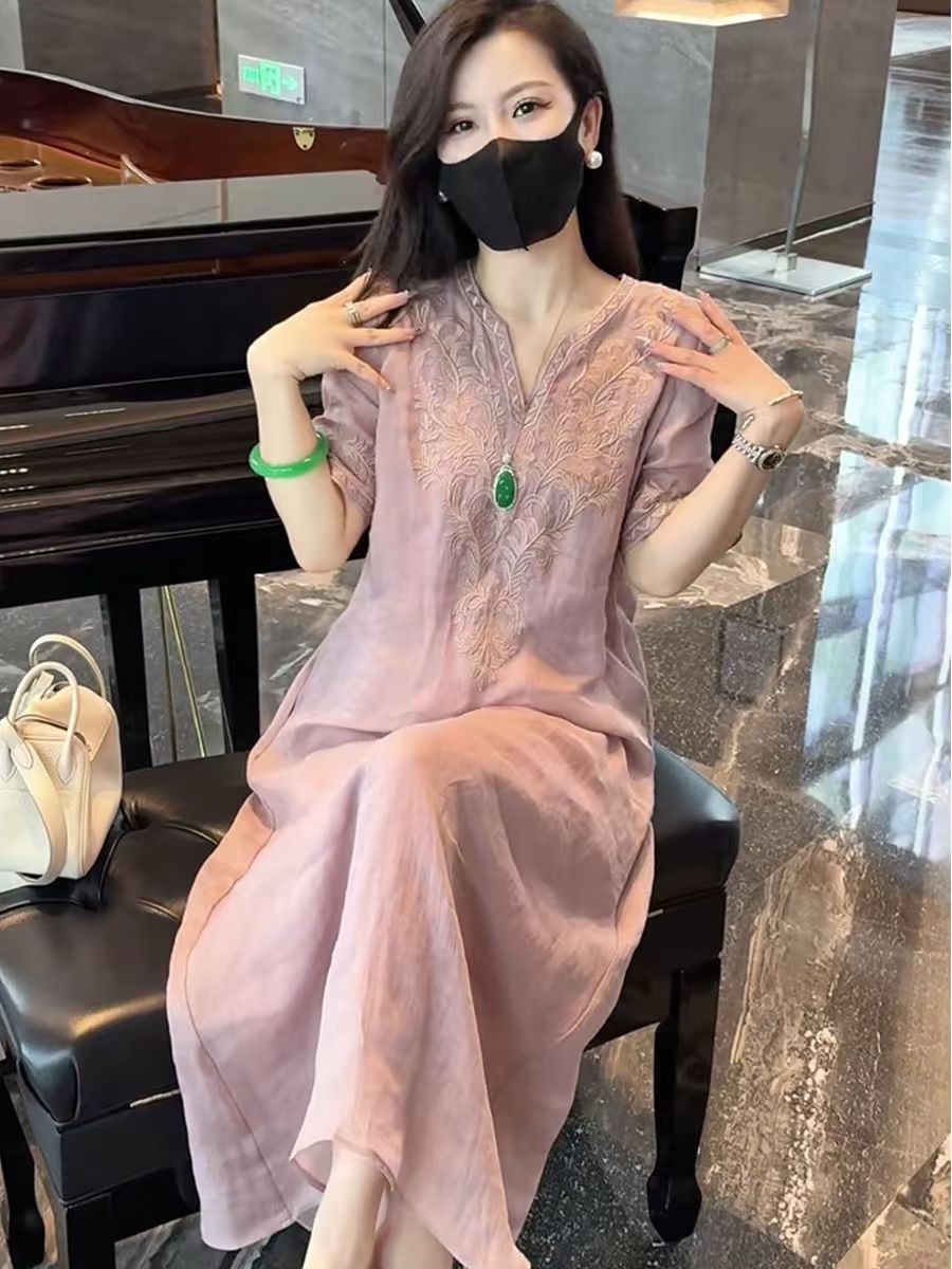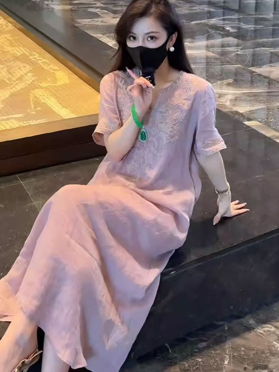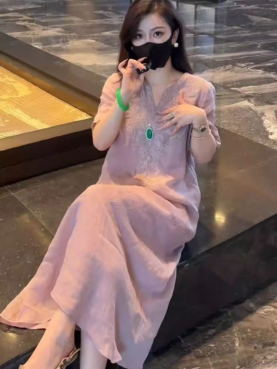 2025 новый летний стиль свободная утягивающая длинная юбка новый китайский национальный стиль платье с глубоким вырезом и тяжелой вышивкой для женщин