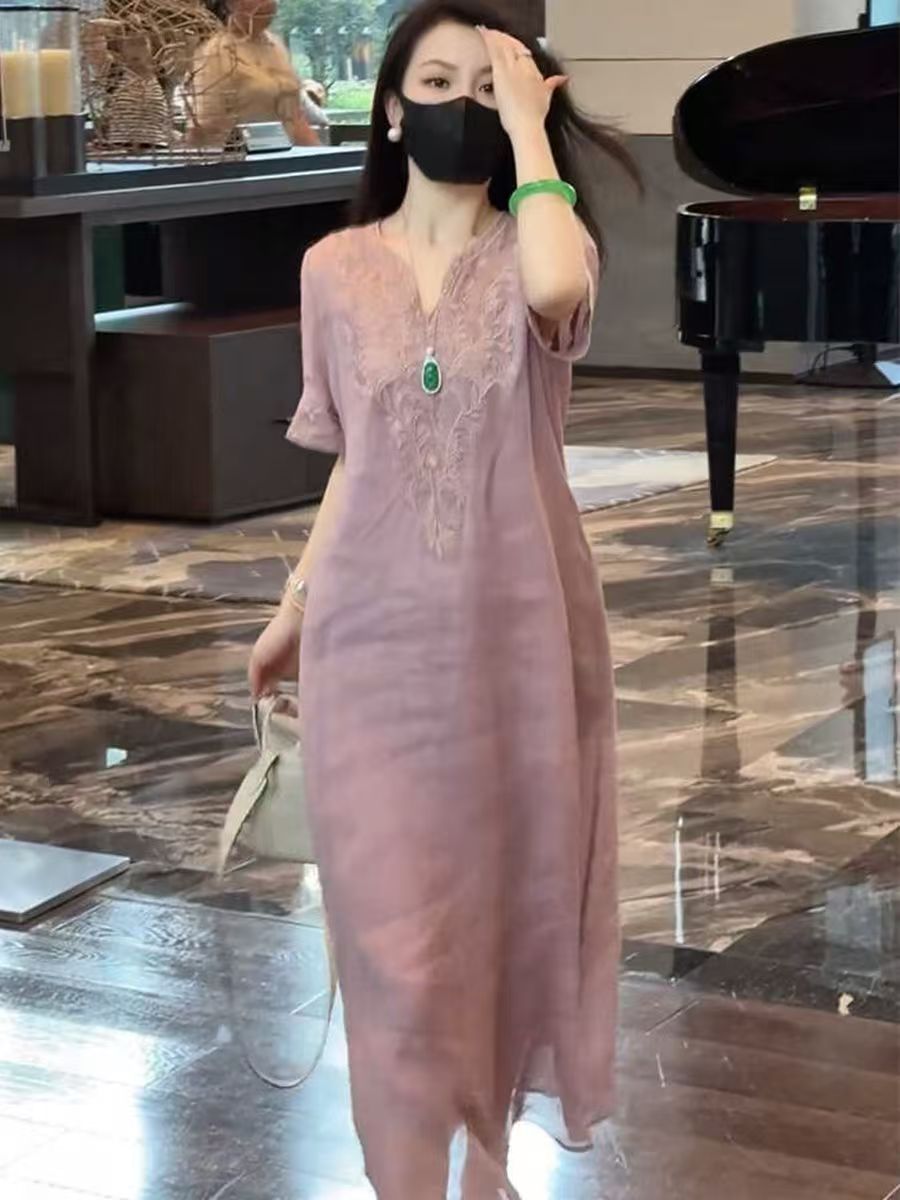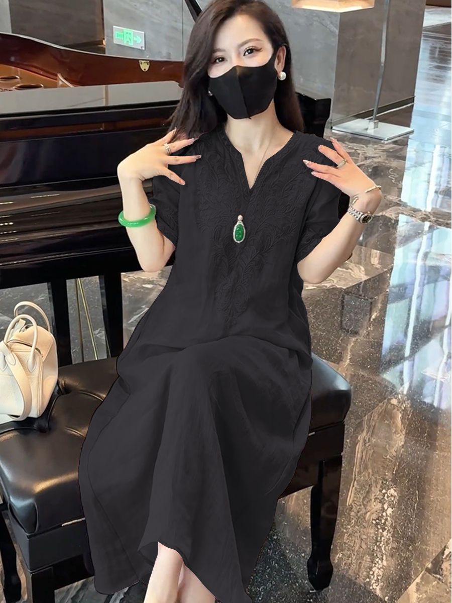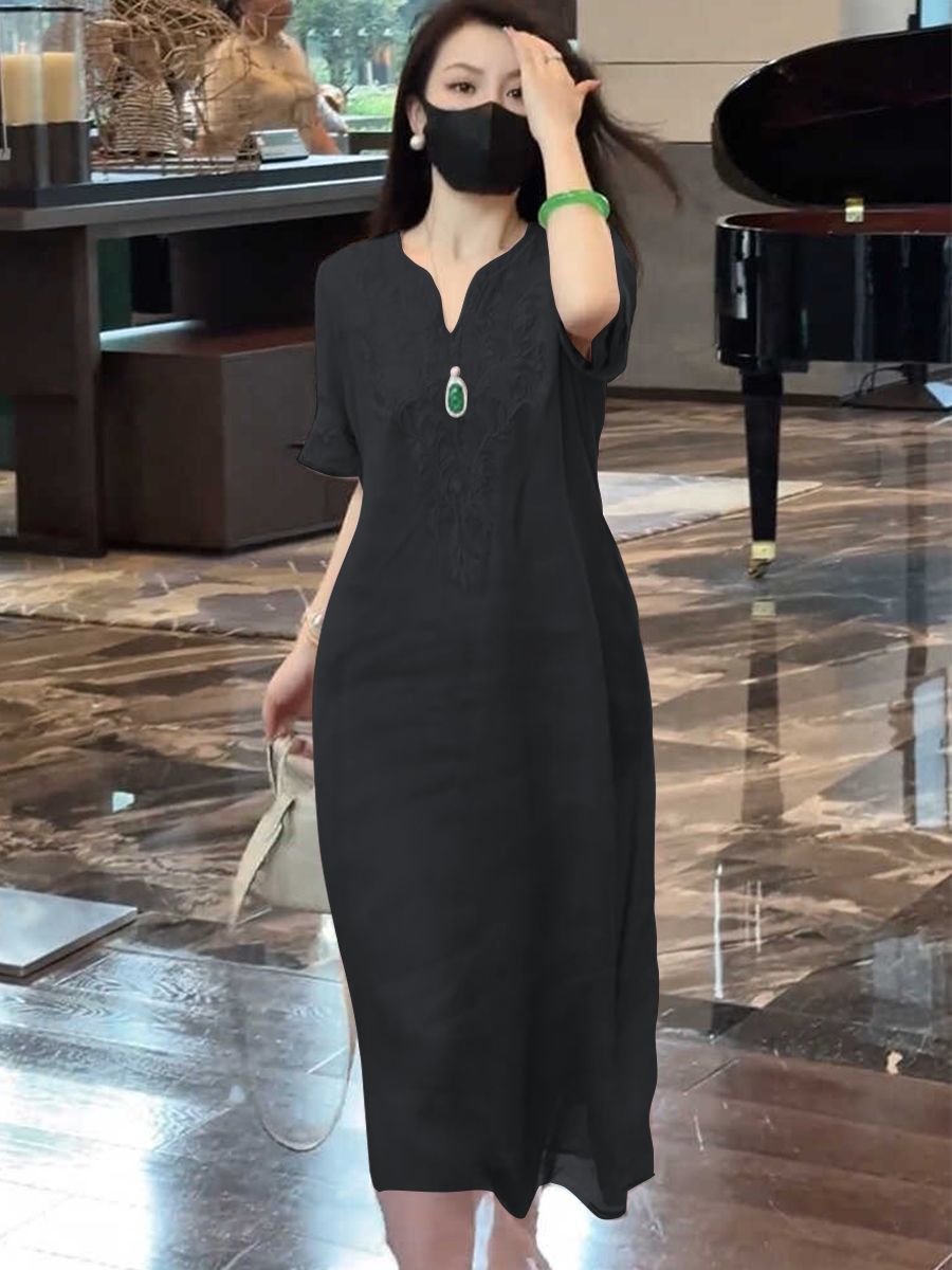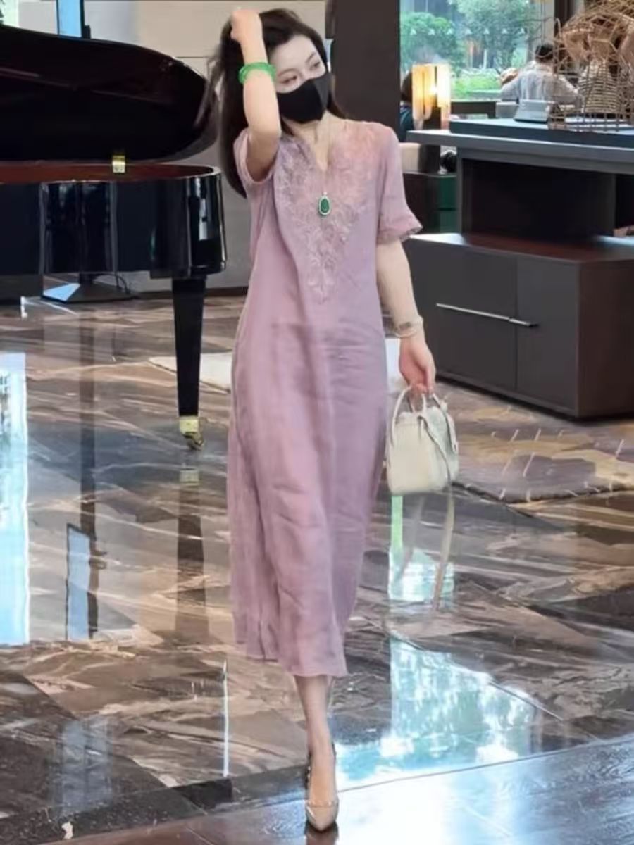2025 новый летний стиль свободная утягивающая длинная юбка новый китайский национальный стиль платье с глубоким вырезом и тяжелой вышивкой для женщин
