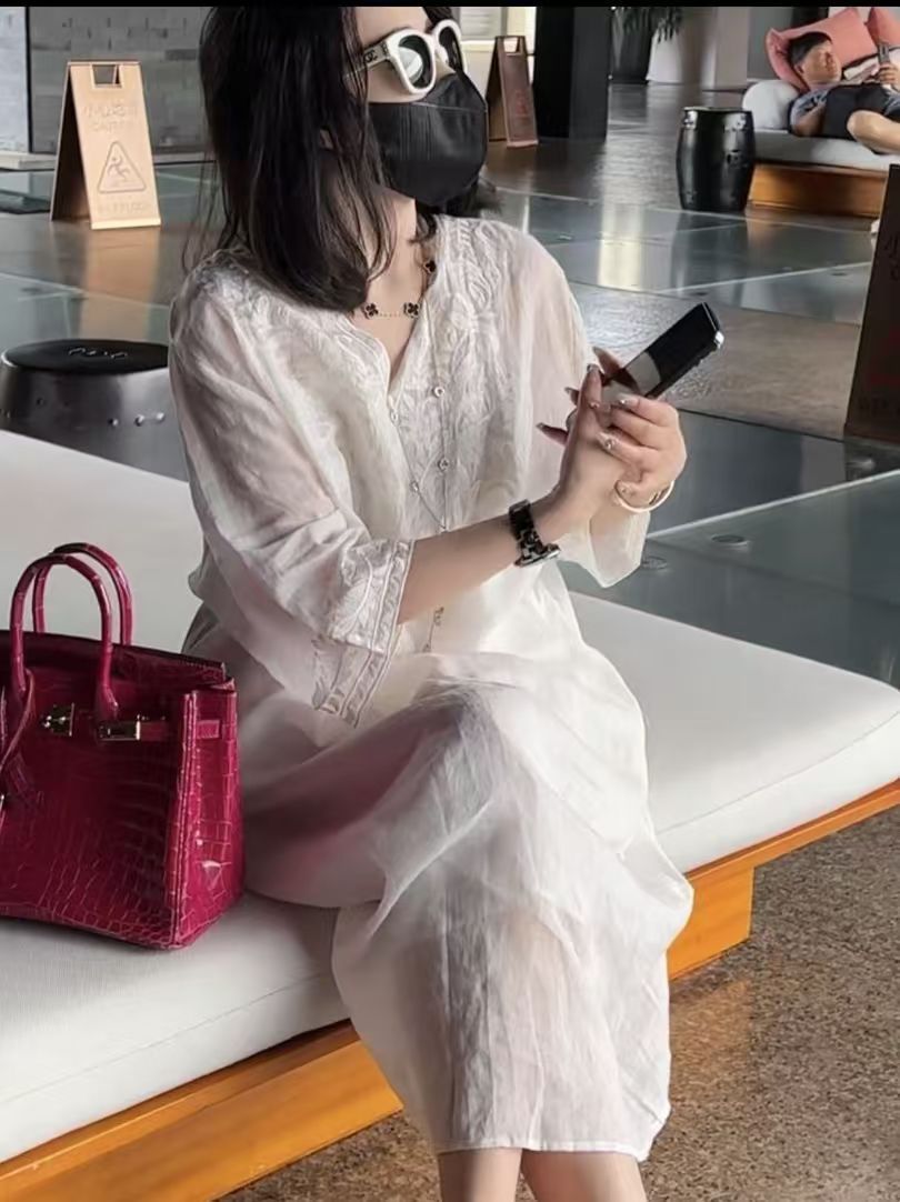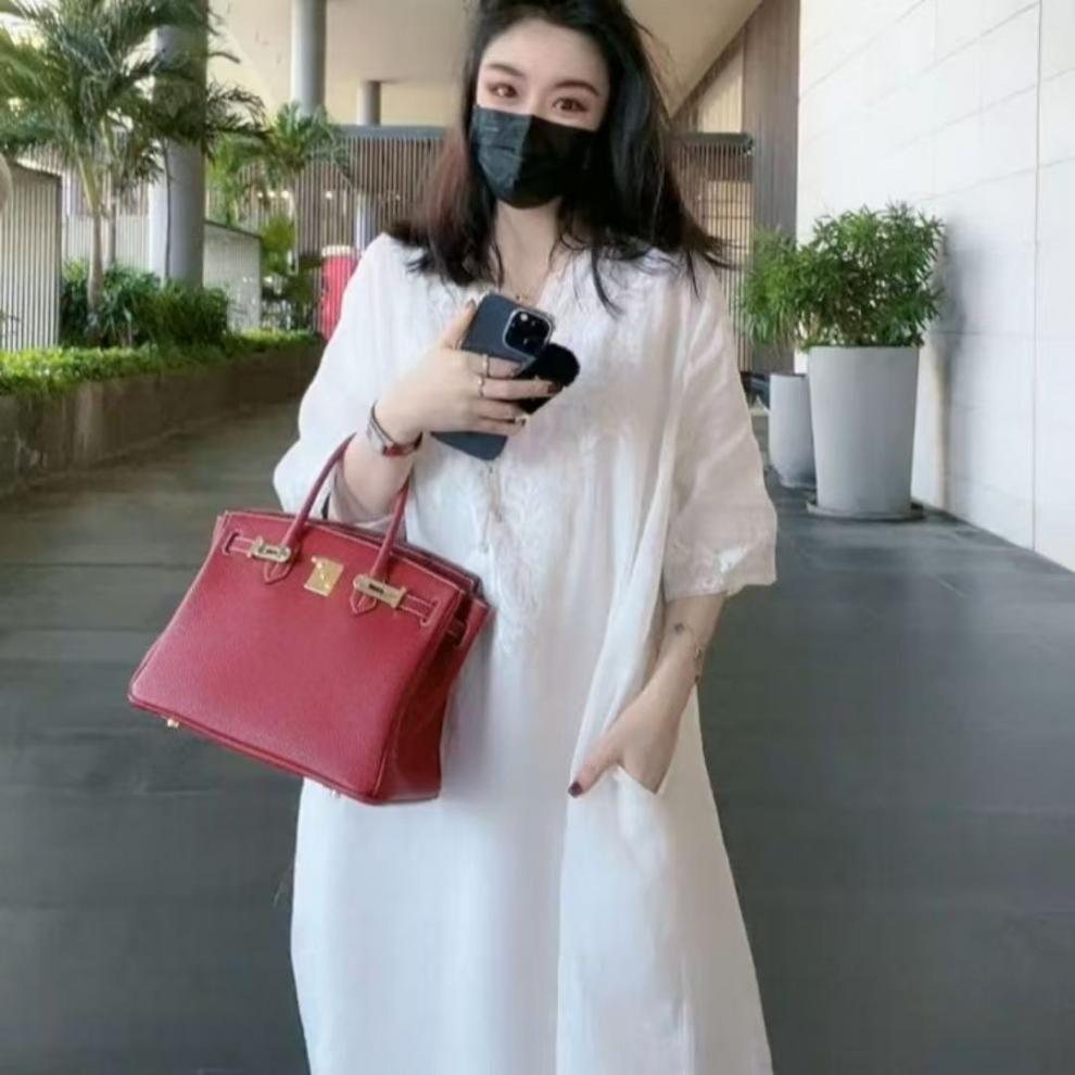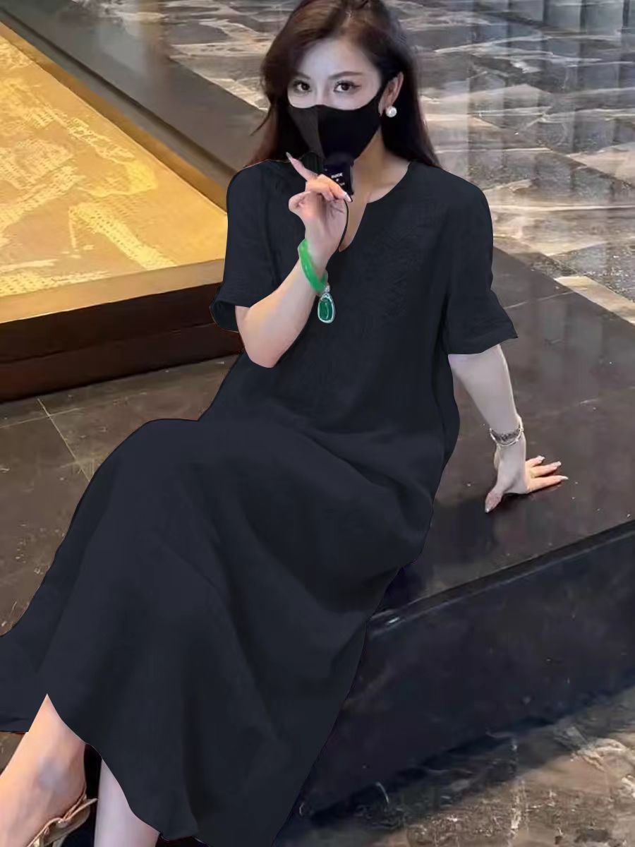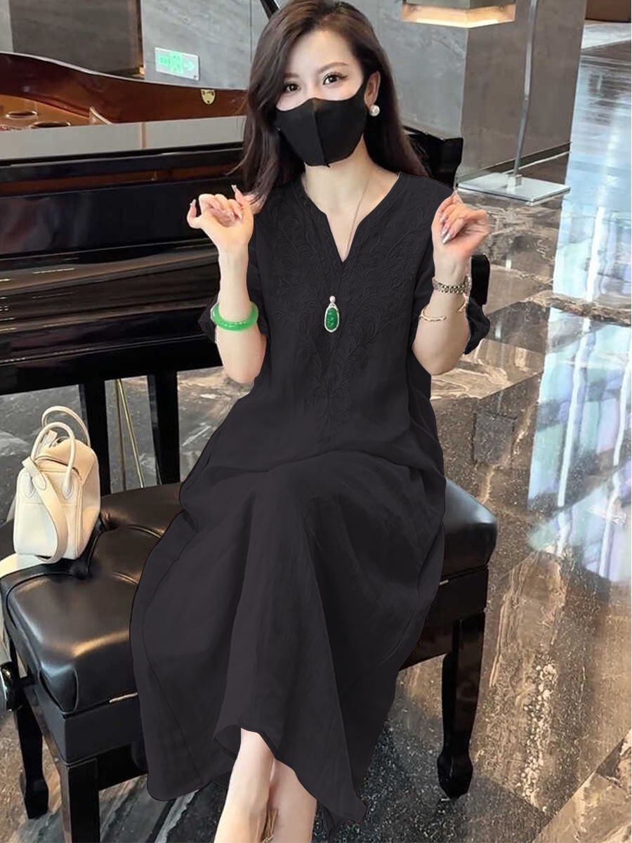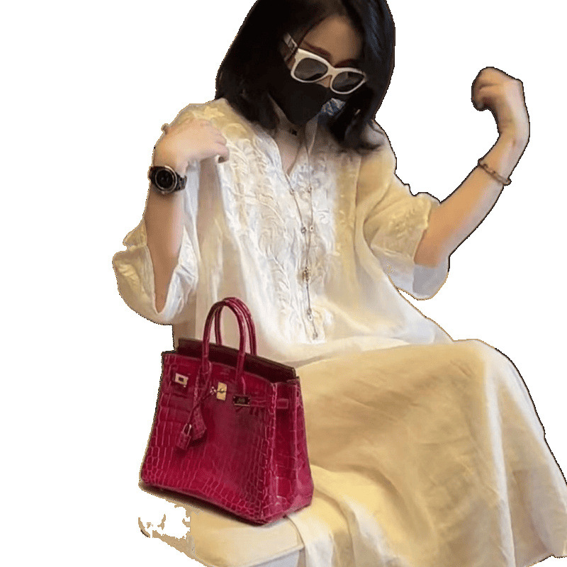 2025 новый летний стиль свободная утягивающая длинная юбка новый китайский национальный стиль платье с глубоким вырезом и тяжелой вышивкой для женщин