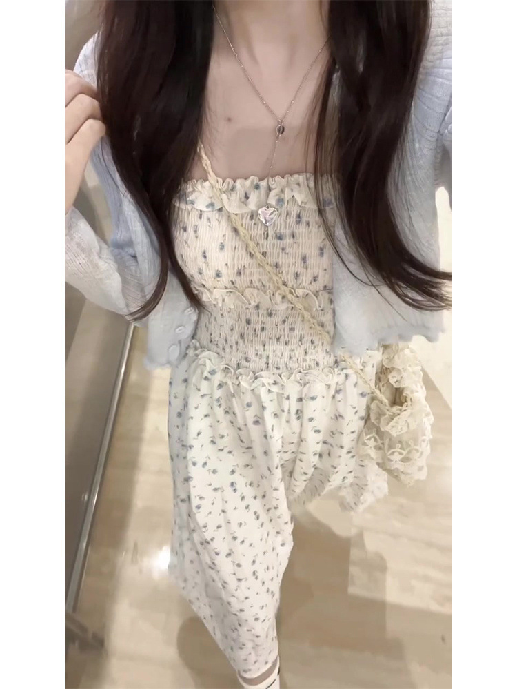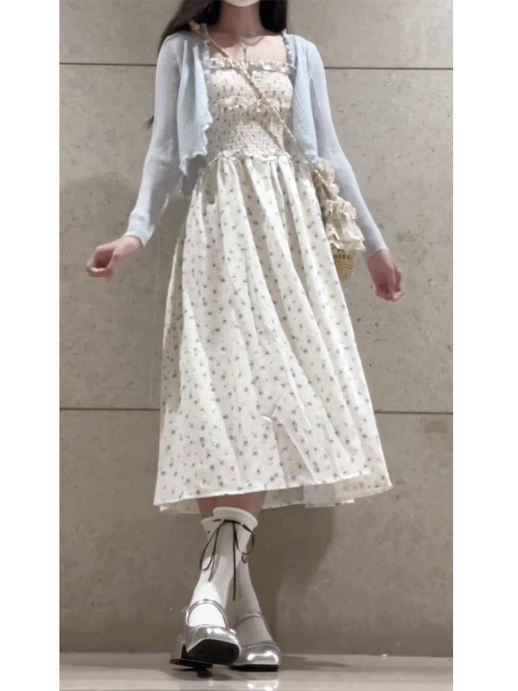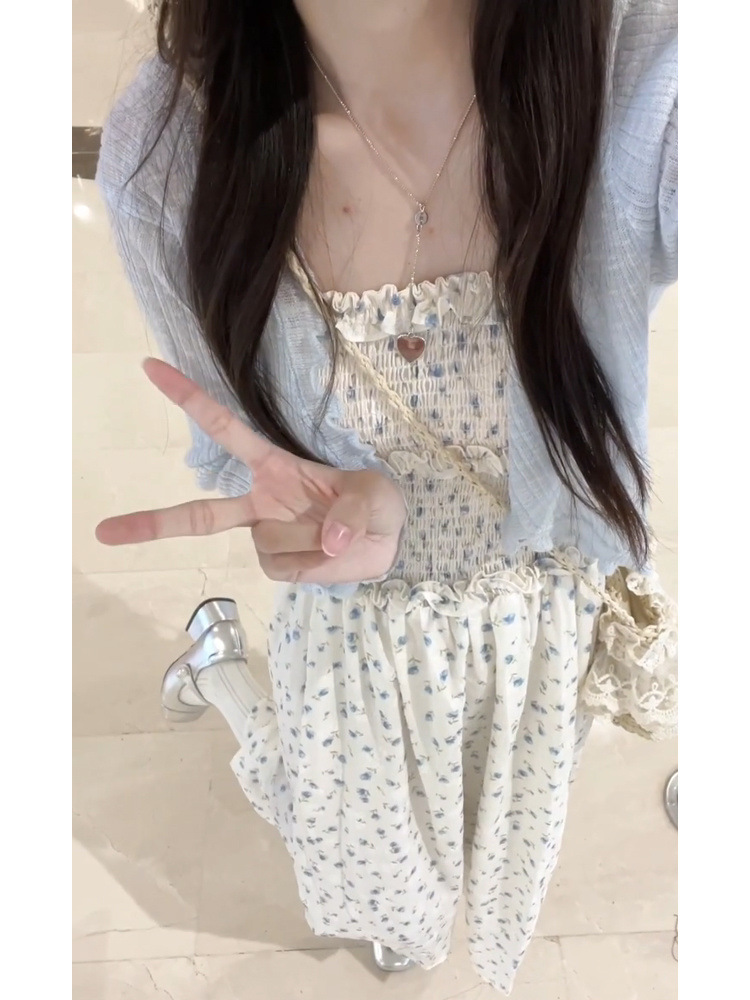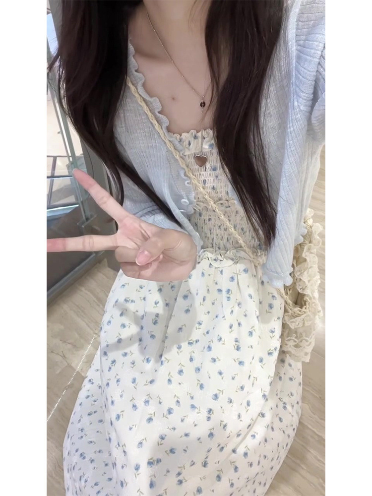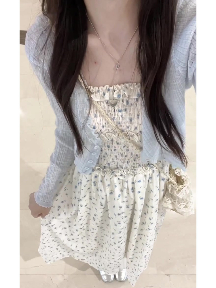 Тонкая солнцезащитная рубашка с длинными рукавами + юбка на подтяжках с цветочным принтом Комплект из двух предметов; Тонкая солнцезащитная рубашка с длинными рукавами, цельная; Цельное платье на подтяжках с цветочным принтом