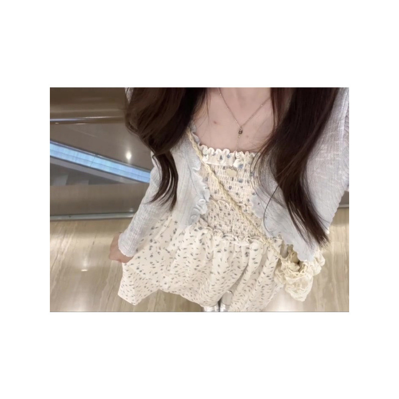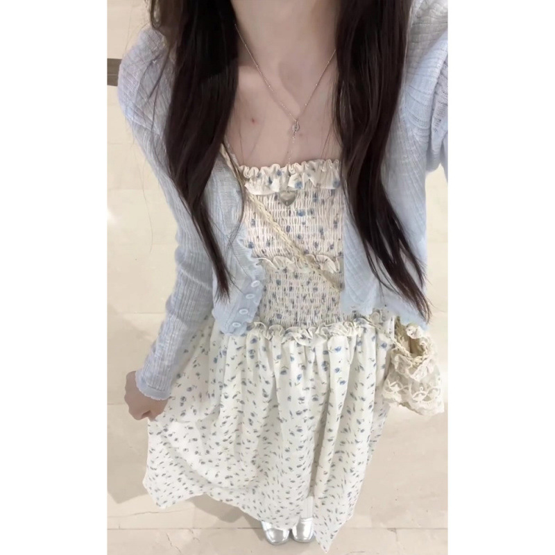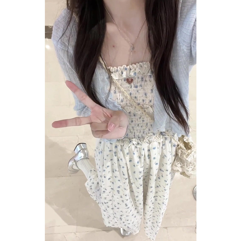Нежный и милый стильный костюм с юбкой на подтяжках с цветочным принтом для женской летней верхней одежды для поездок на работу, простая рубашка с длинными рукавами и защитой от солнца, кондиционером