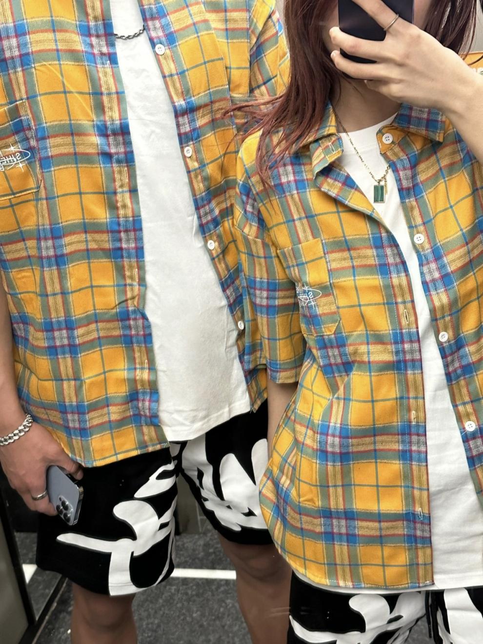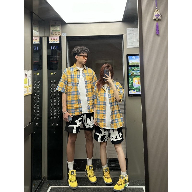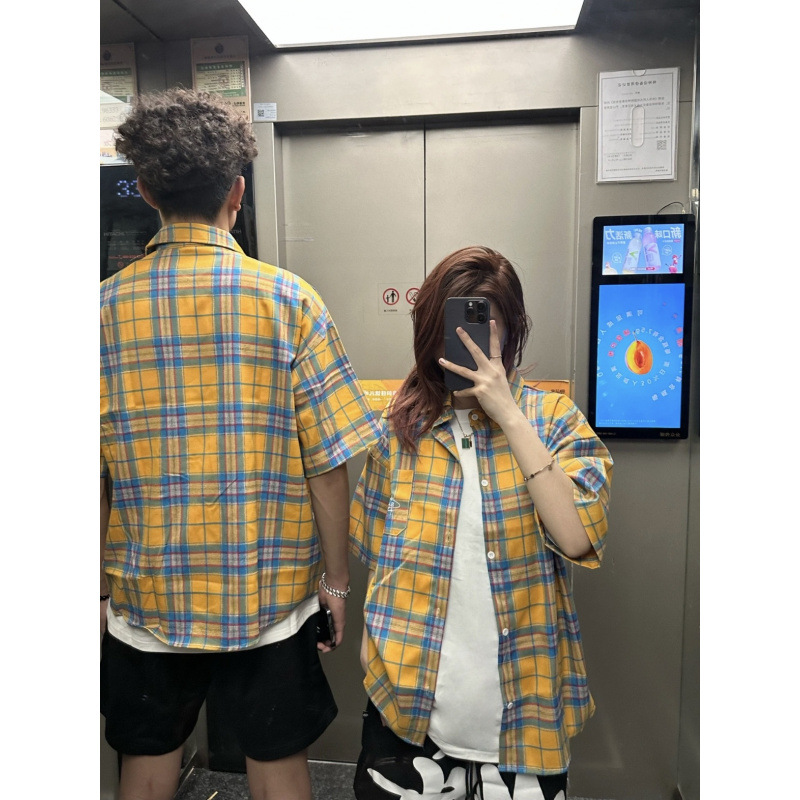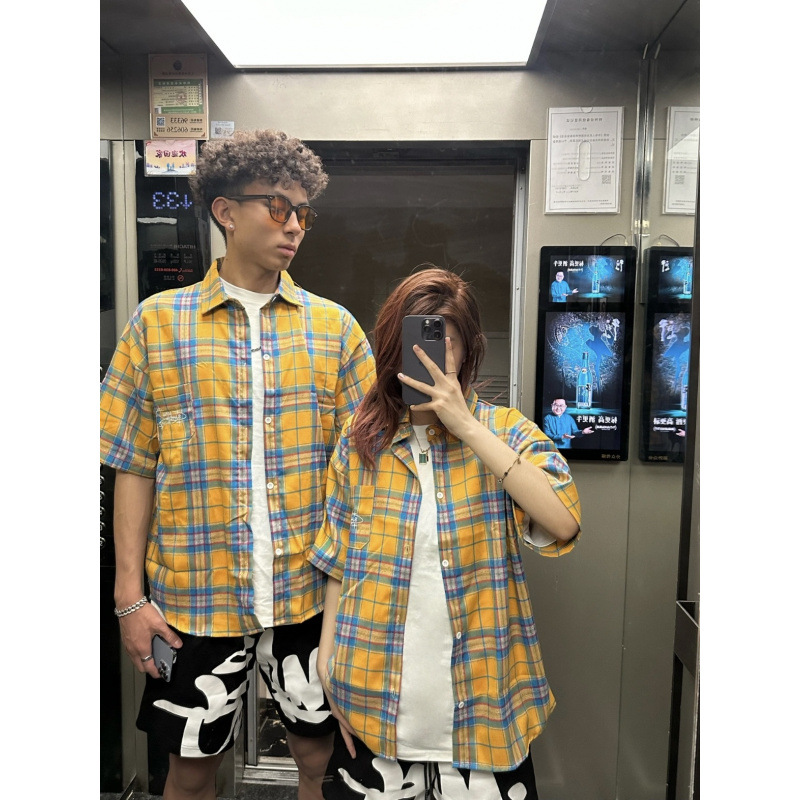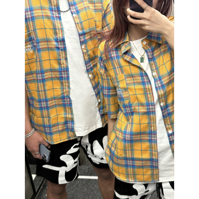 Оригинальная ткань, желтая клетчатая летняя рубашка с короткими рукавами, свободная повседневная куртка в стиле бойфренда, модный бренд