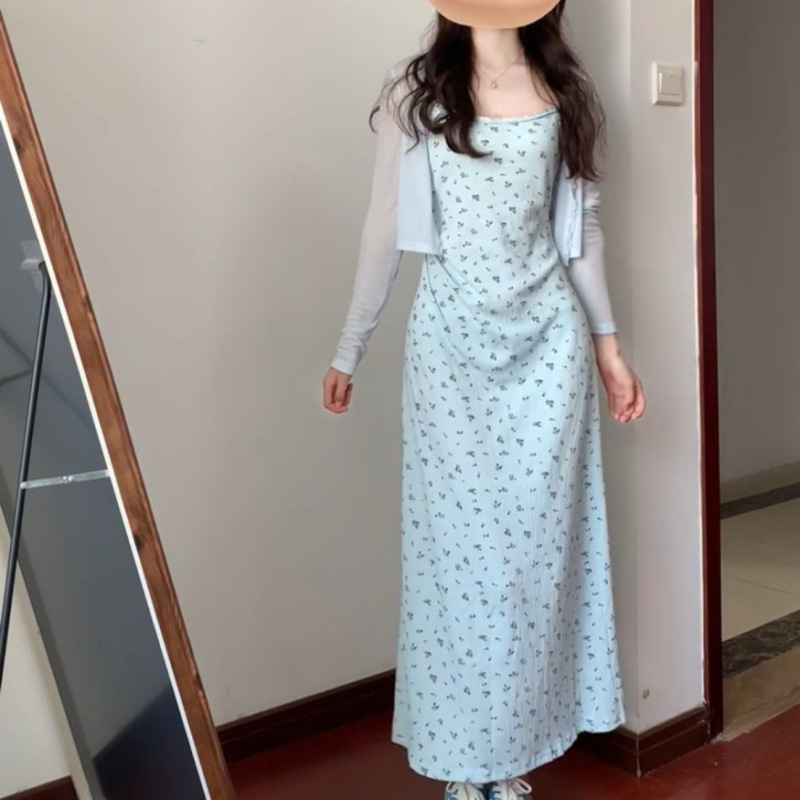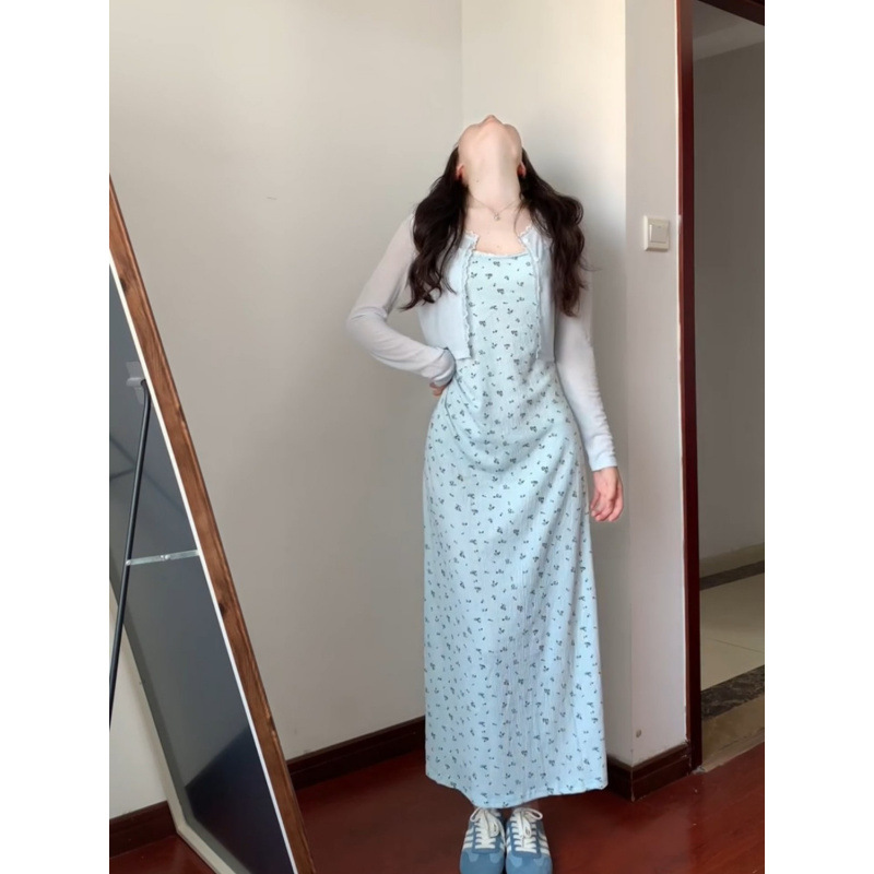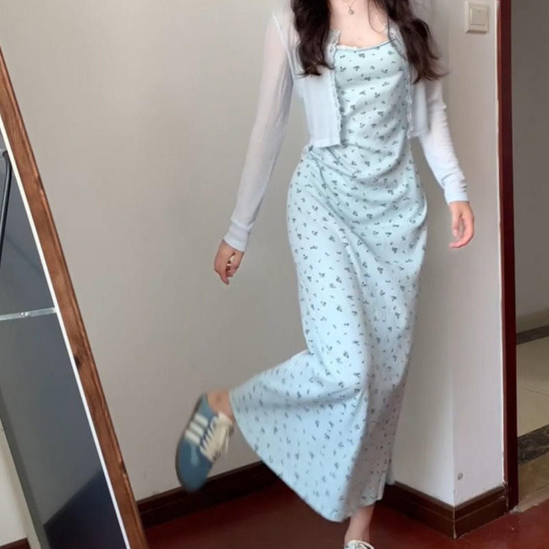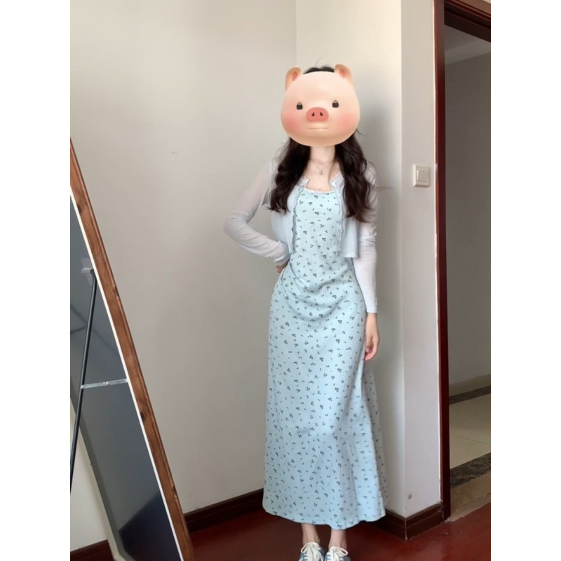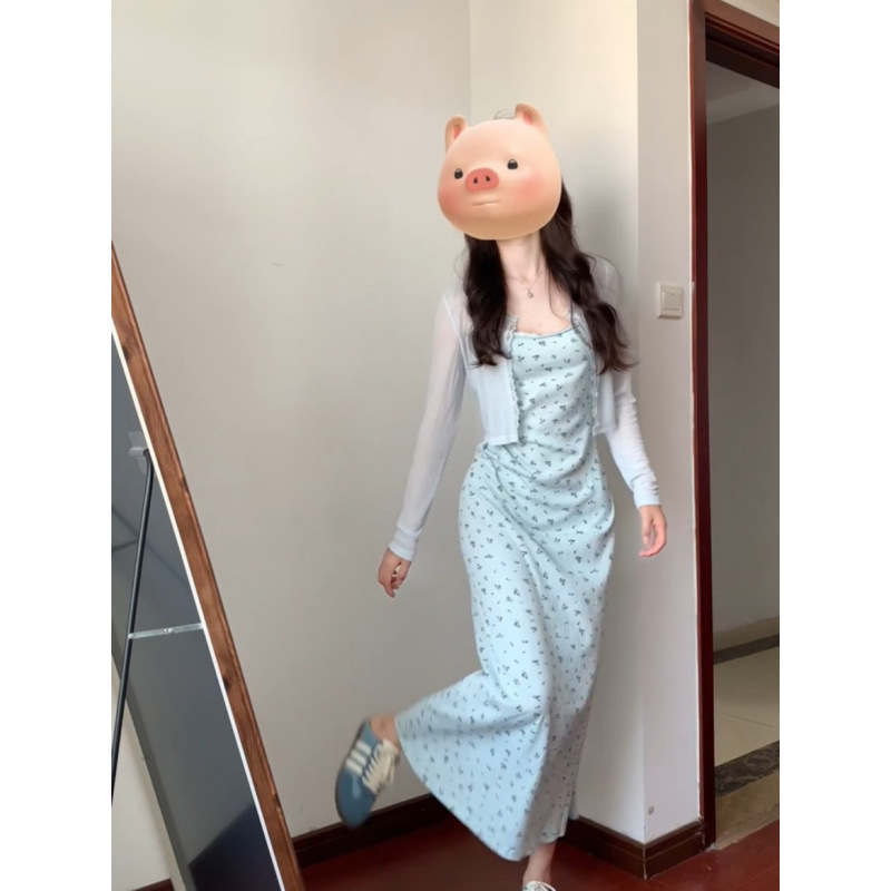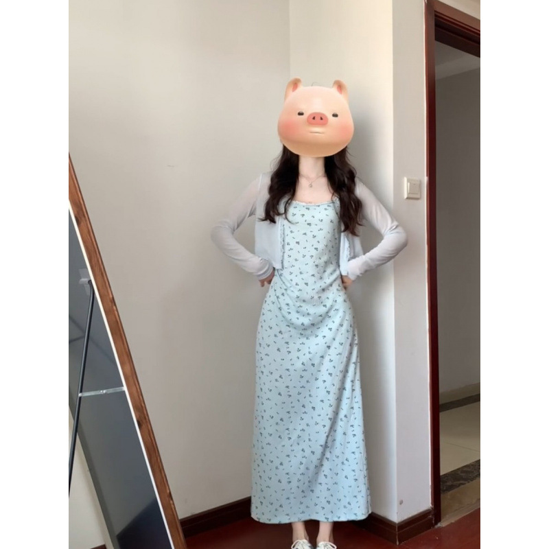 Летнее элегантное платье-миди с цветочным принтом в стиле французского трикотажа на тонких бретелях, утягивающее, коллекция 2025, чистое желание, свежий стиль.