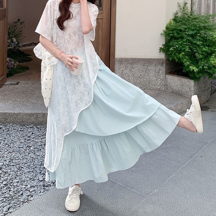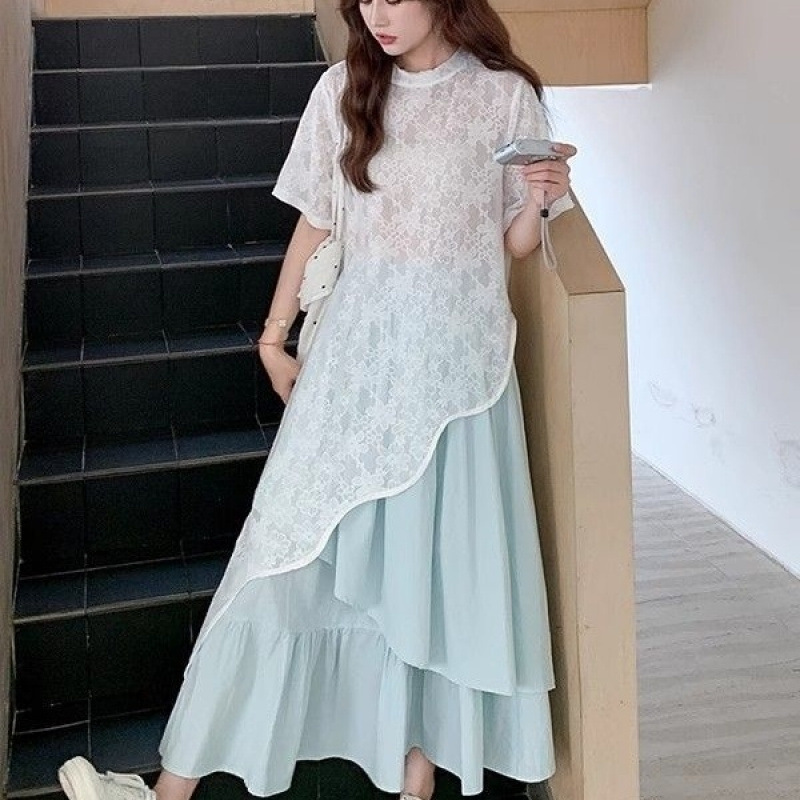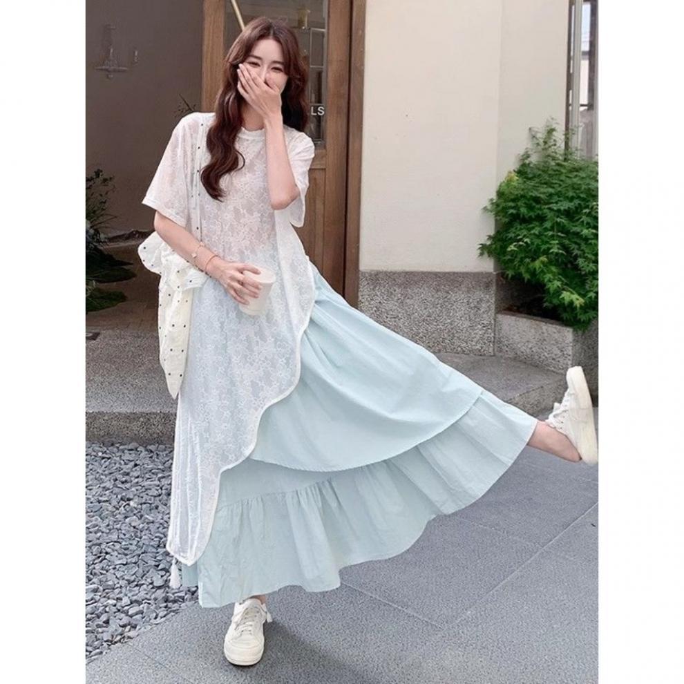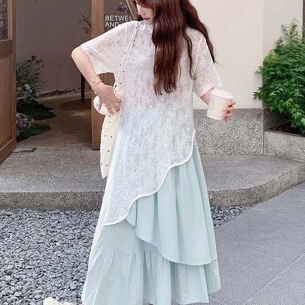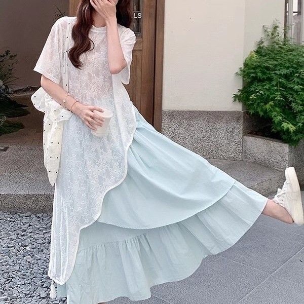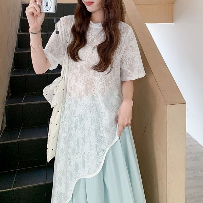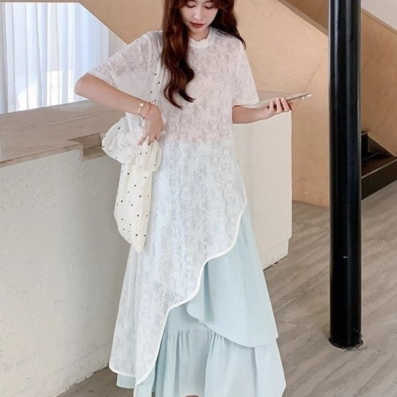 кружевной топ; юбка; Кружевные короткие рукава + юбка [костюм]