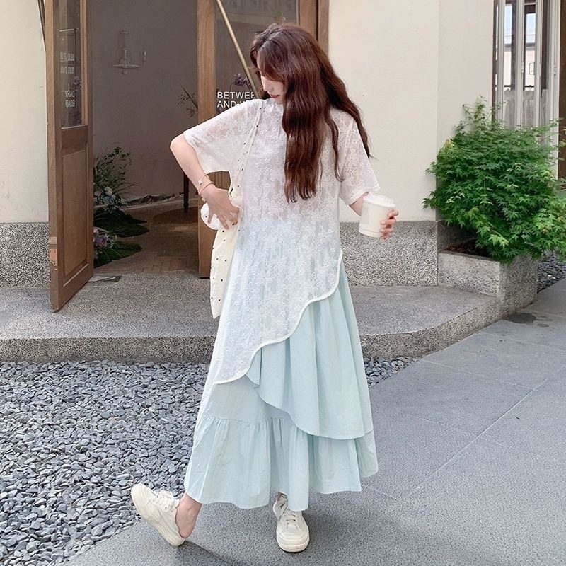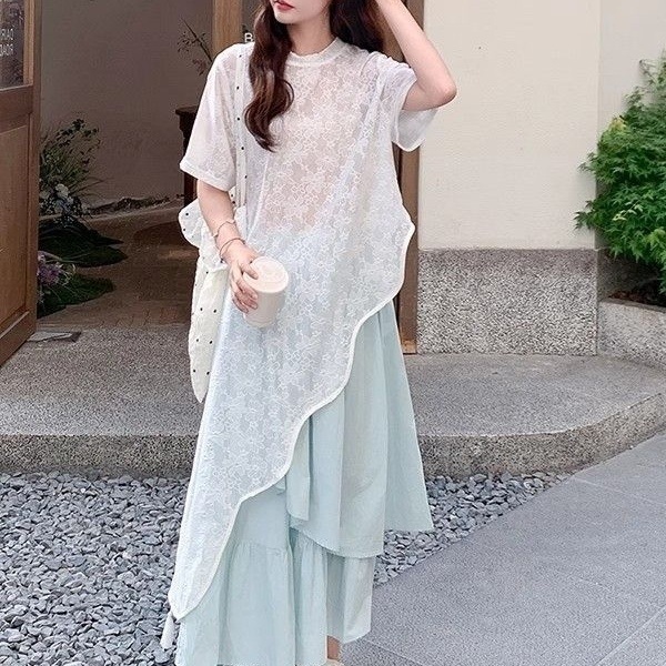 Плюс сайз асимметричный кружевной топ и юбка-платье для женщин 2025 лето новый комплект для стройности