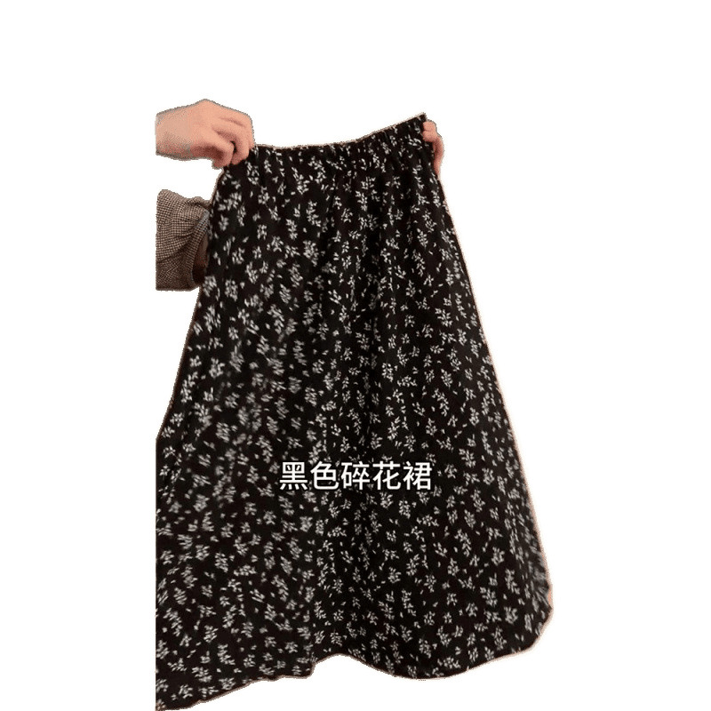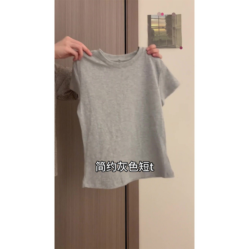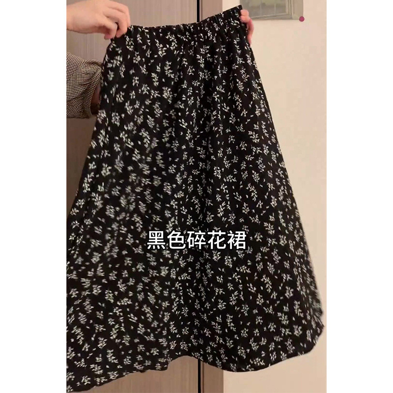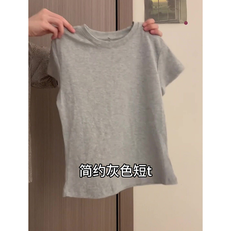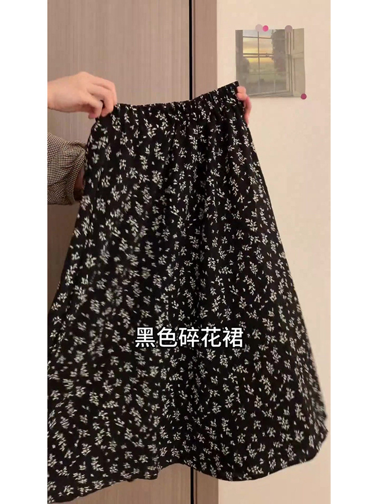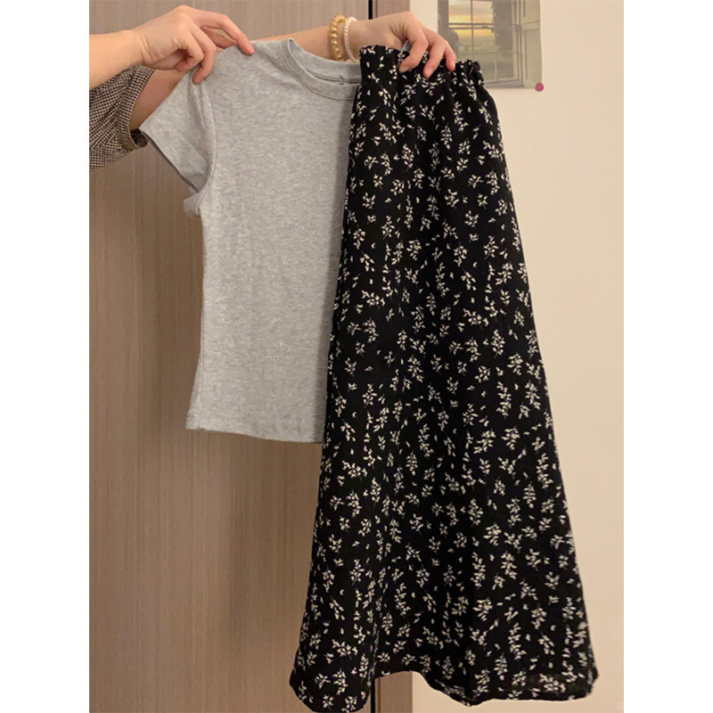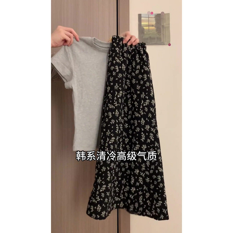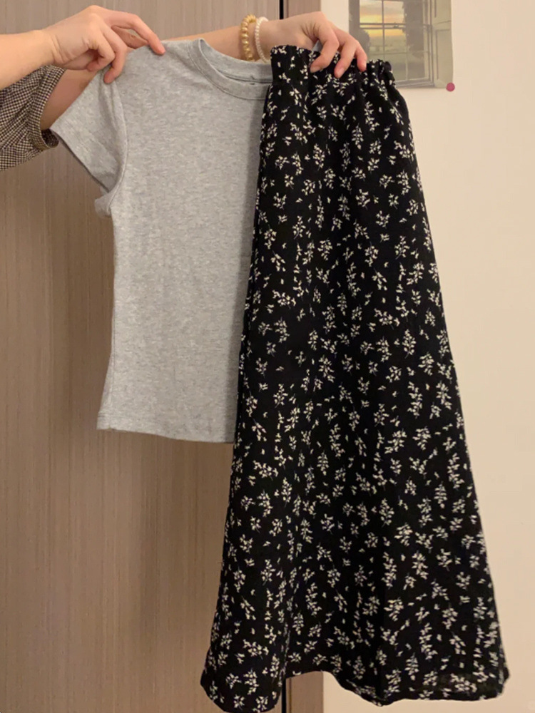 Футболка с короткими рукавами и круглым вырезом чистого цвета + юбка с цветочным принтом, комплект из двух предметов; Однотонная футболка с короткими рукавами и круглым вырезом на правом плече, цельная (готова на складе); Цельная юбка с эластичной талией и цветочным принтом