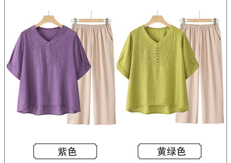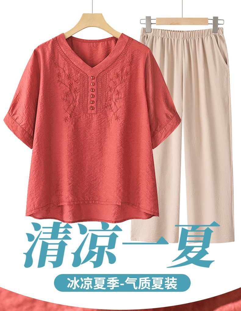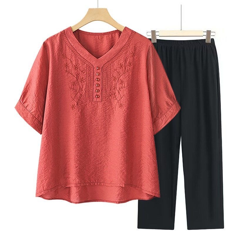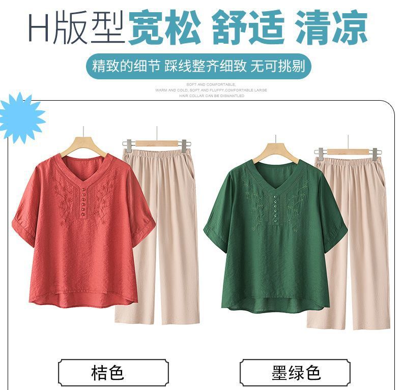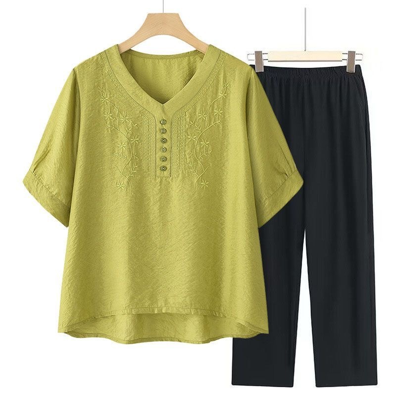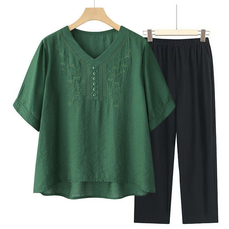 2025 Новый модный костюм Женская футболка с вышивкой Одежда для женщин среднего и пожилого возраста Двухкомплектный набор