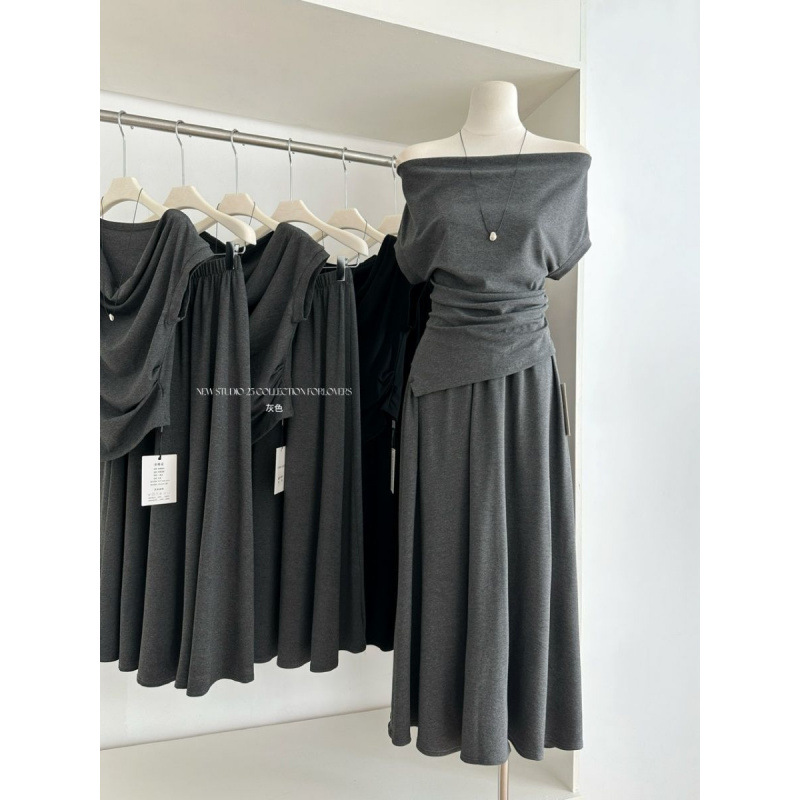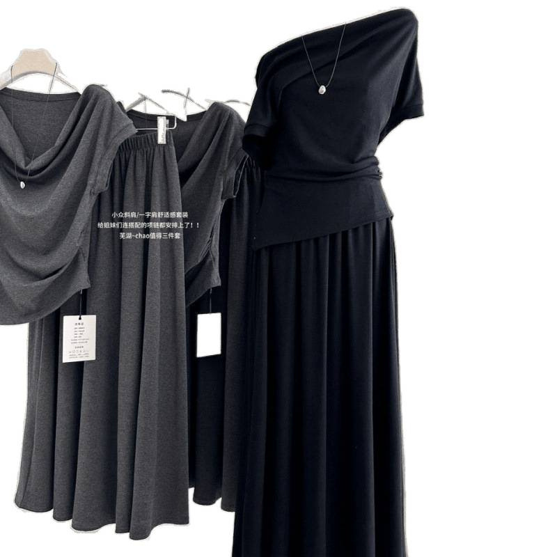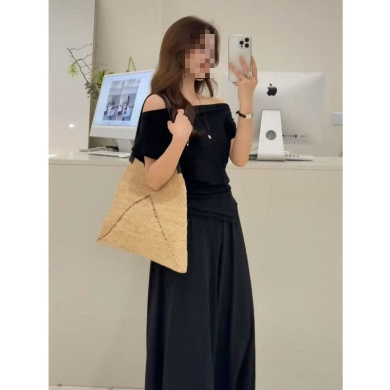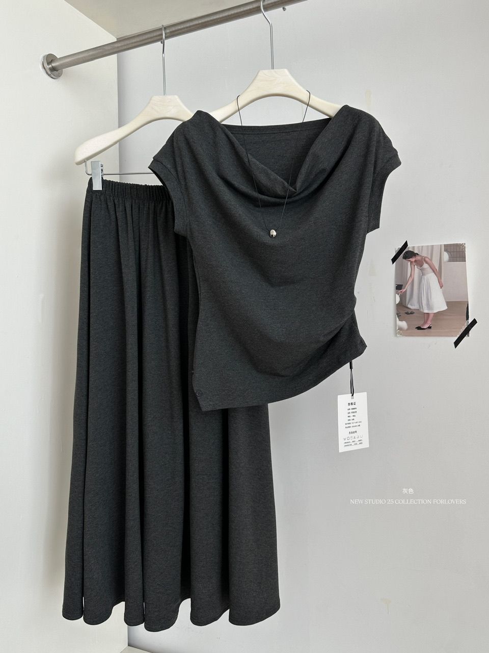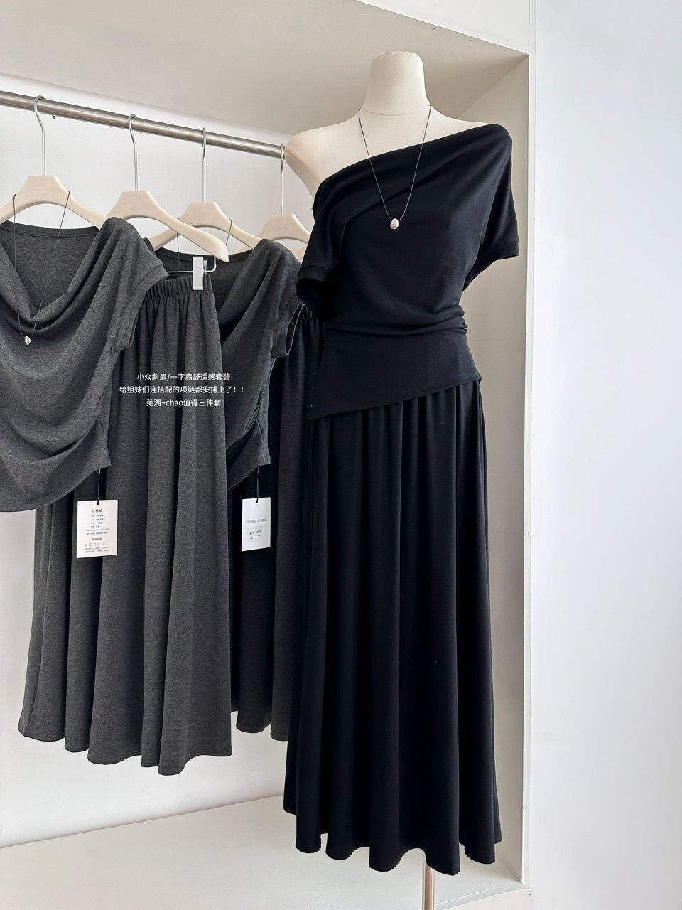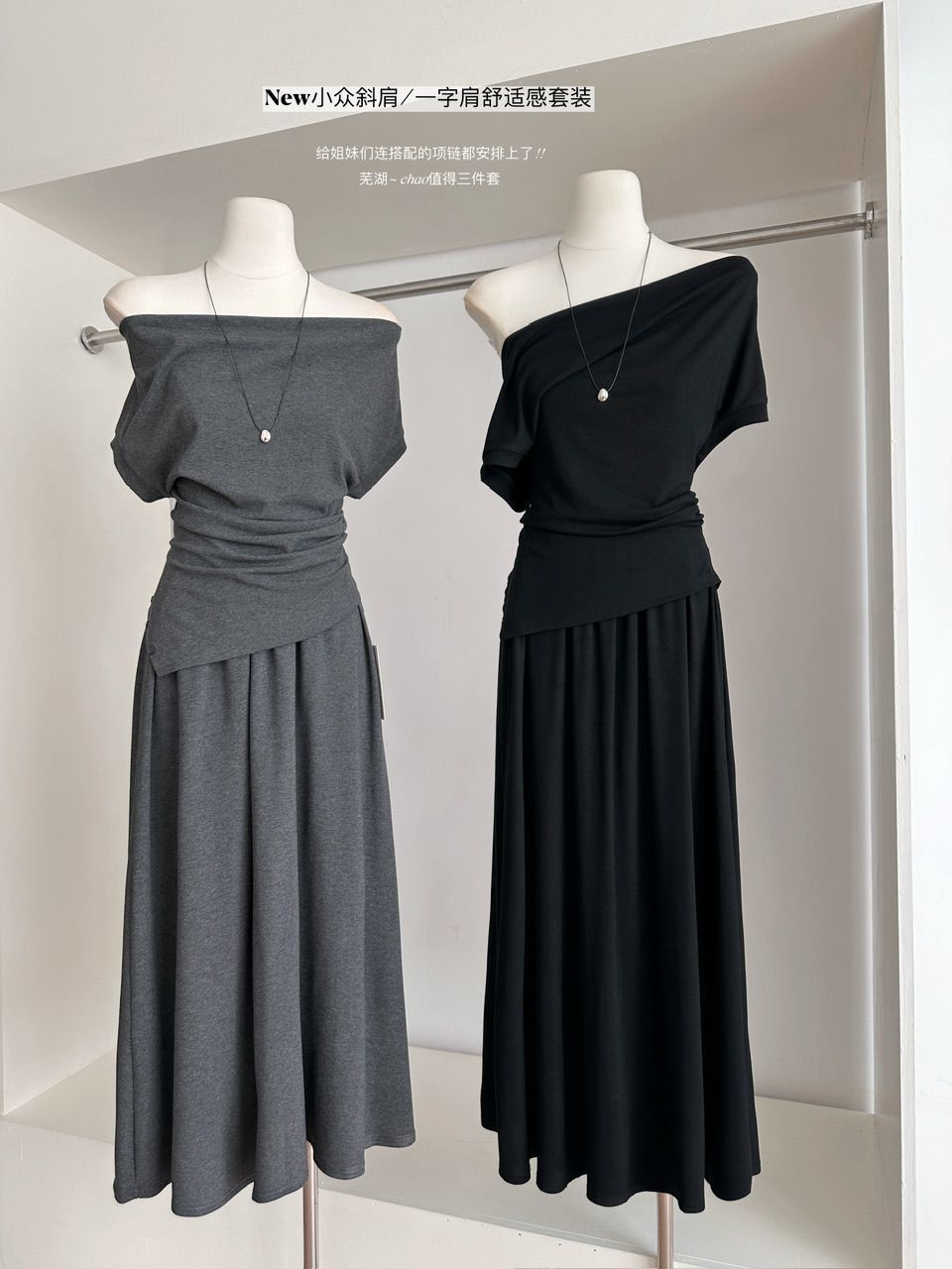 Летний корейский стиль: элегантный топ с косым плечом и многофункциональной поясной лентой + юбка с высокой талией в комплекте