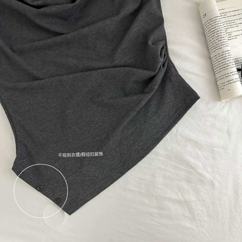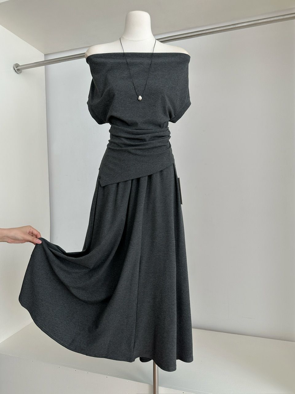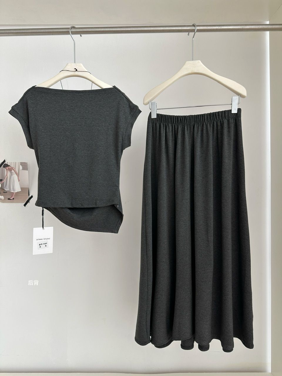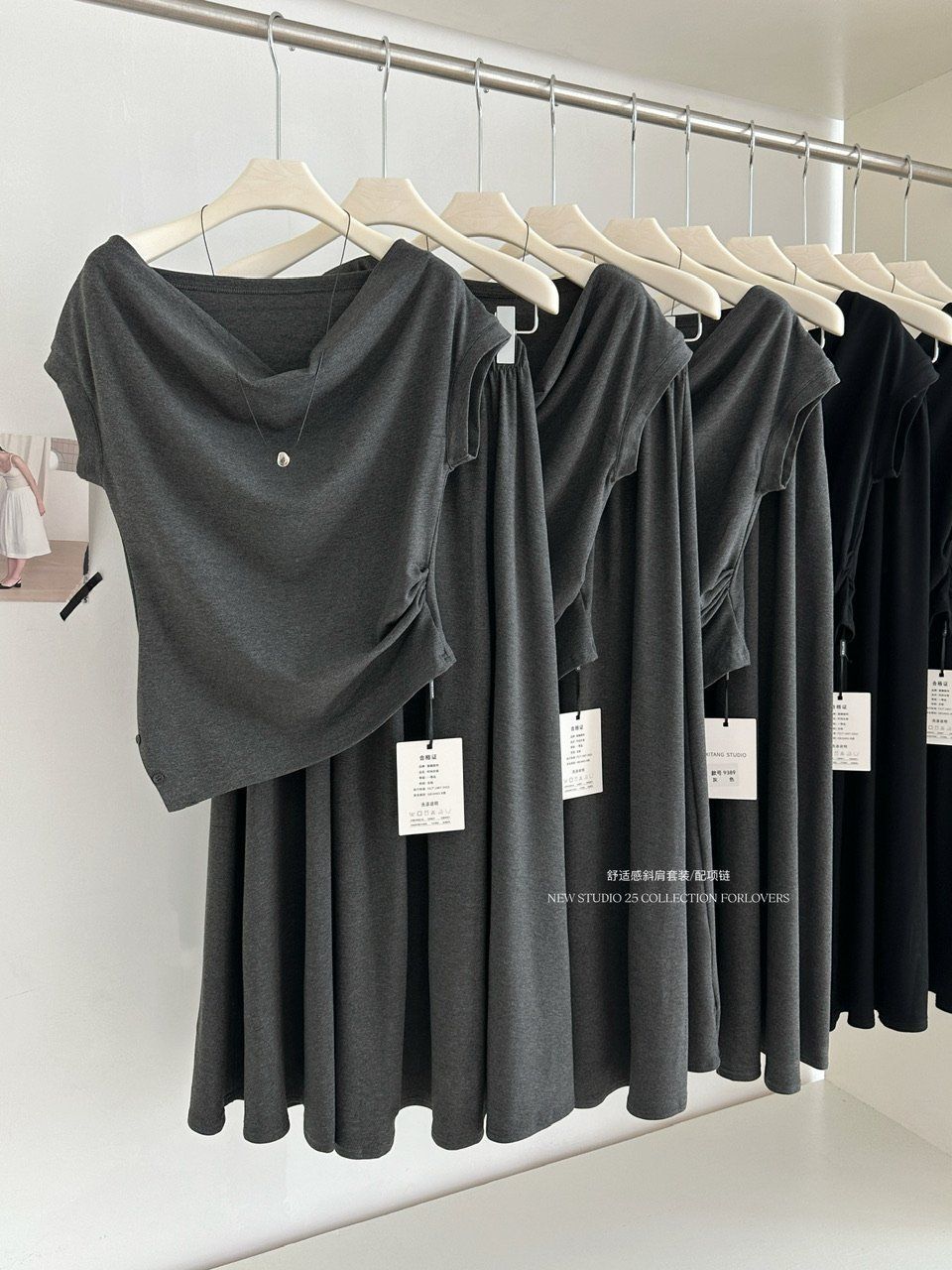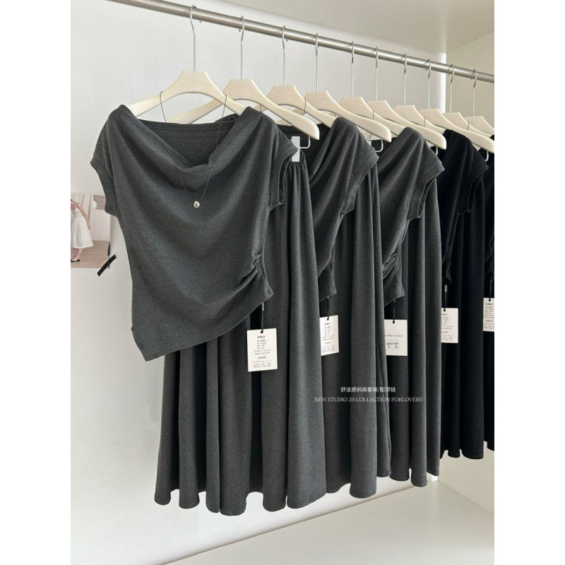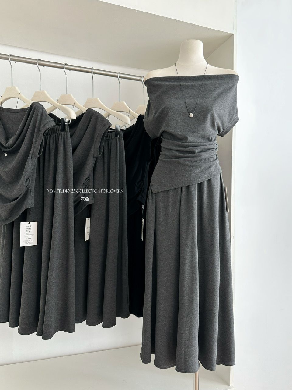 Летний корейский стиль: элегантный топ с косым плечом и многофункциональной поясной лентой + юбка с высокой талией в комплекте