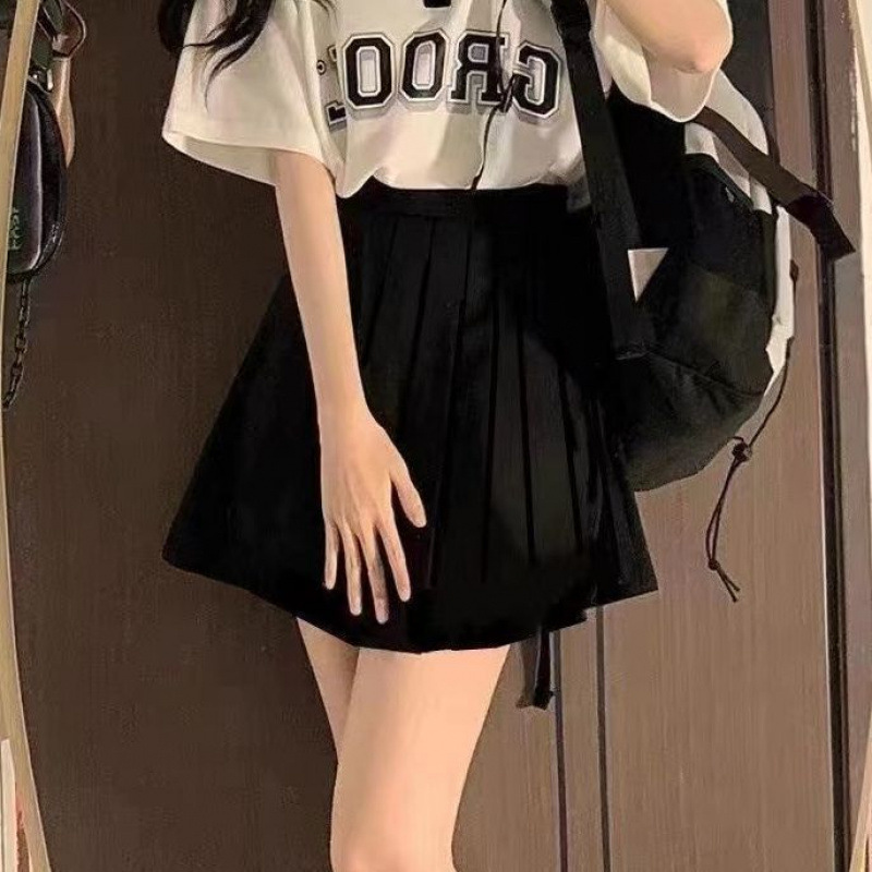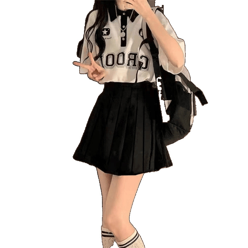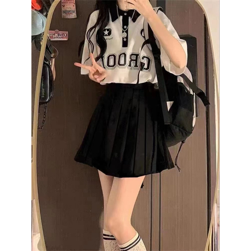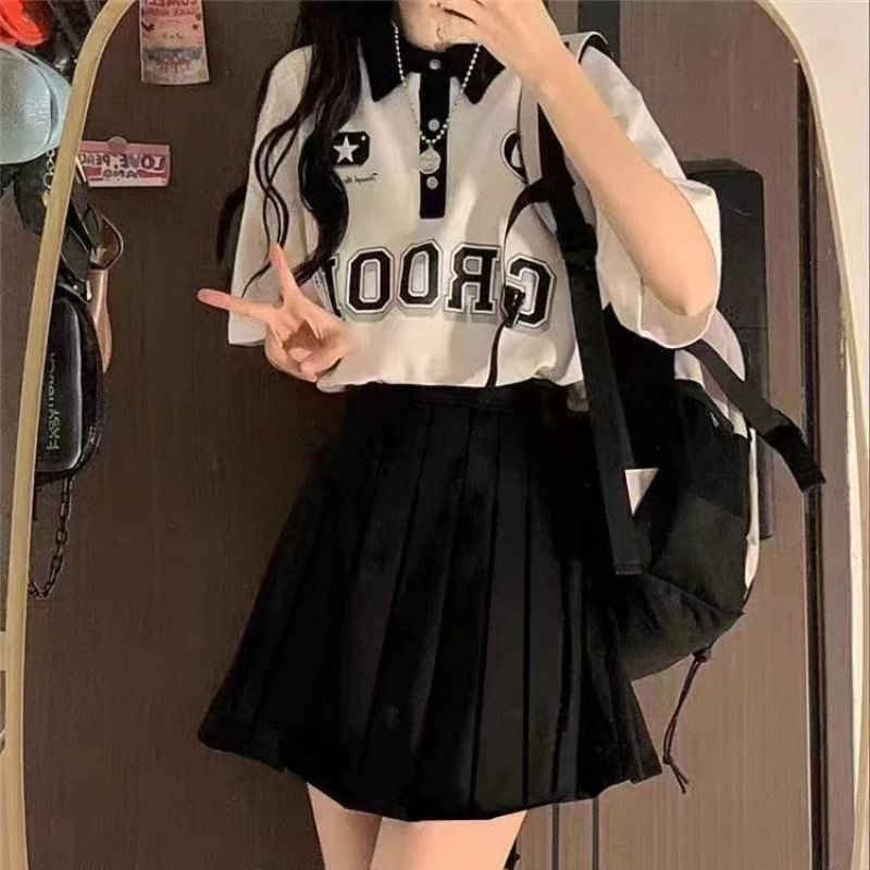 Белый воротник-поло-отбеливание [высокое качество]; Черная плиссированная юбка на подкладке [высокое качество]; Белый воротник поло + черная плиссированная юбка [высокое качество
