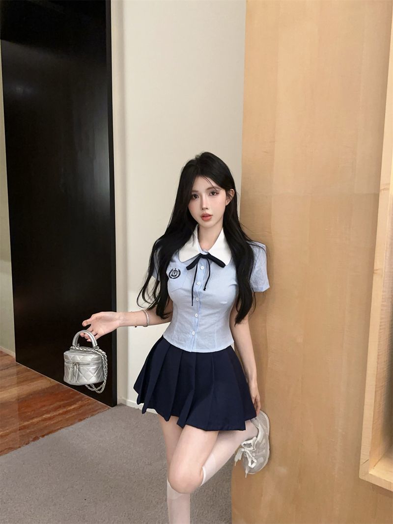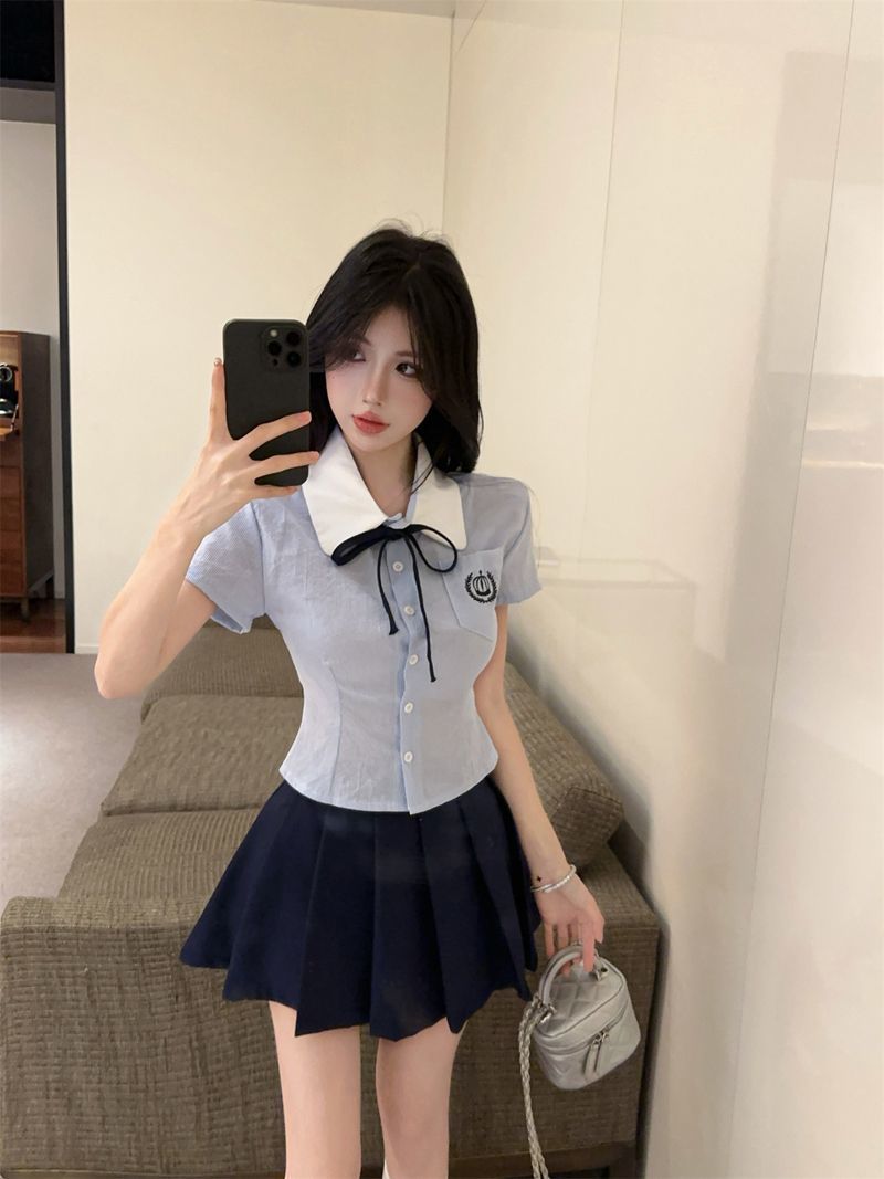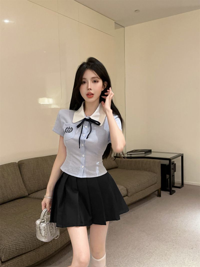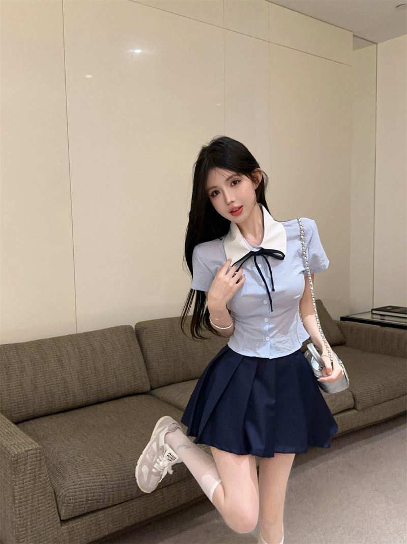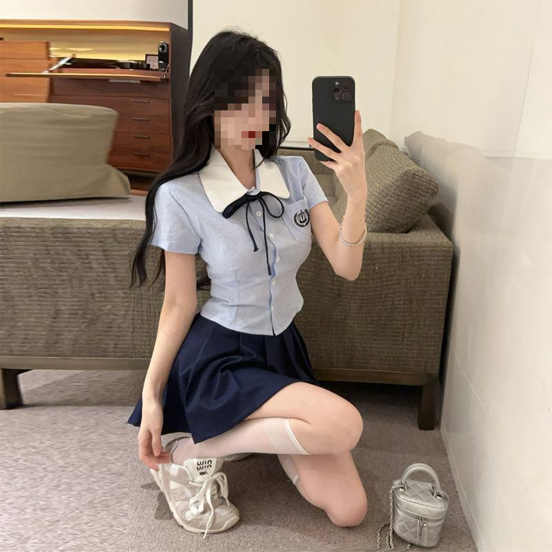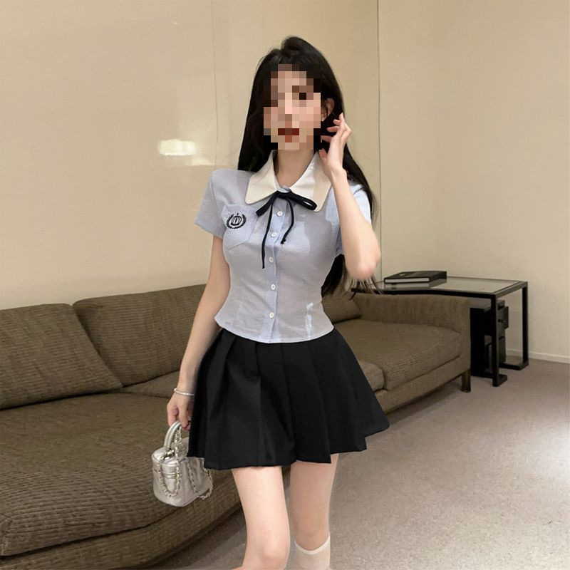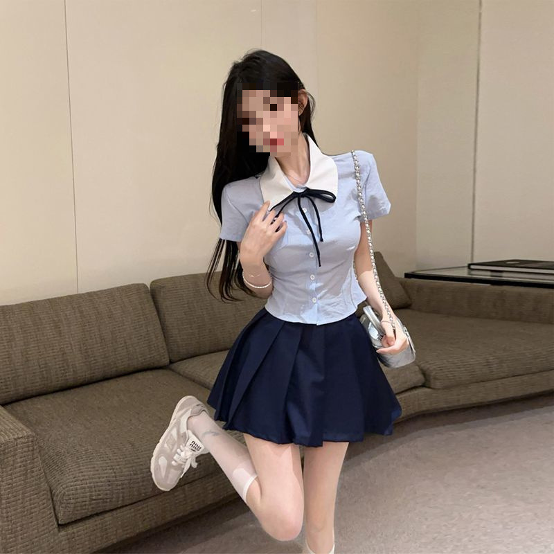 Летний костюм для женщин 2025 года: топ-рубашка для старшей сестры, юбка-плиссе, укороченный костюм JK, короткий рукав, премиум-класса, двухкомпонентный комплект.