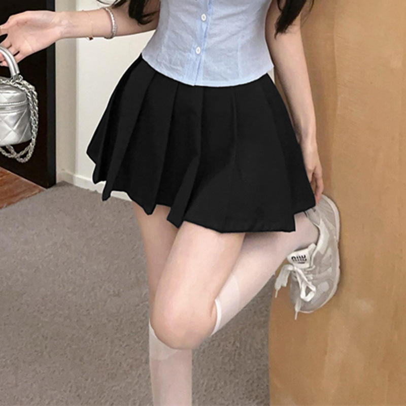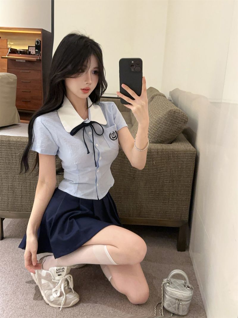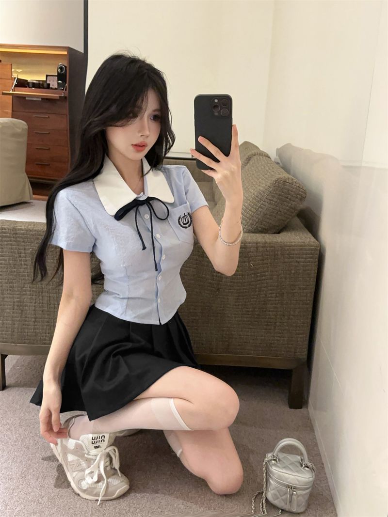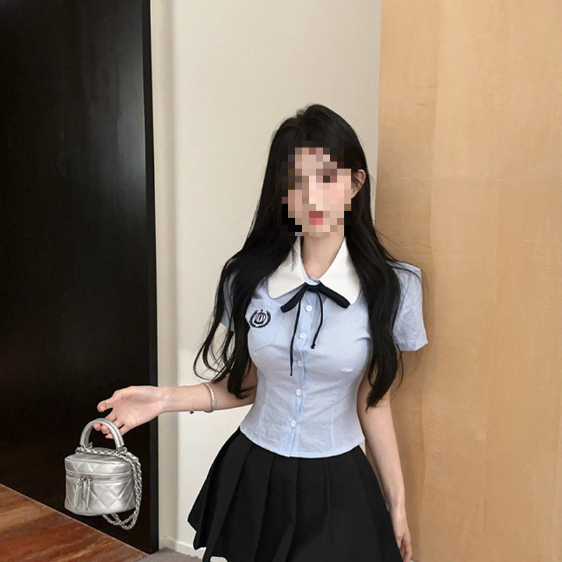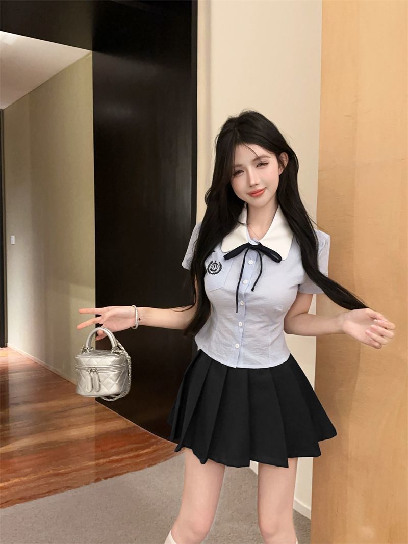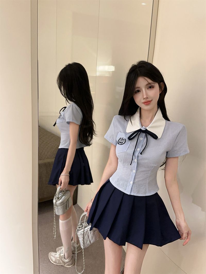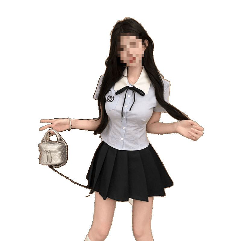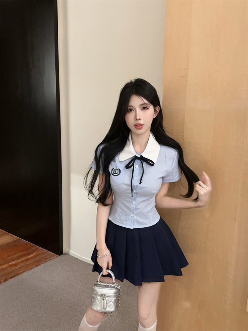 Летний костюм для женщин 2025 года: топ-рубашка для старшей сестры, юбка-плиссе, укороченный костюм JK, короткий рукав, премиум-класса, двухкомпонентный комплект.