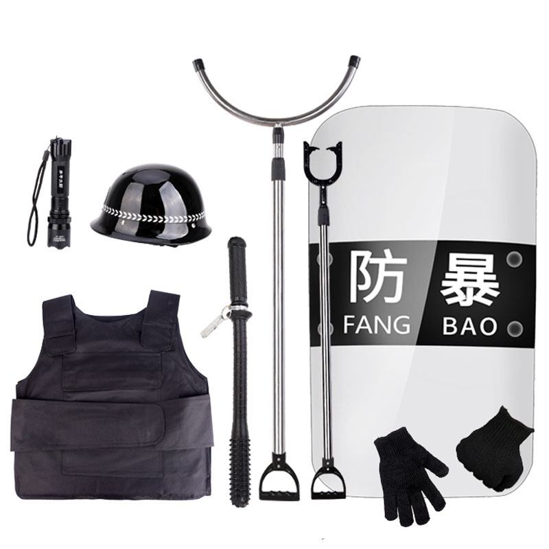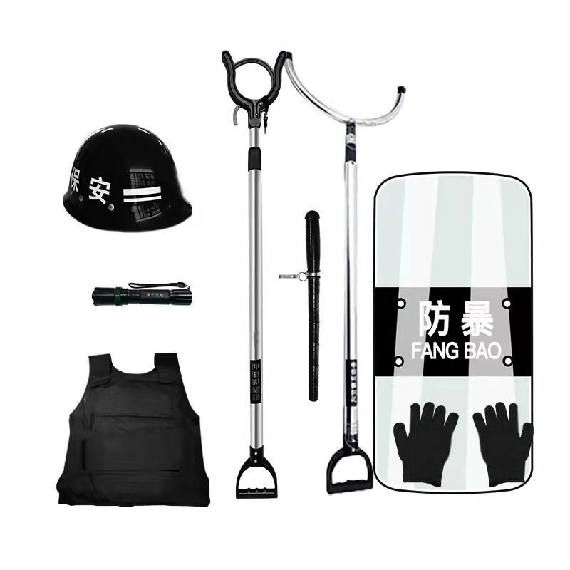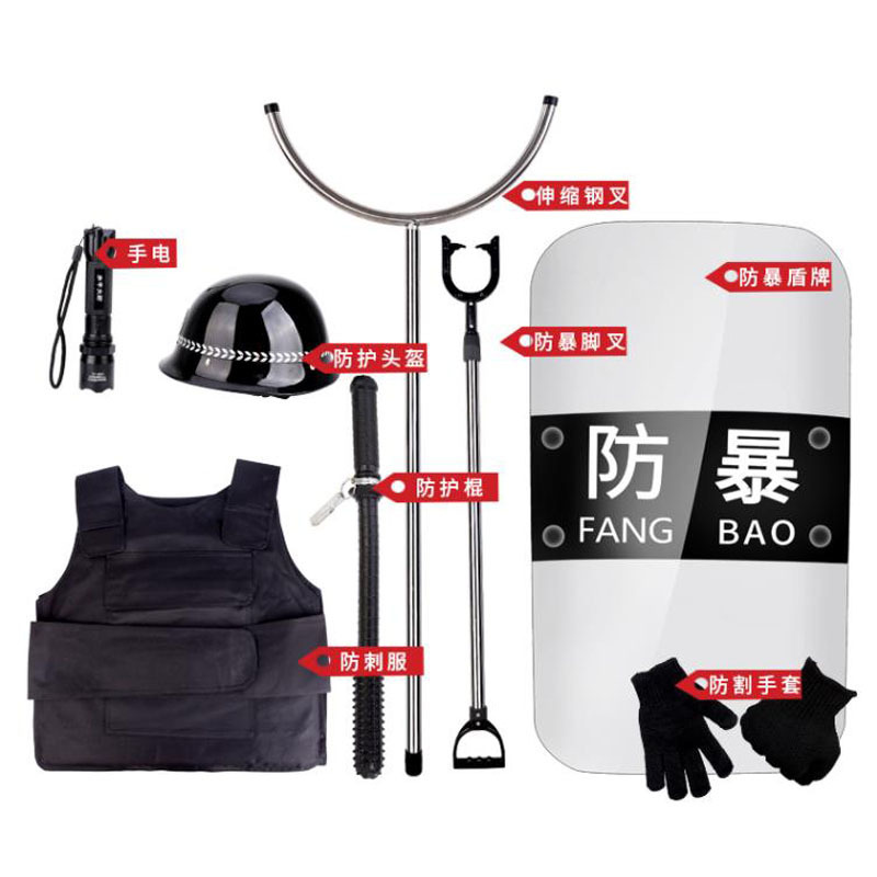 Комплект из восьми предметов для обеспечения безопасности школы, противорiotный и взрывозащищенный щит, стальной вилочный шлем, противоударный костюм, средства обеспечения безопасности.