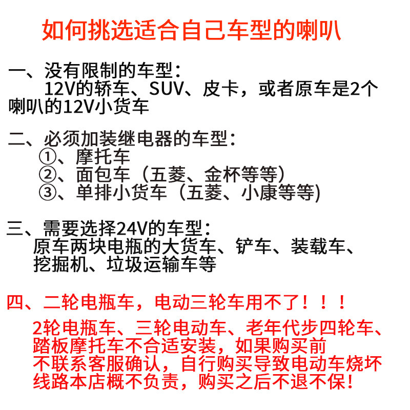 Одиночный твитер 12 В [алюминиевый провод] имеет громкий и резкий звук.; Одиночный бас 12 В [алюминиевый провод], приглушенный звук громче высоких частот; Одиночный твитер 12 В [медный провод] имеет громкий и резкий звук.; Одиночный бас 12 В [медный провод], приглушенный звук громче высоких частот; Одиночный твитер 24 В [для 2 батарей]; Одиночный бас 24 В [для 2 батарей]; Пара высоких и низких басов 12 В [алюминиевый провод]; Пара высоких и низких басов 12 В [медный провод] Звук Audi; Высокая и низкая пара 24 В [для 2 батарей]; Пара 12 В + вилка (модель + год выпуска); Пара улиток с большим ртом на 24 В.; Пара высоких и низких басов 12 В [медный провод] с реле