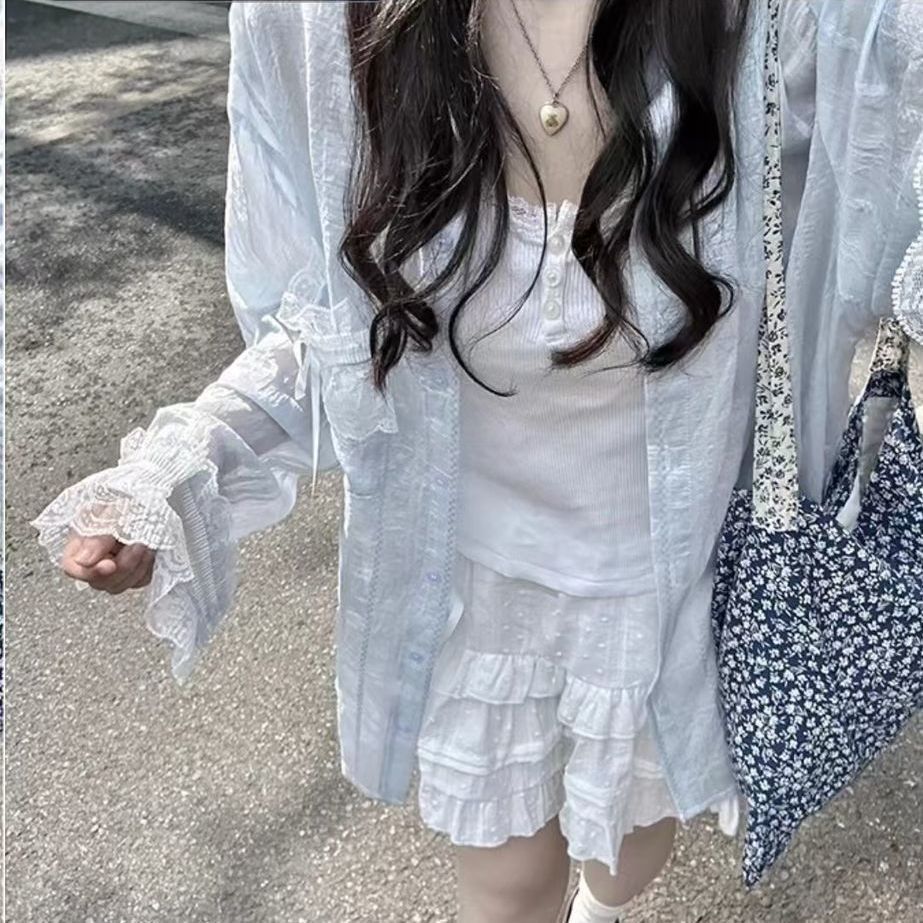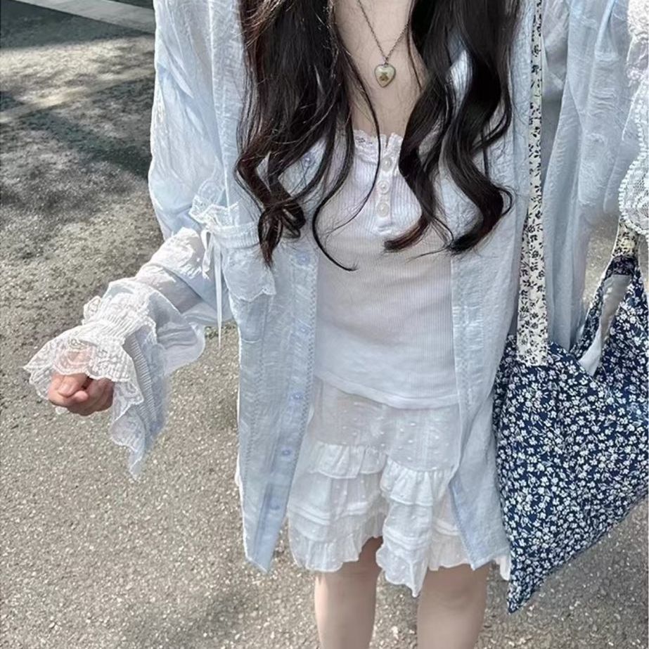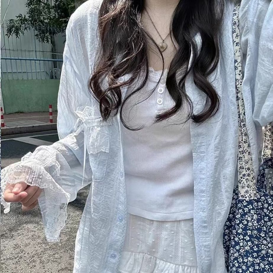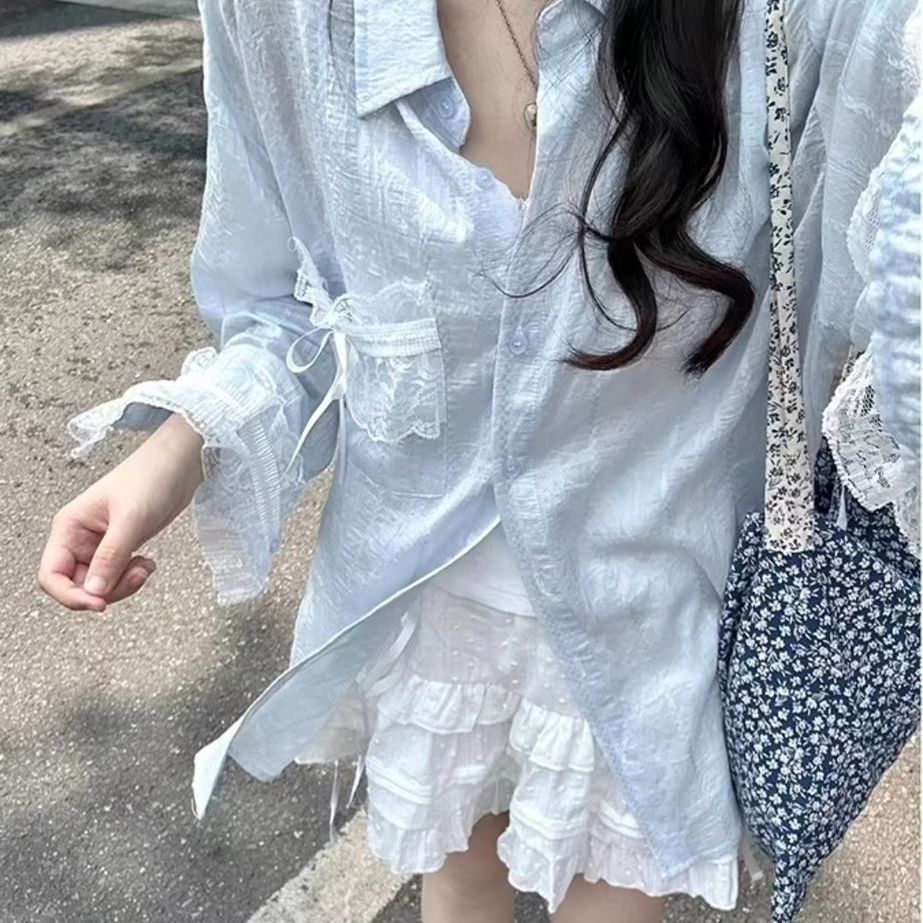 2025 кружевной дизайн с вставками, синяя рубашка с защитой от солнца, женская летняя тонкая рубашка из ледяного шелка, свободная куртка-рубашка