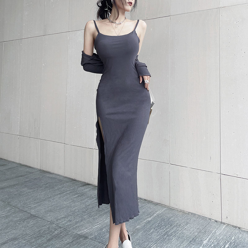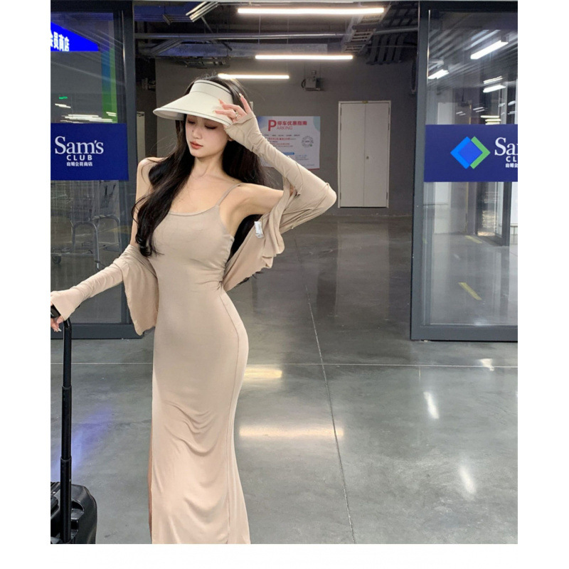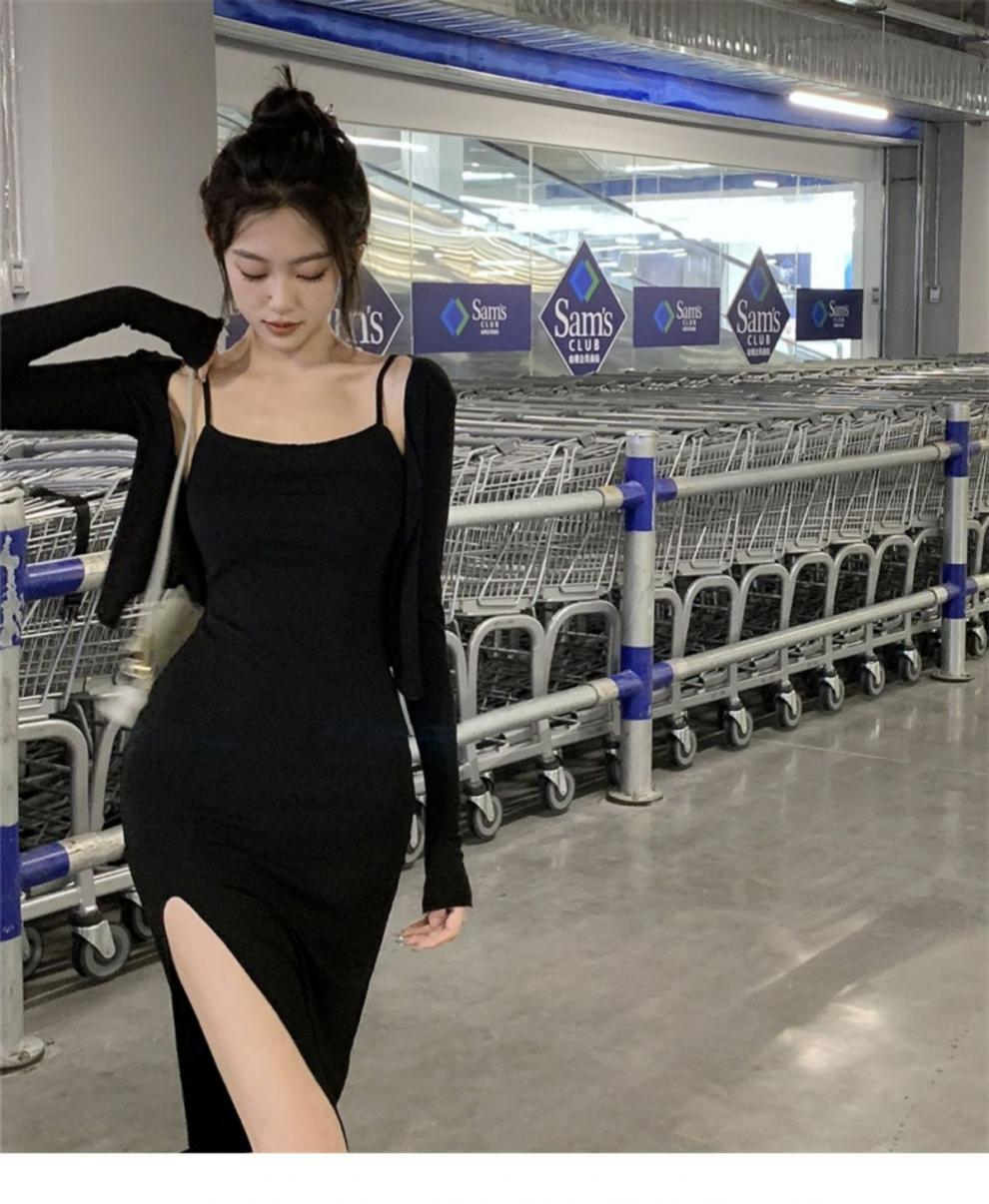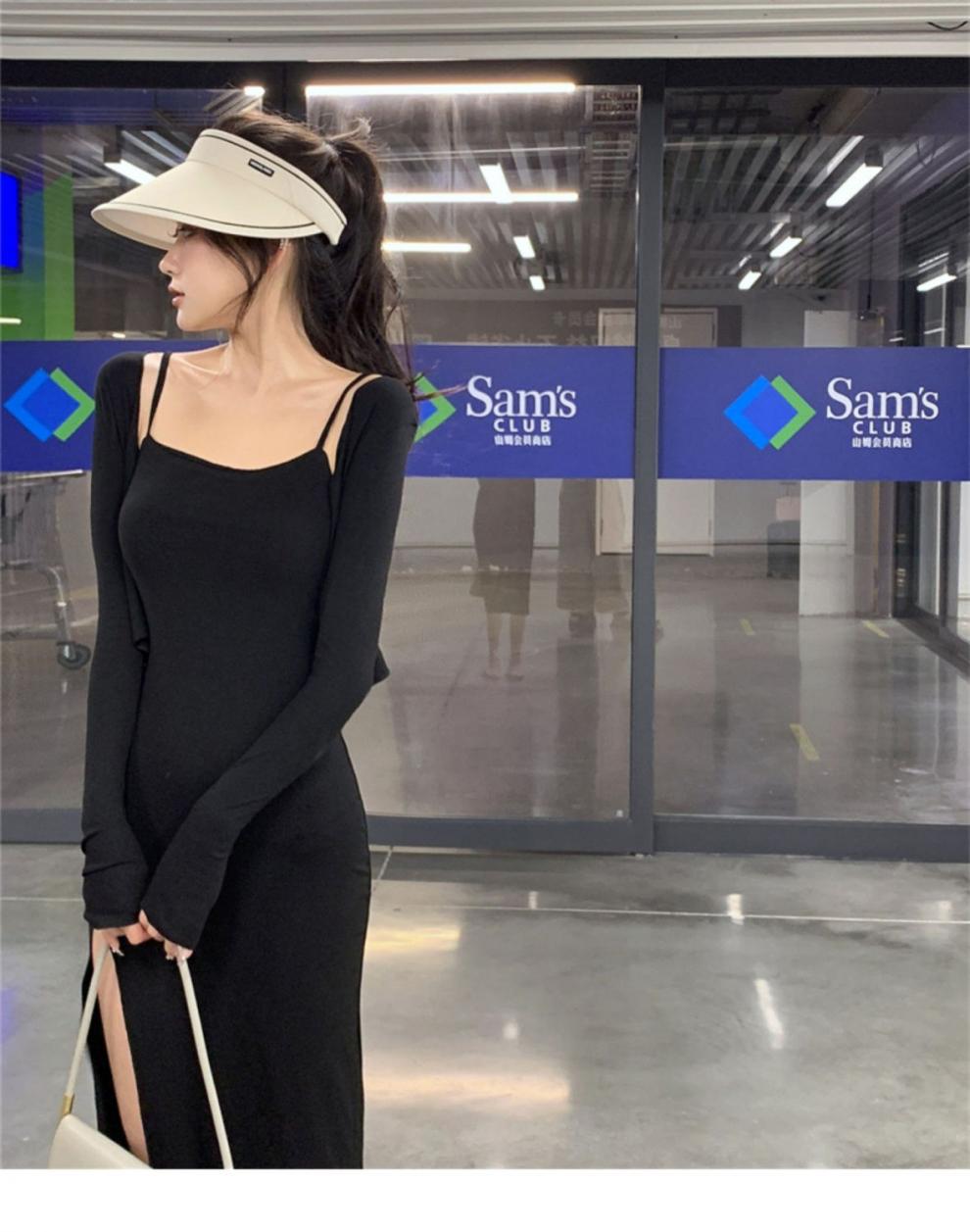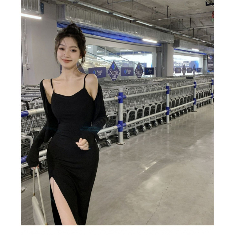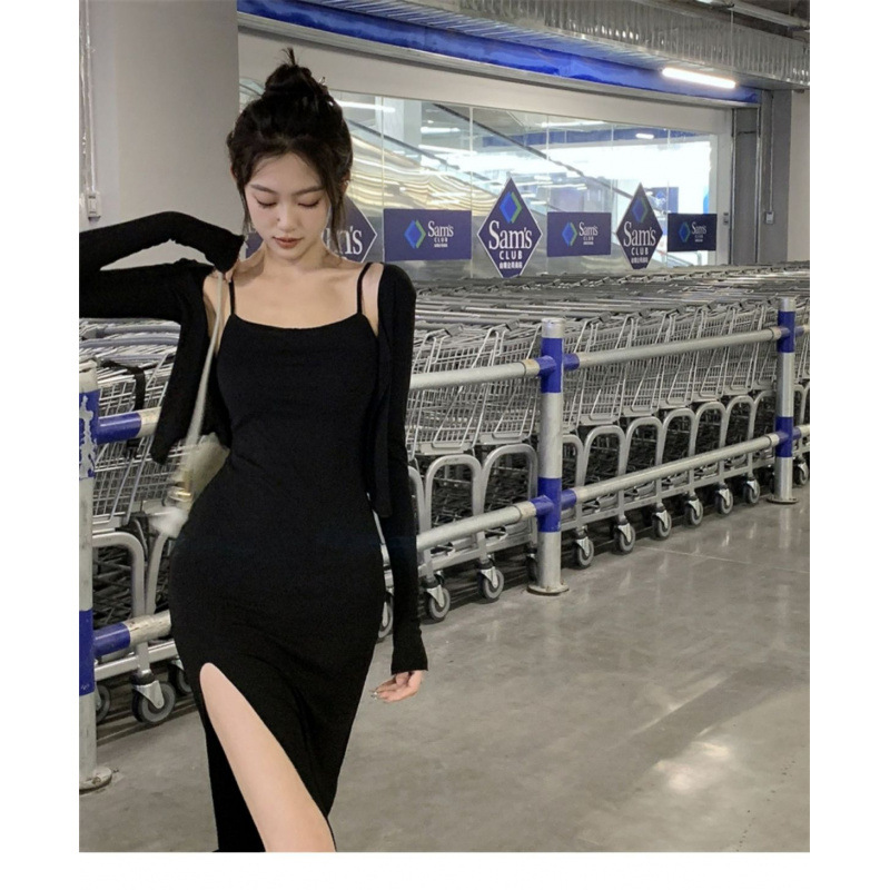 Весенне-осенняя юбка на подтяжках в европейском и американском стиле с кардиганом, сексуальное платье с боковым разрезом, жилет с длинными рукавами, блузка, комплект из двух предметов