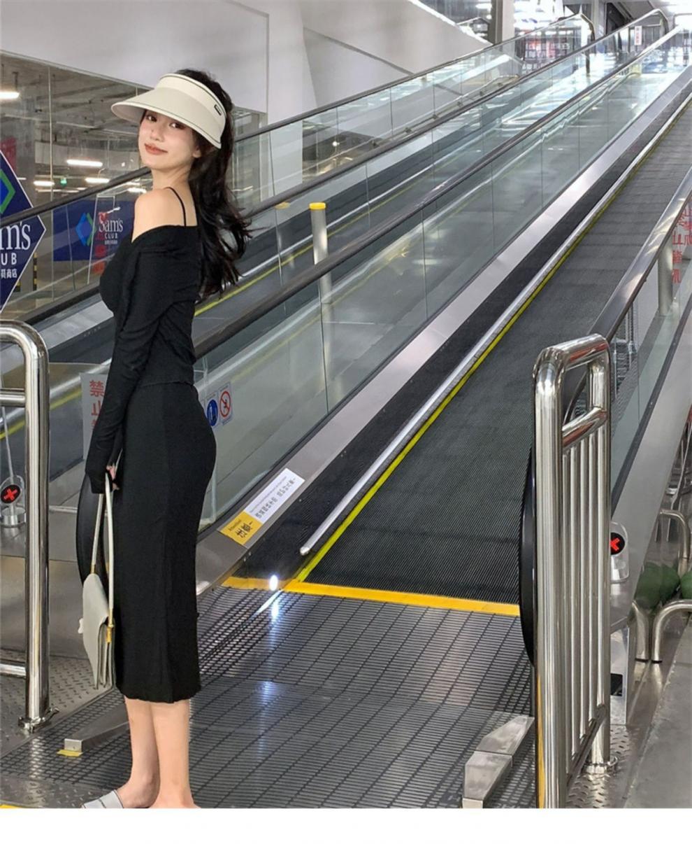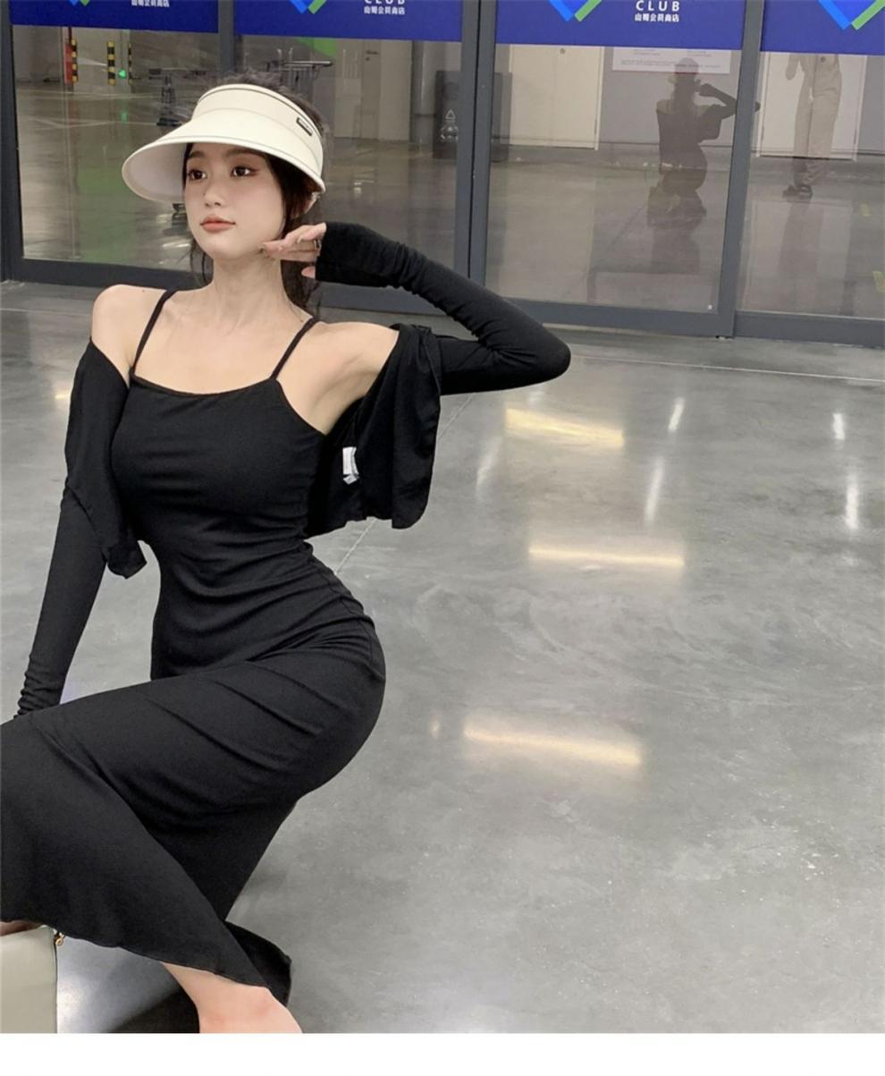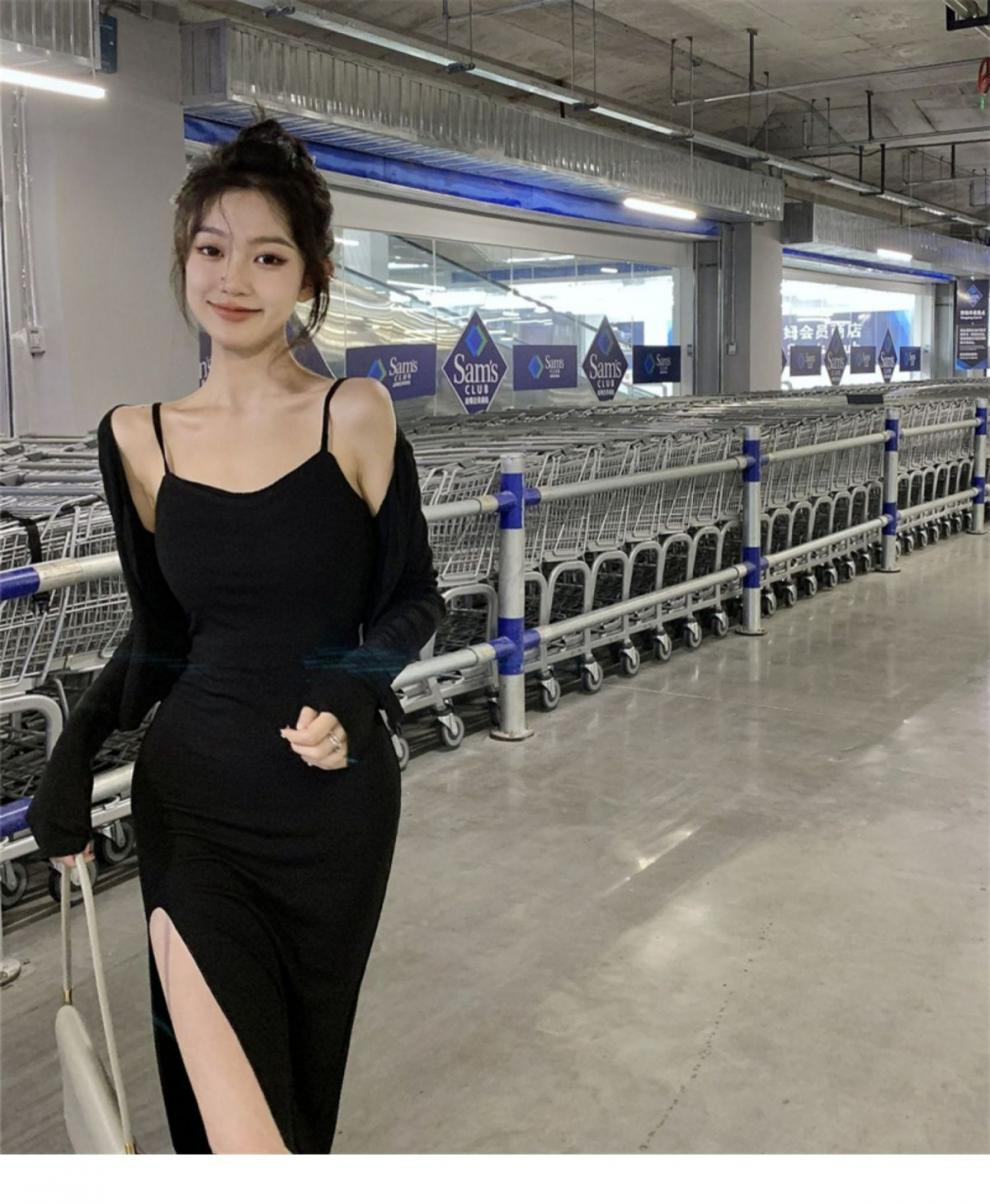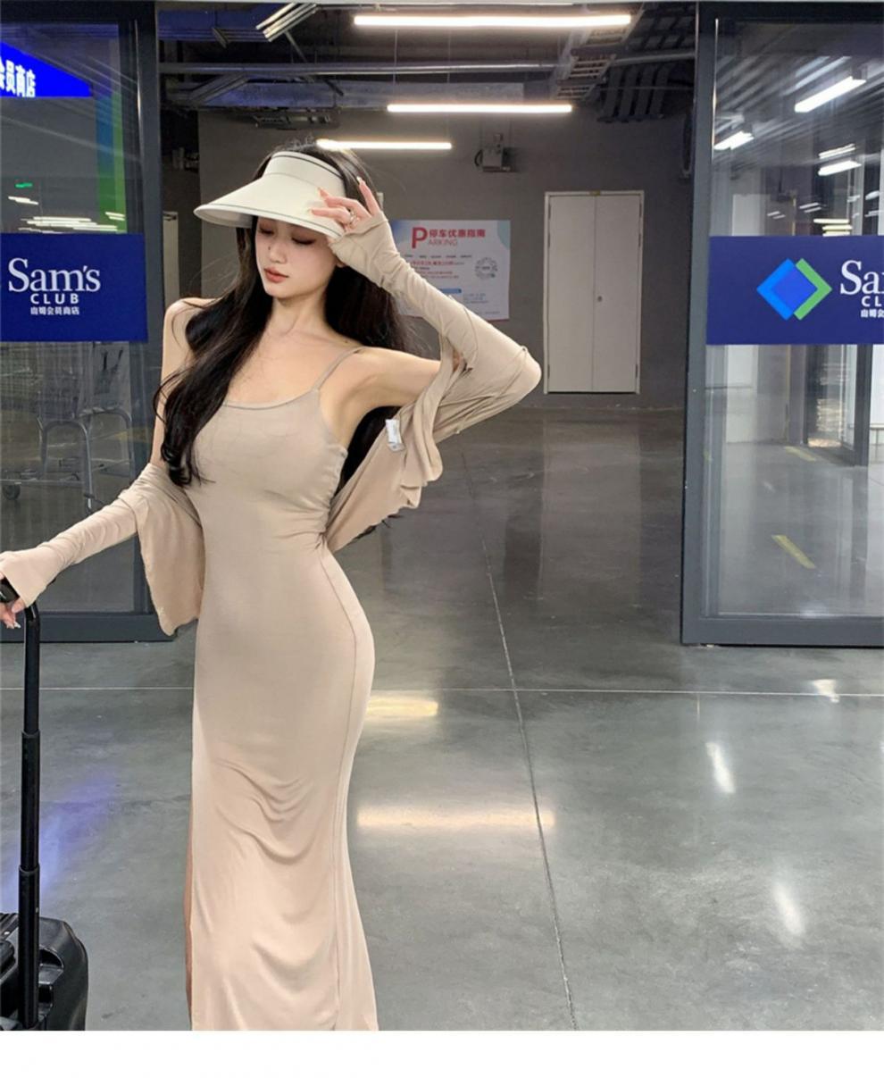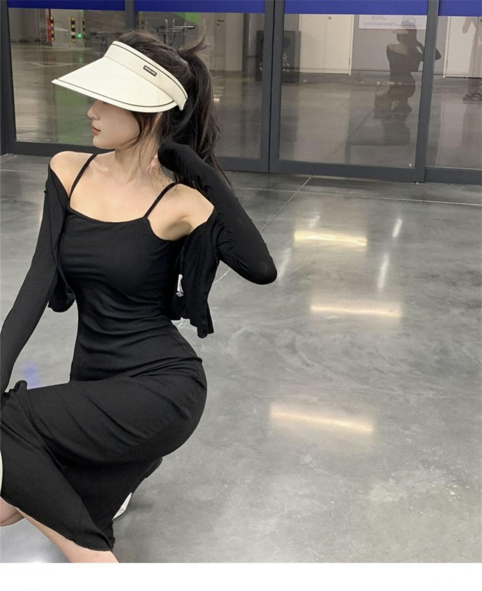 Весенне-осенняя юбка на подтяжках в европейском и американском стиле с кардиганом, сексуальное платье с боковым разрезом, жилет с длинными рукавами, блузка, комплект из двух предметов