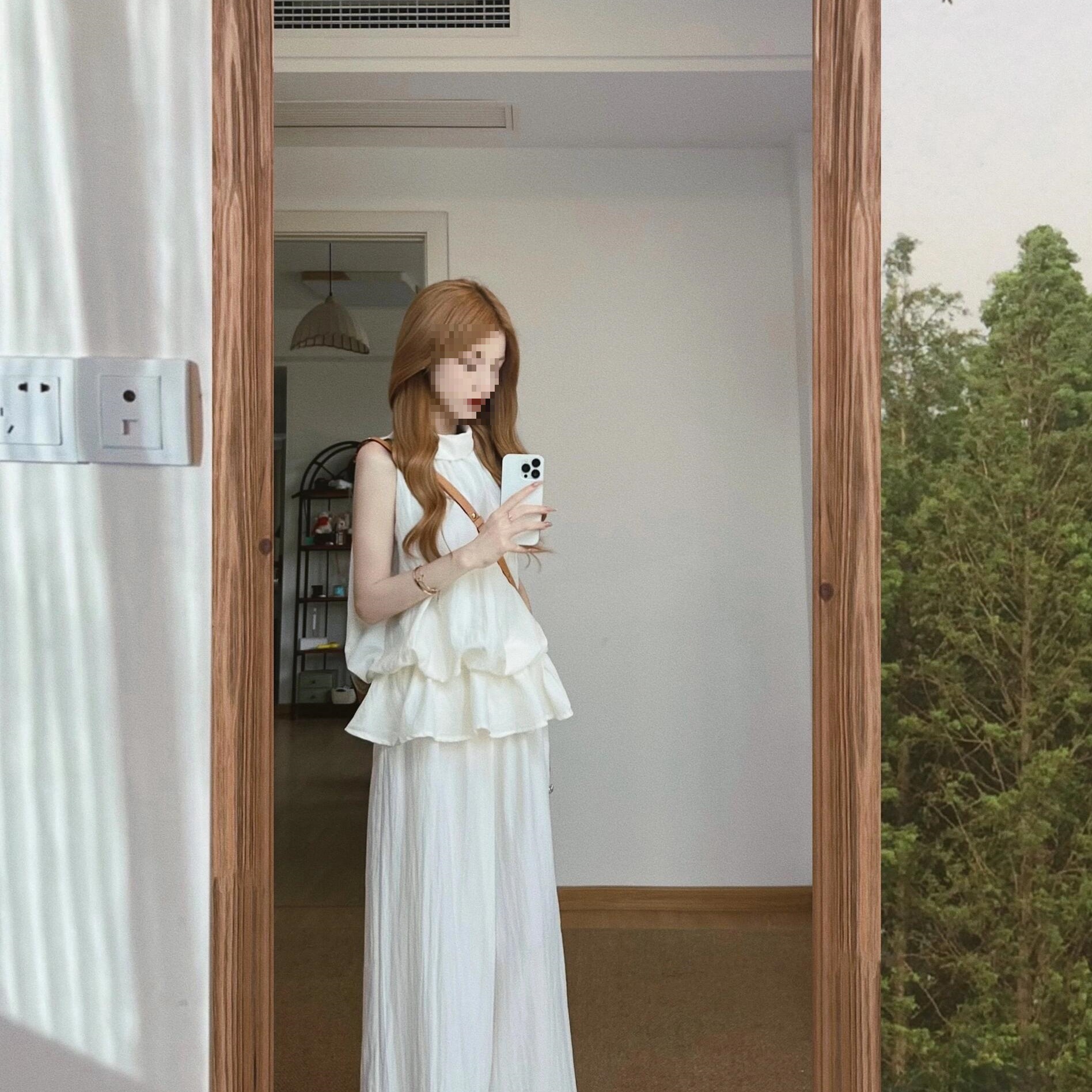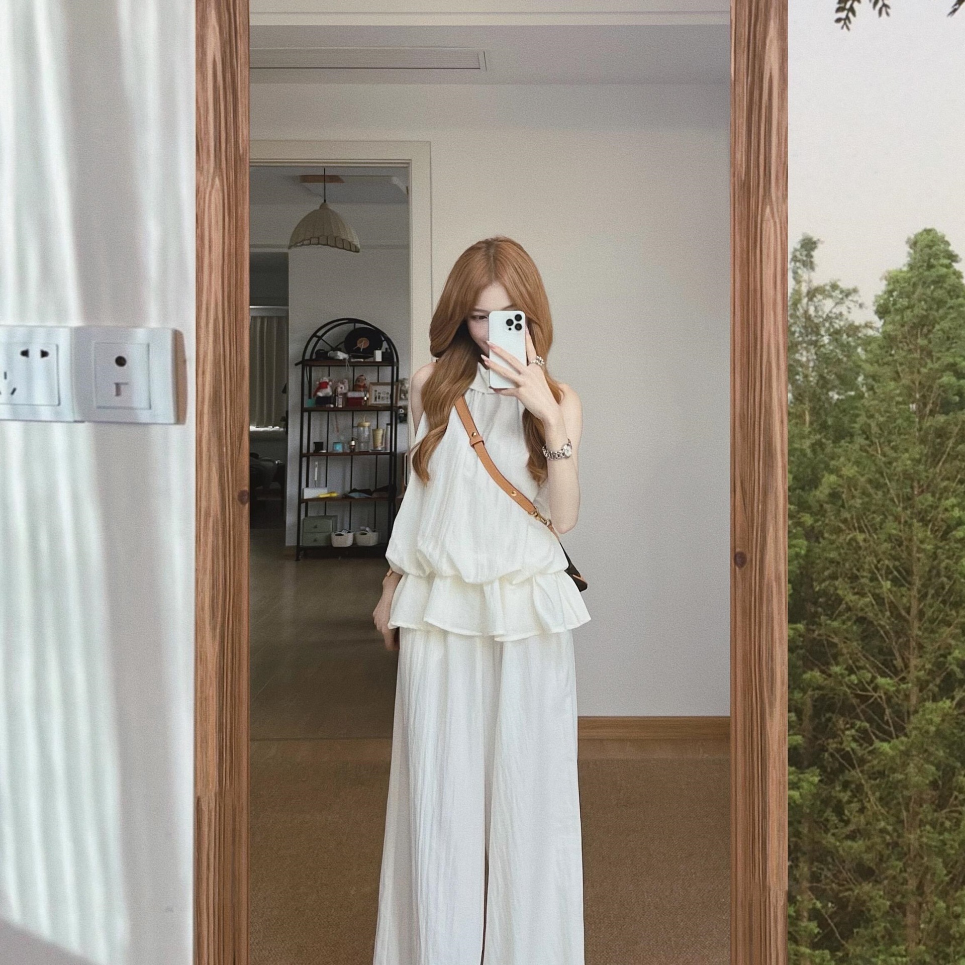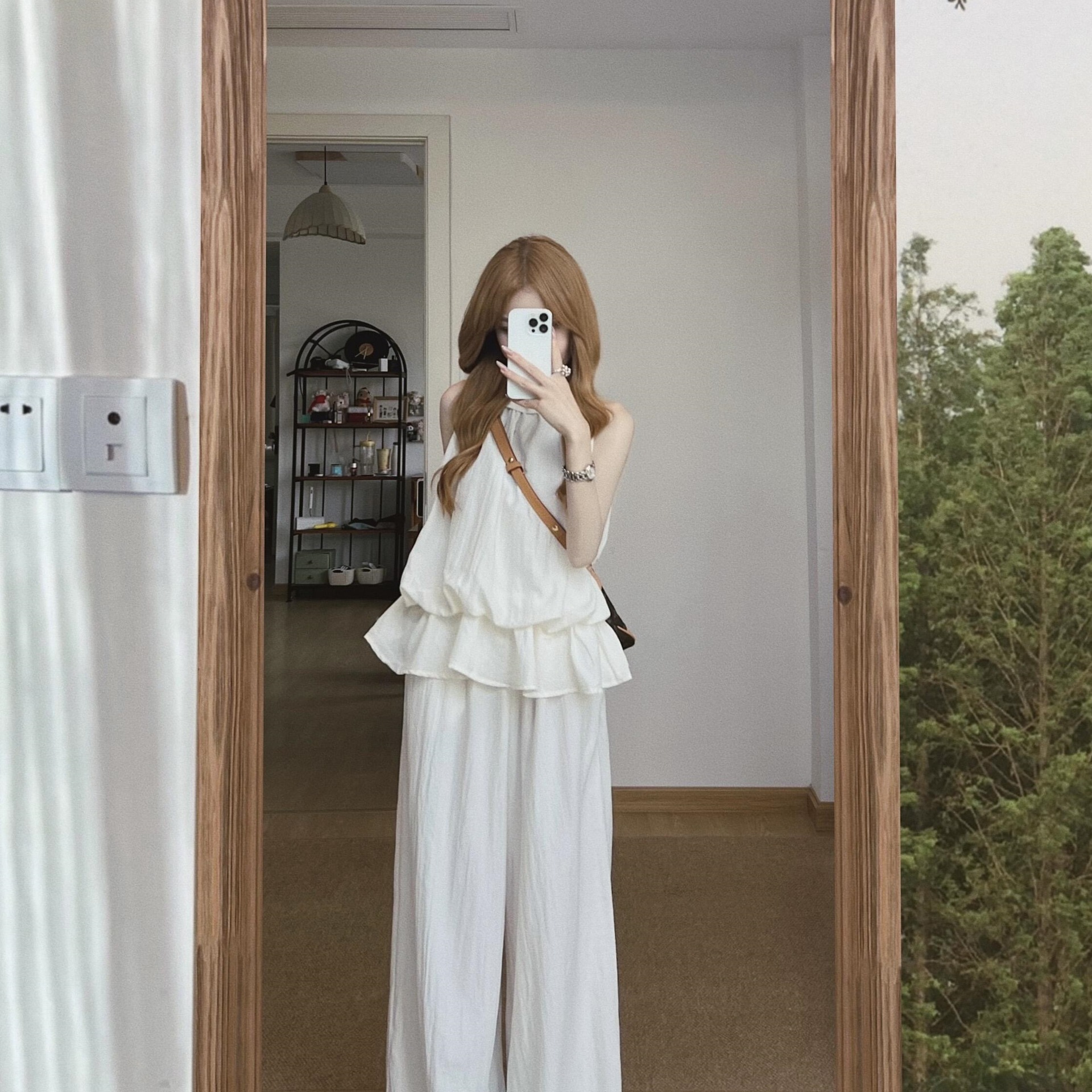 Летний комплект из двух предметов в корейском стиле 2025 года: топ-жилет с рюшами и завязками на шее и белые повседневные брюки.