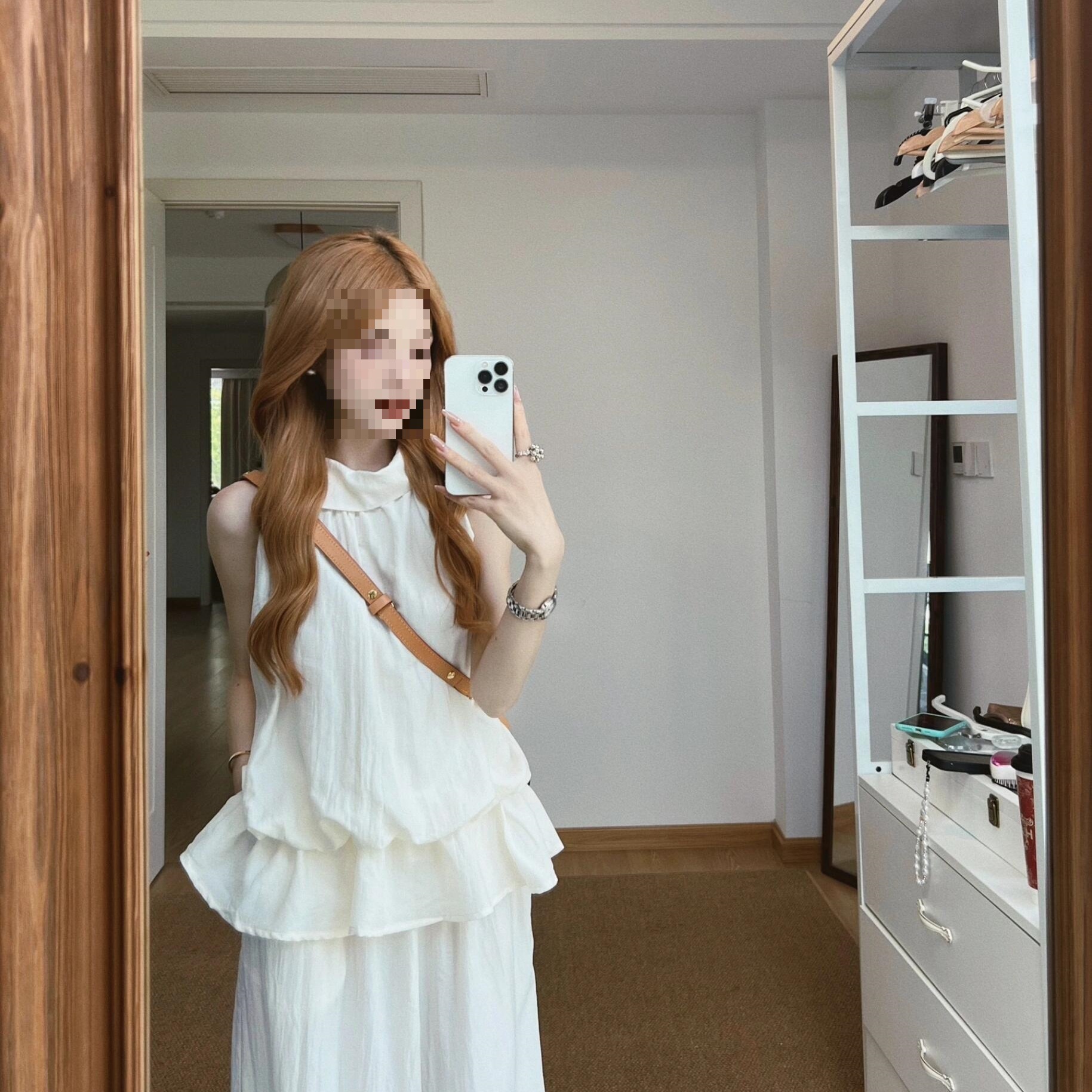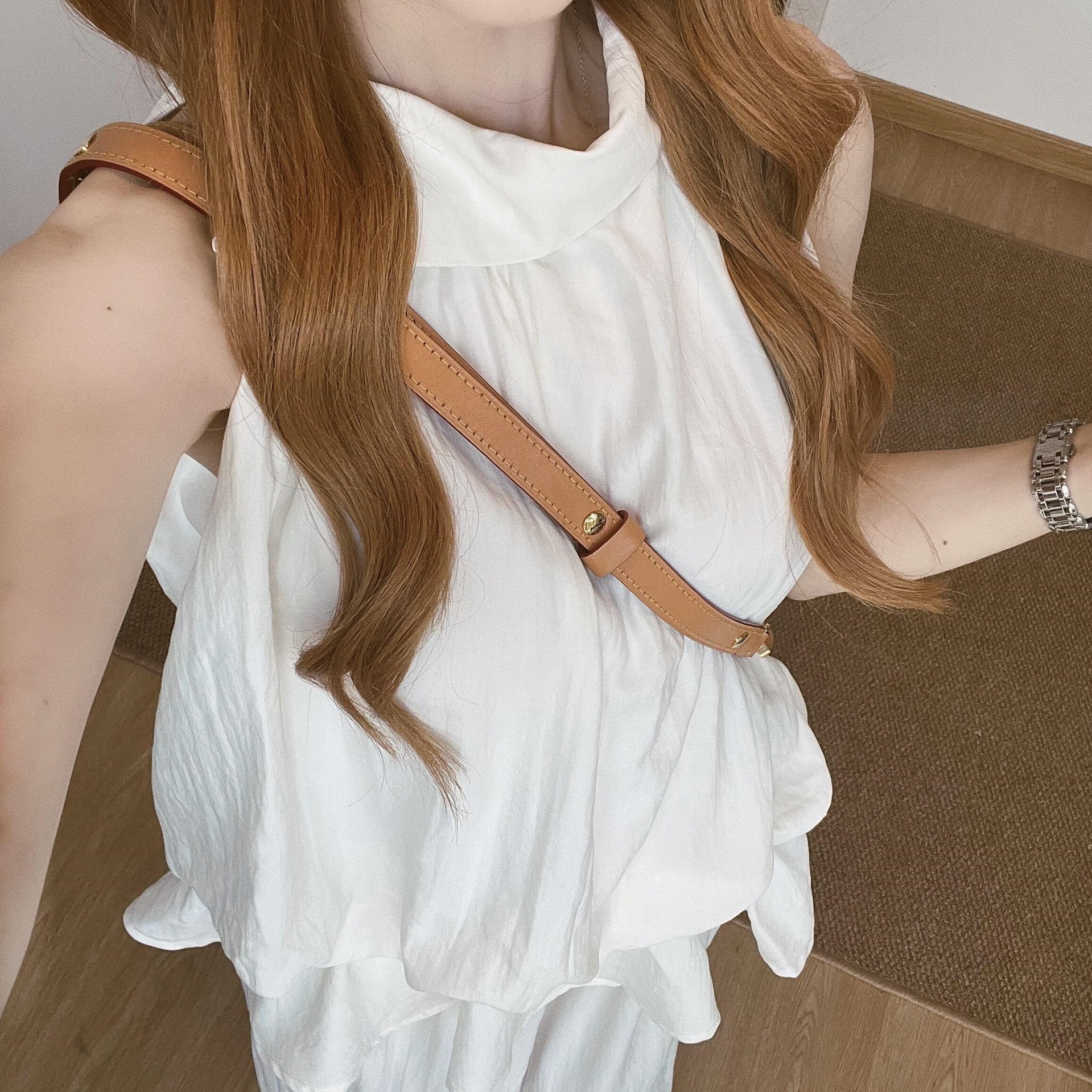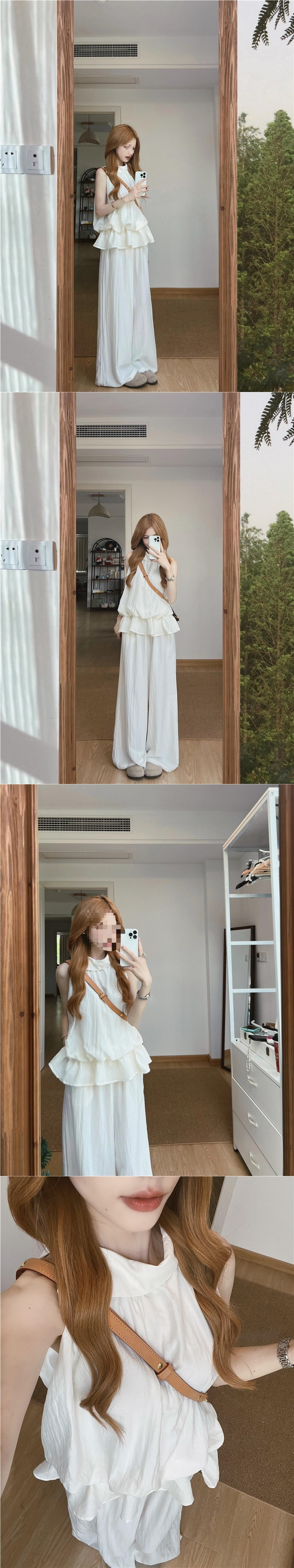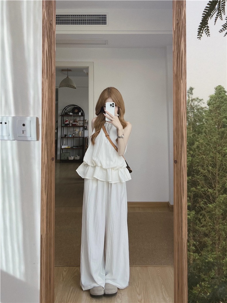 Летний комплект из двух предметов в корейском стиле 2025 года: топ-жилет с рюшами и завязками на шее и белые повседневные брюки.