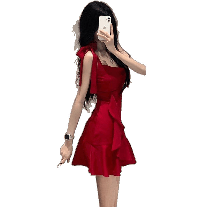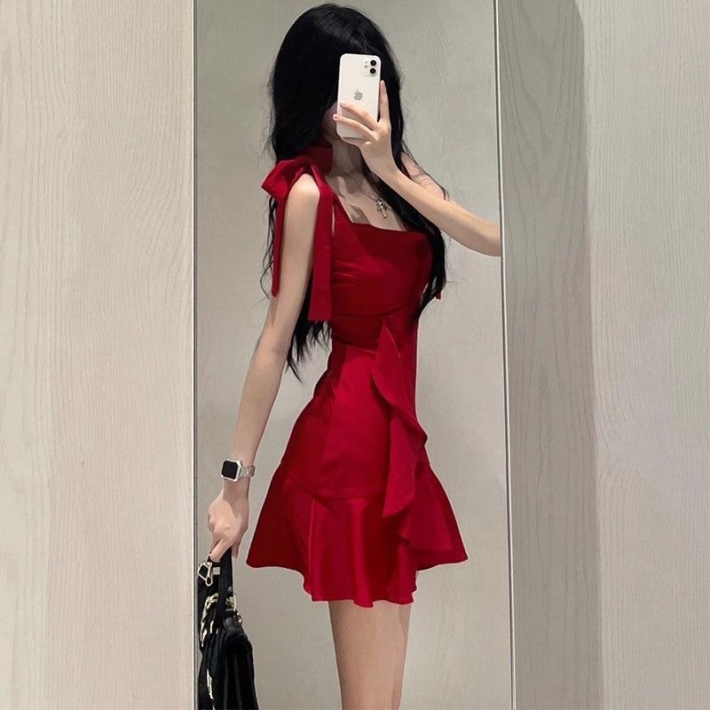 Новое летнее платье с листьями лотоса, темпераментное красное платье на подтяжках для миниатюрных девушек, короткая юбка для похудения талии в стиле чистой страсти