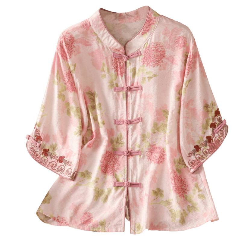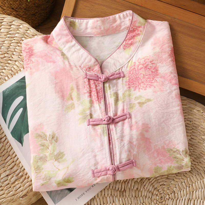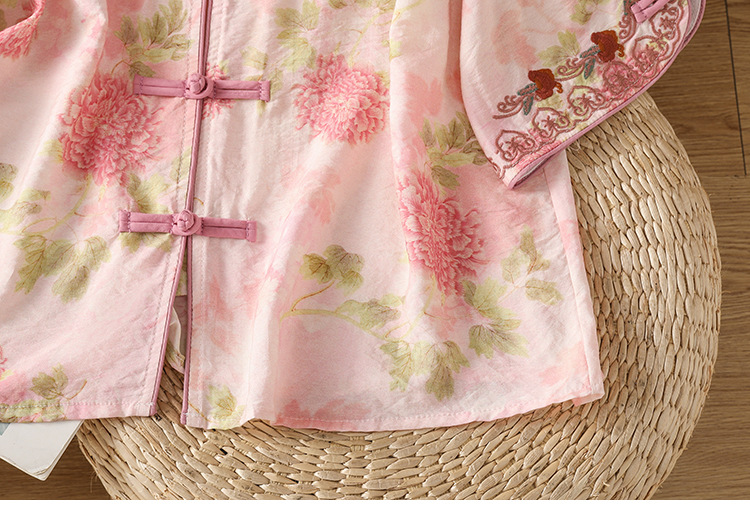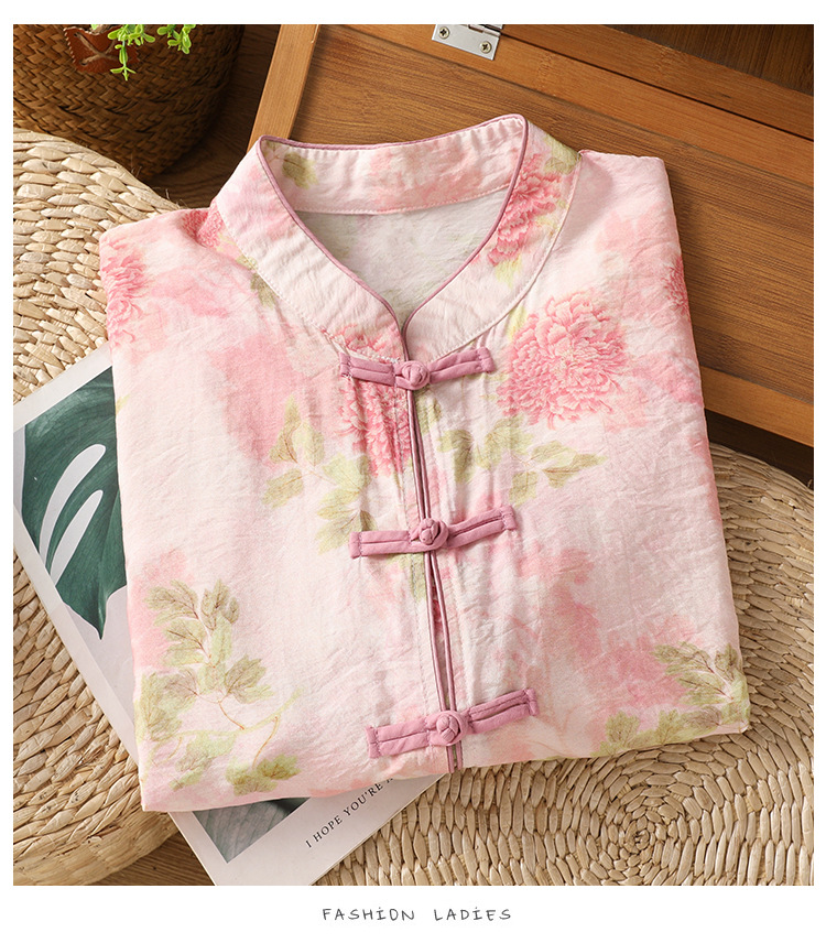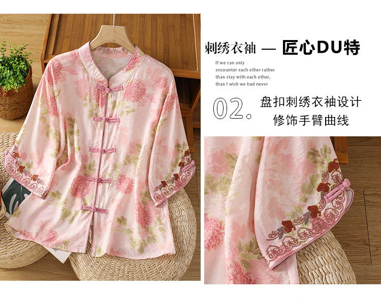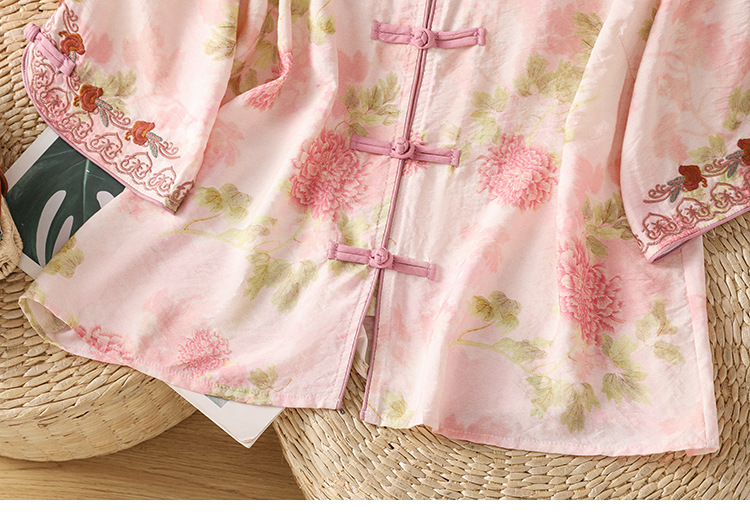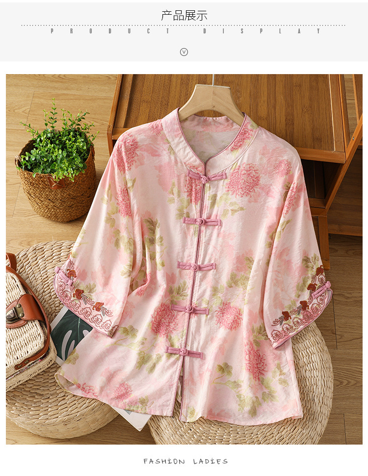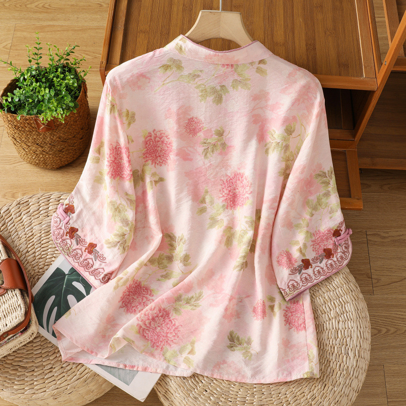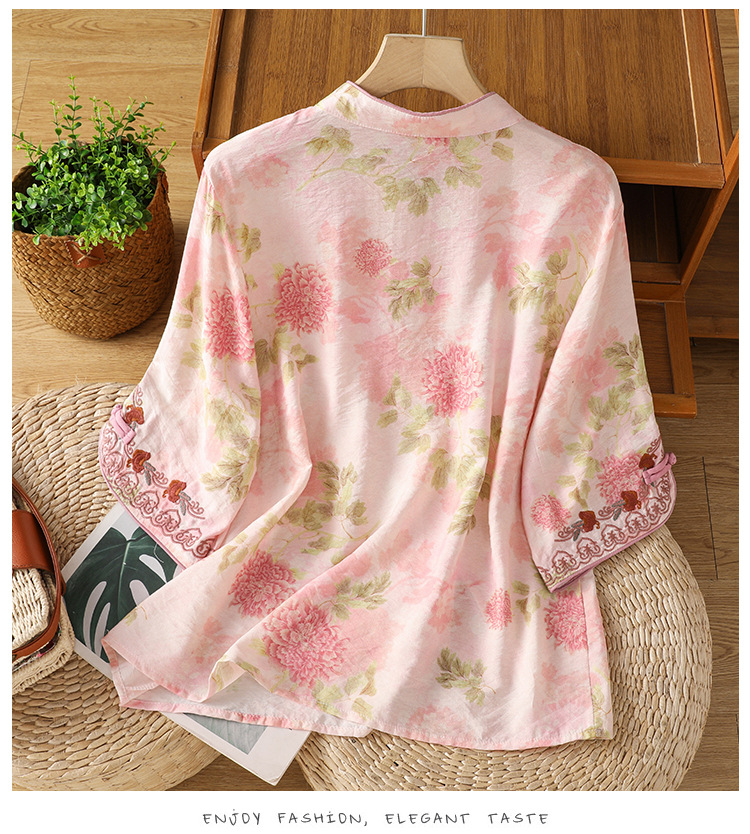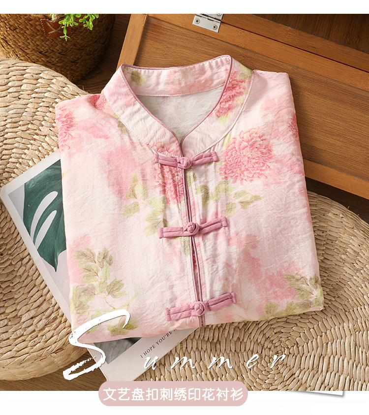 Женская рубашка из хлопка и льна с художественной вышивкой, новый летний стиль, свободная и облегающая блузка с воротником-стойкой на пуговицах в китайском стиле.