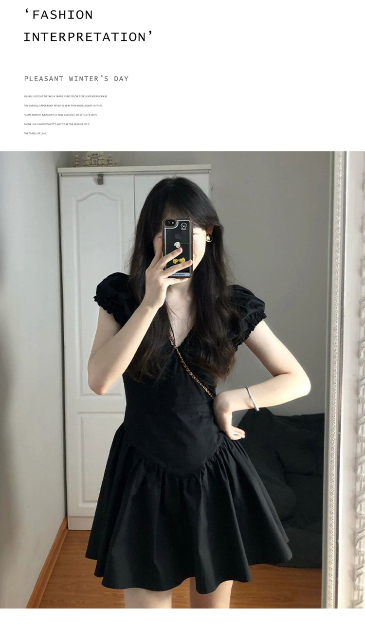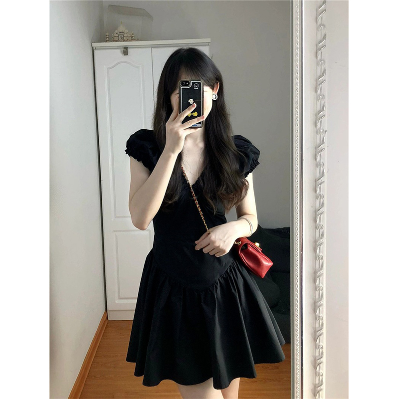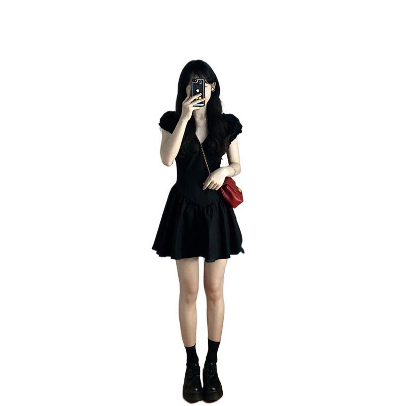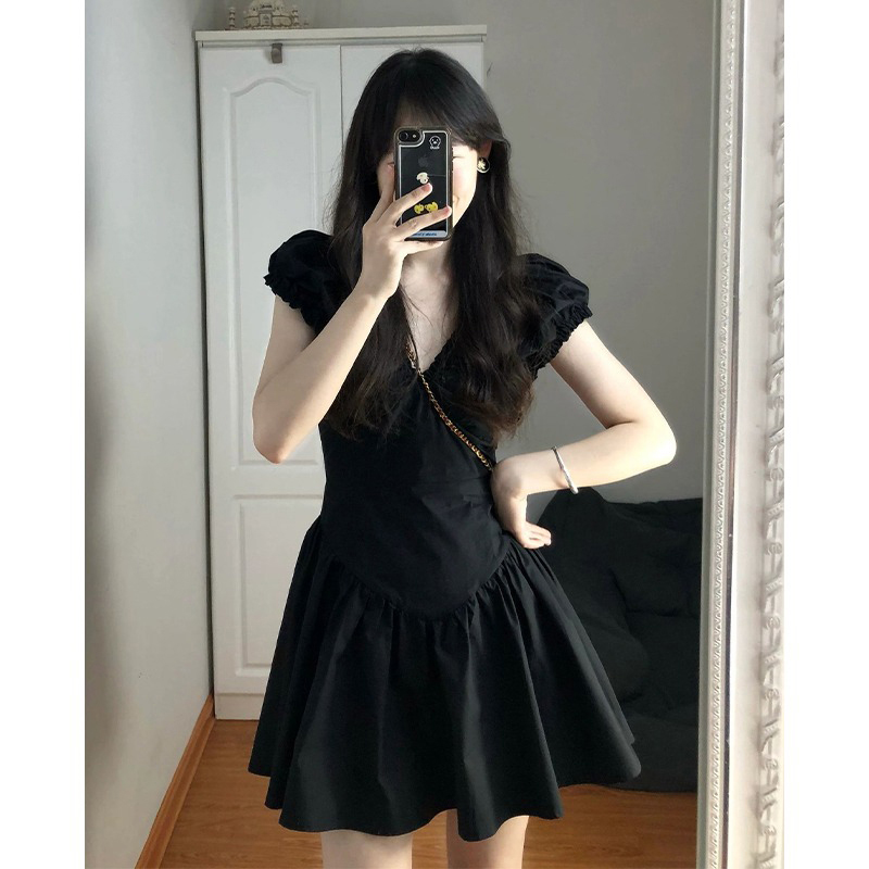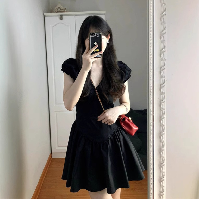 2025 новое летнее черное элегантное короткое платье с v-образным вырезом, французское платье для перерыва на чай для маленьких девочек, чтобы выглядеть стройными и стройными