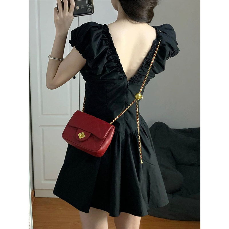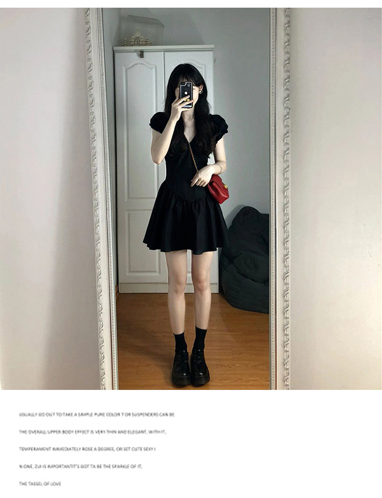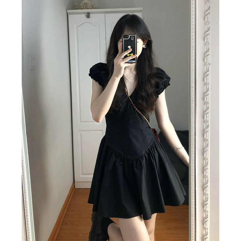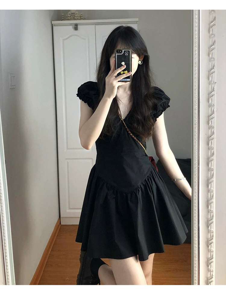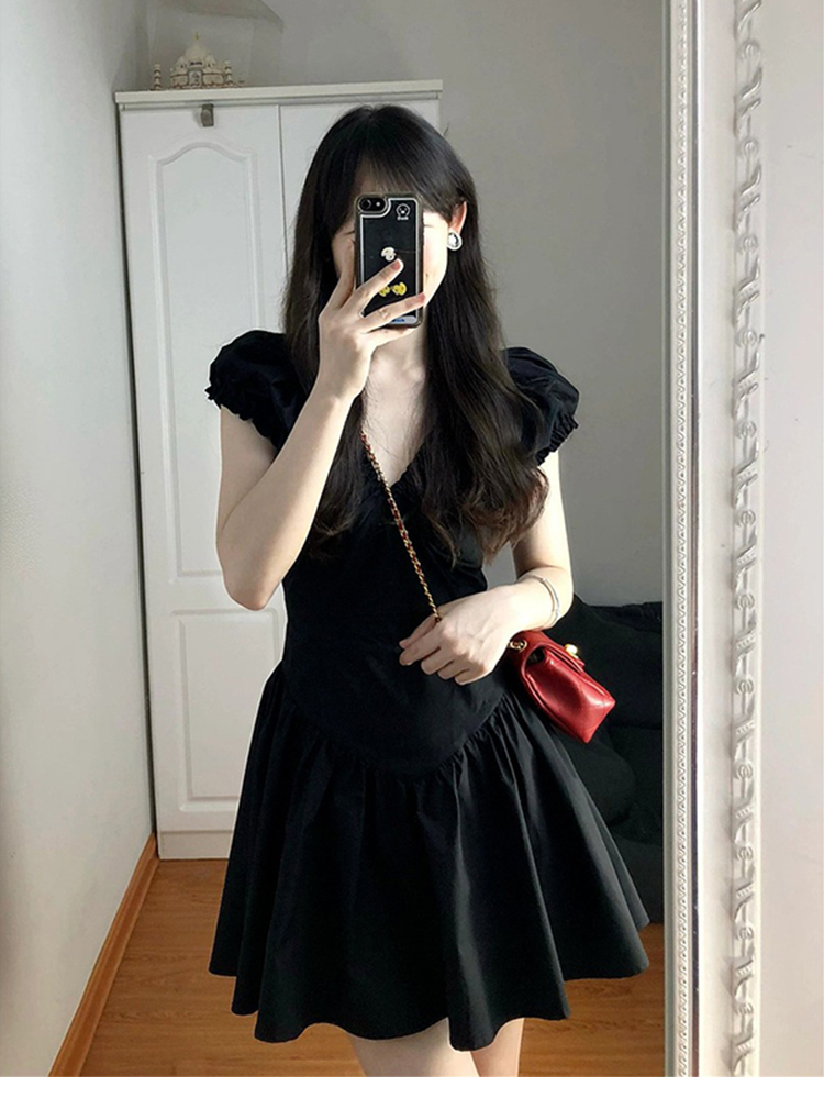 2025 новое летнее черное элегантное короткое платье с v-образным вырезом, французское платье для перерыва на чай для маленьких девочек, чтобы выглядеть стройными и стройными