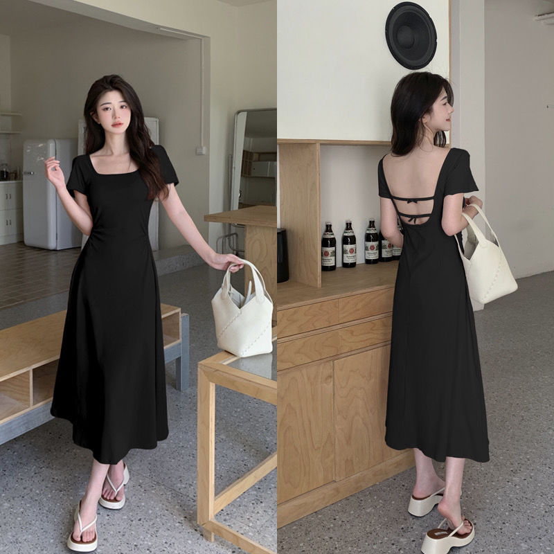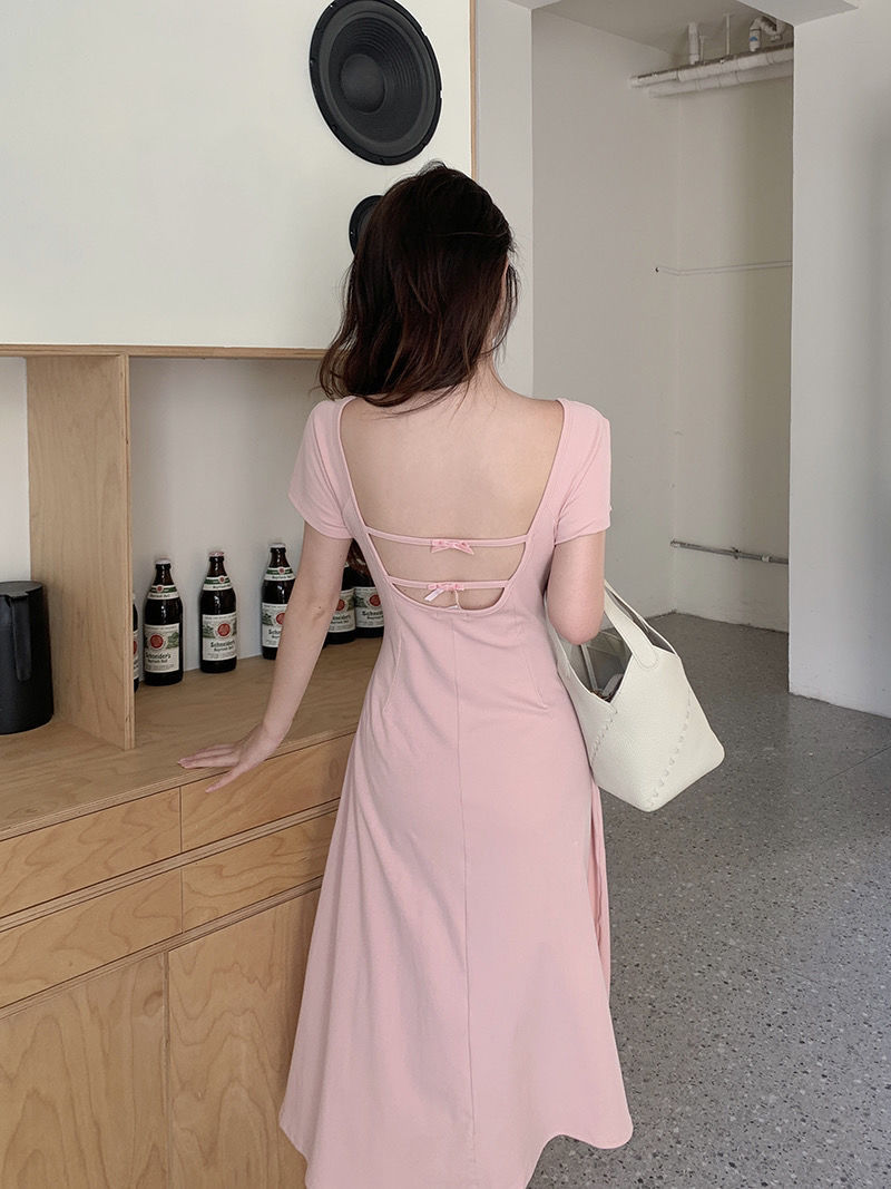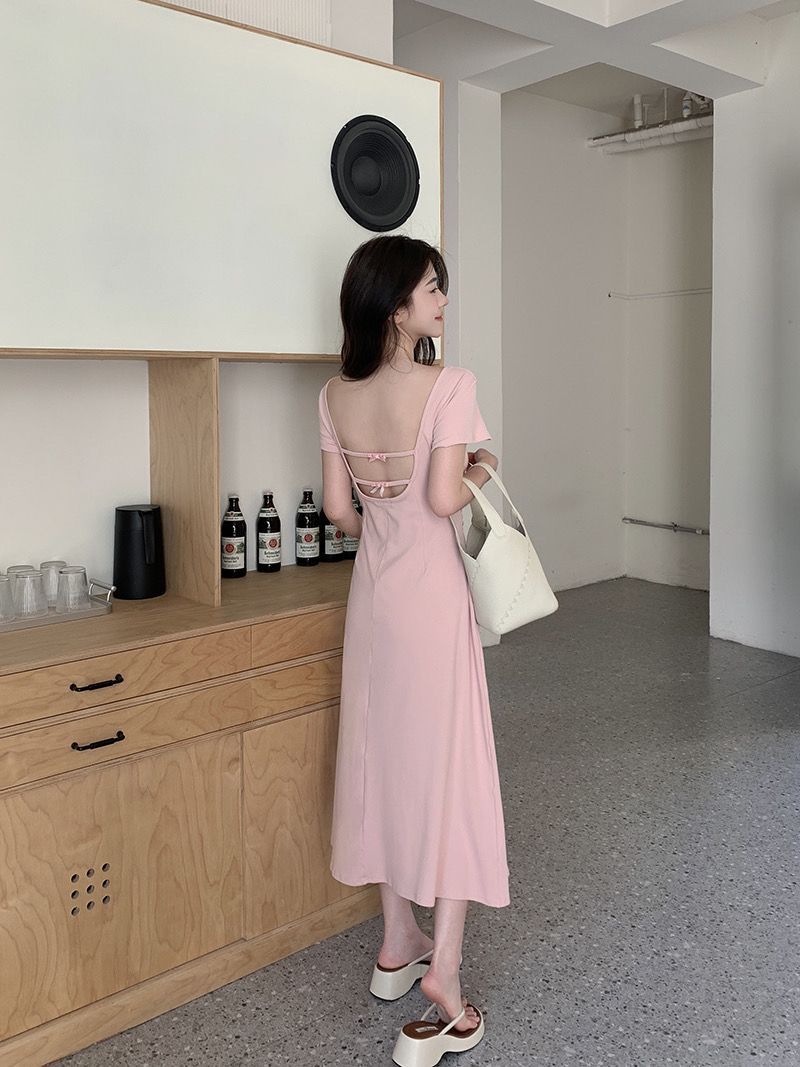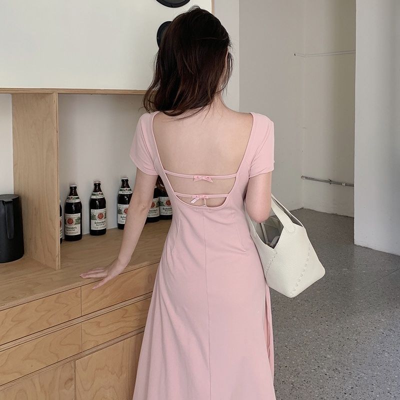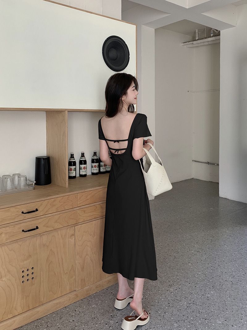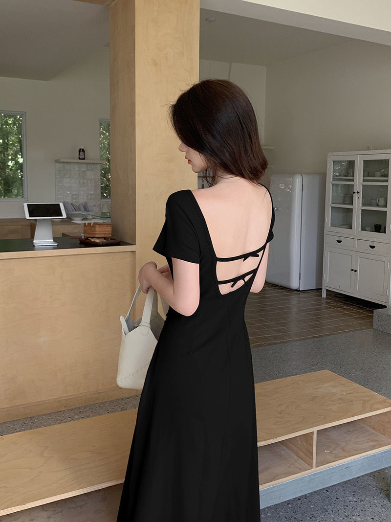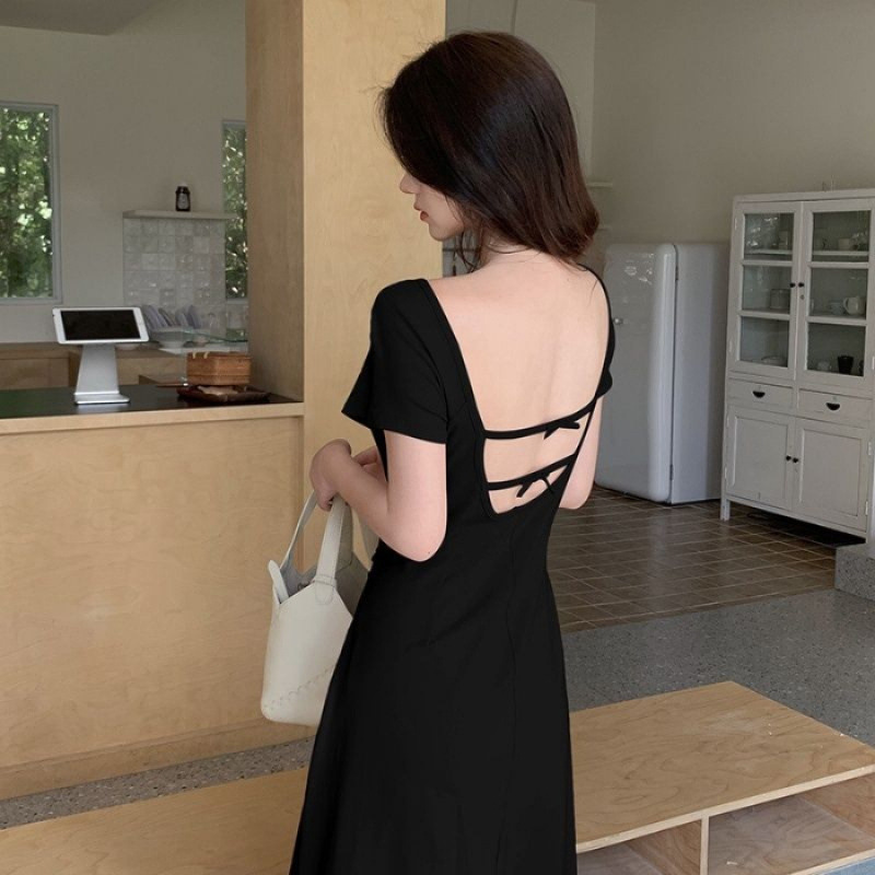 Женское летнее платье с короткими рукавами и открытой спиной в корейском стиле, новый стиль, с вырезом на спине и бантом, средней длины, с квадратным вырезом, юбка А-силуэта