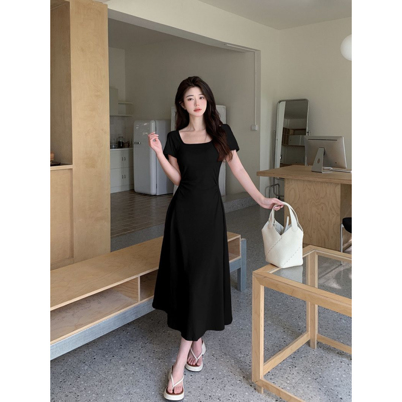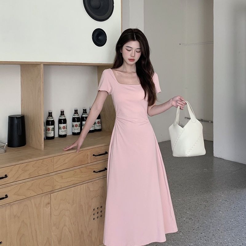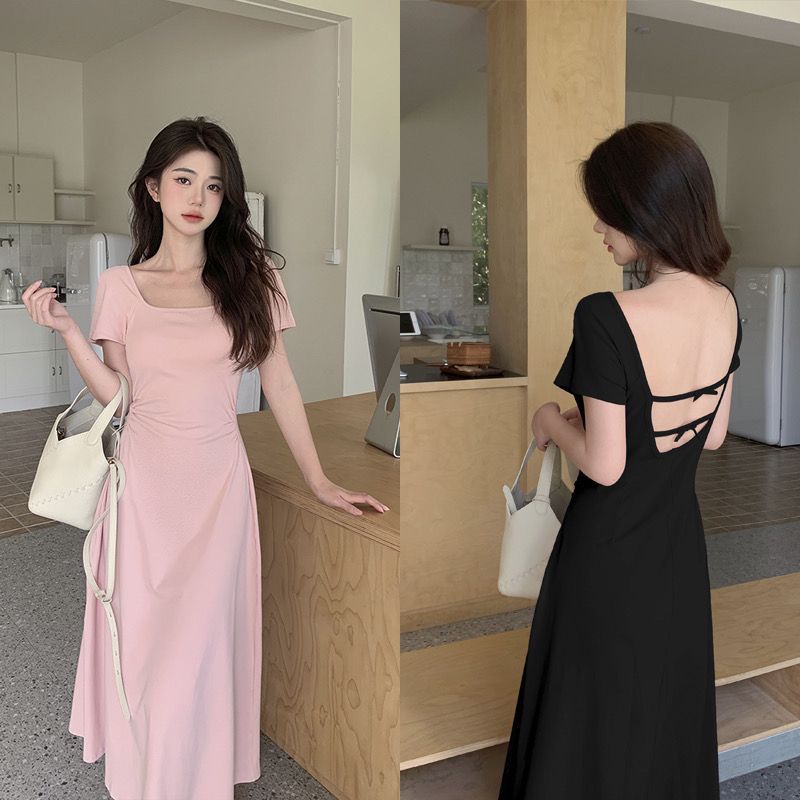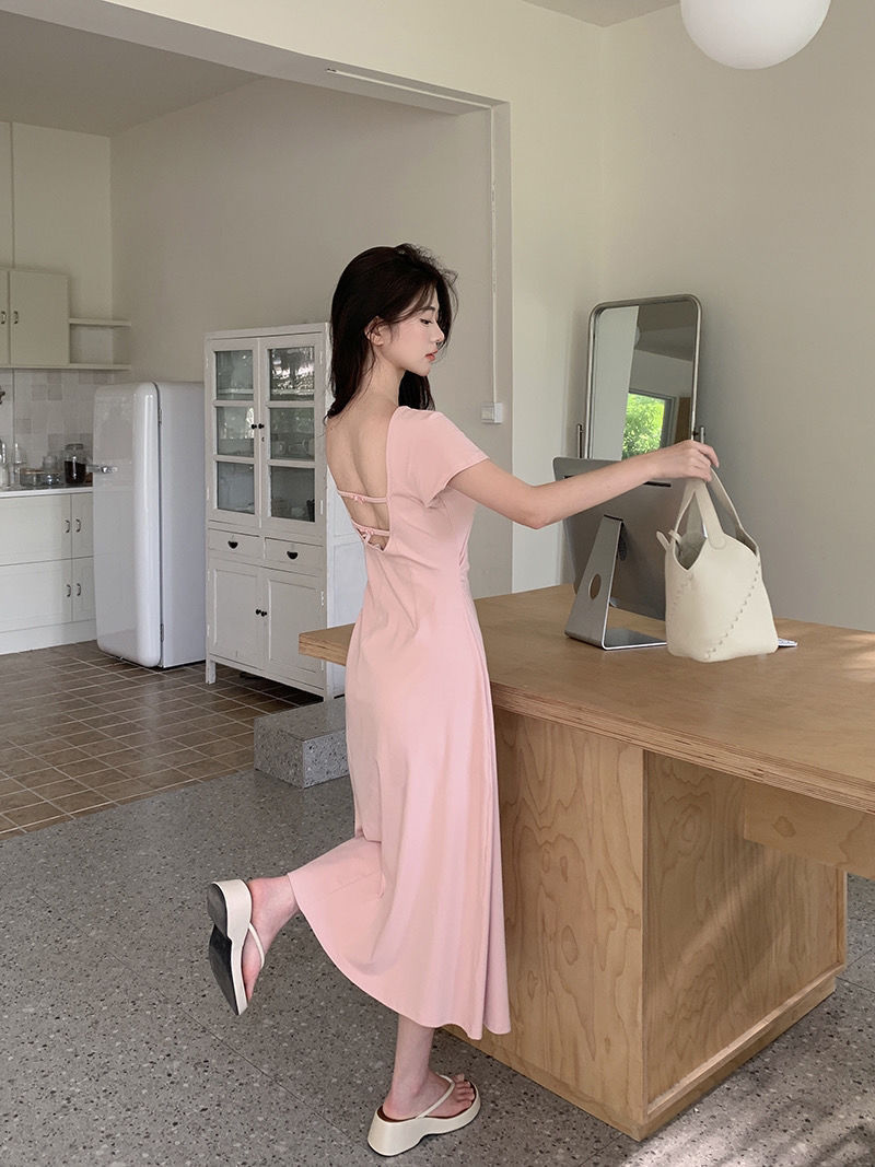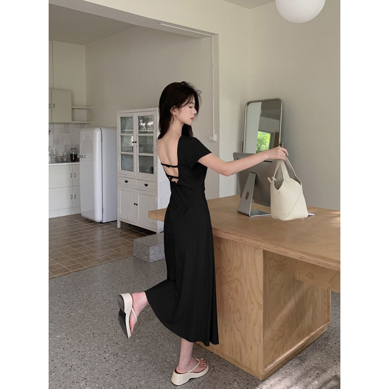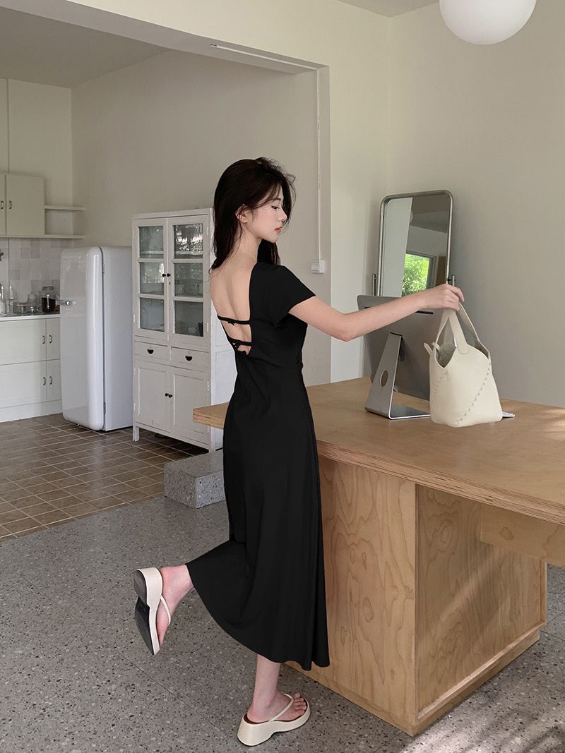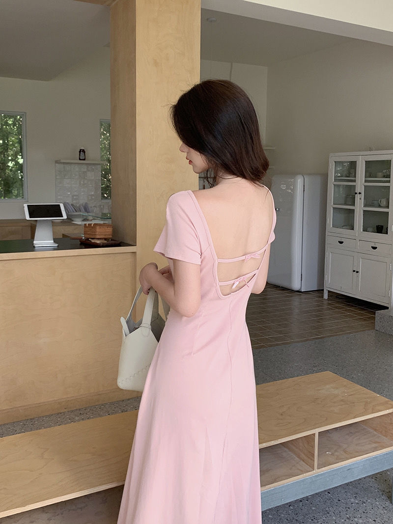 Женское летнее платье с короткими рукавами и открытой спиной в корейском стиле, новый стиль, с вырезом на спине и бантом, средней длины, с квадратным вырезом, юбка А-силуэта