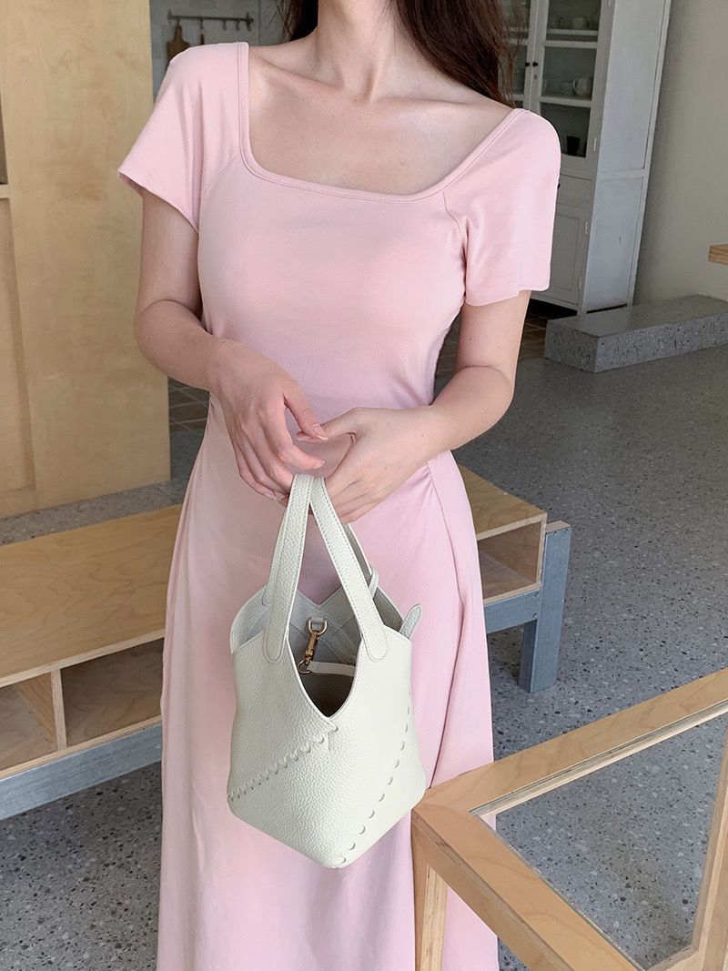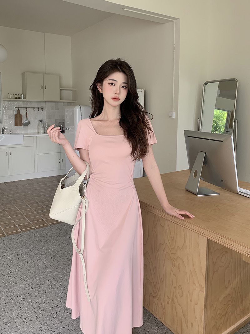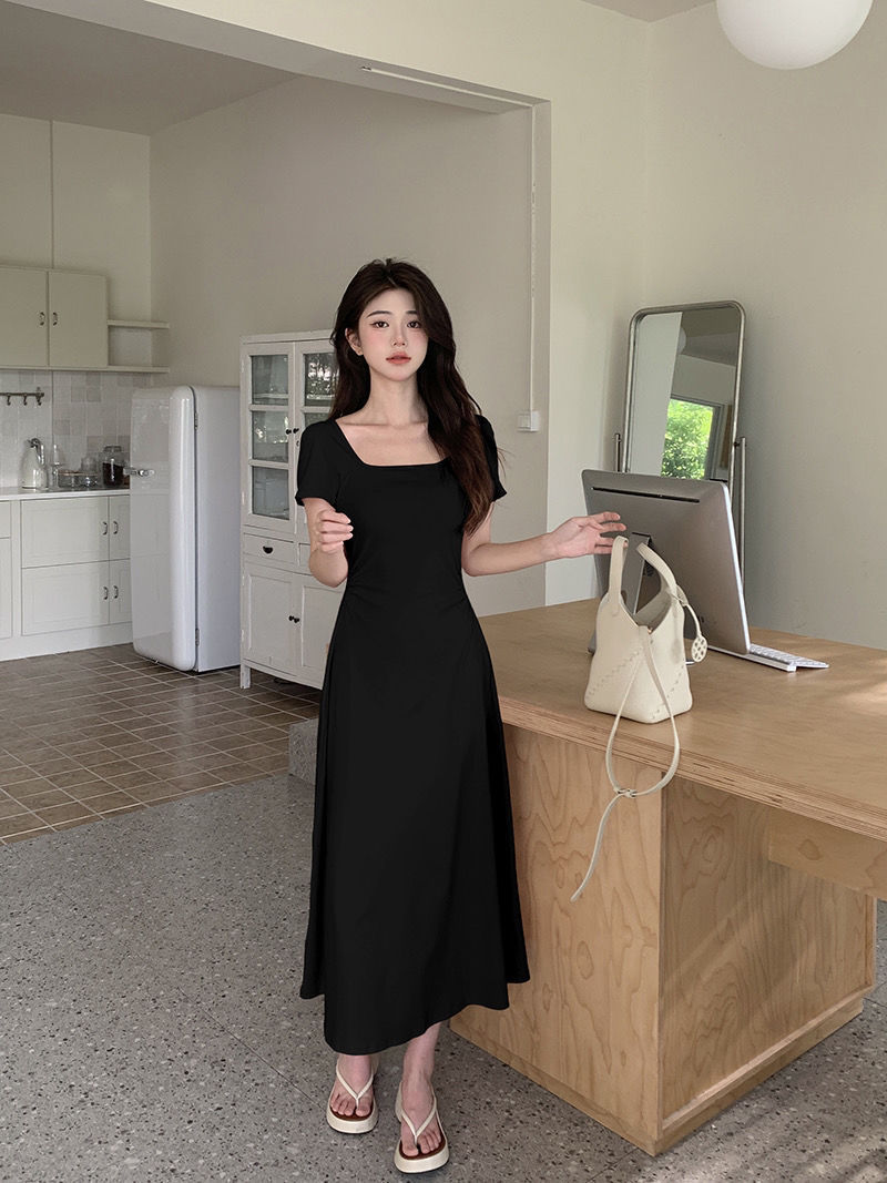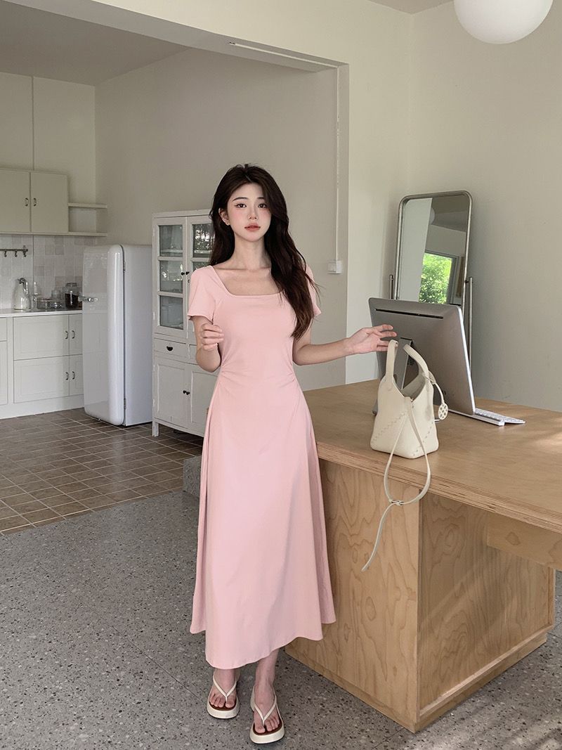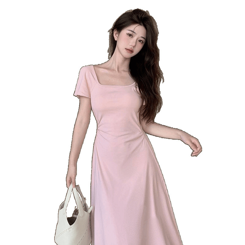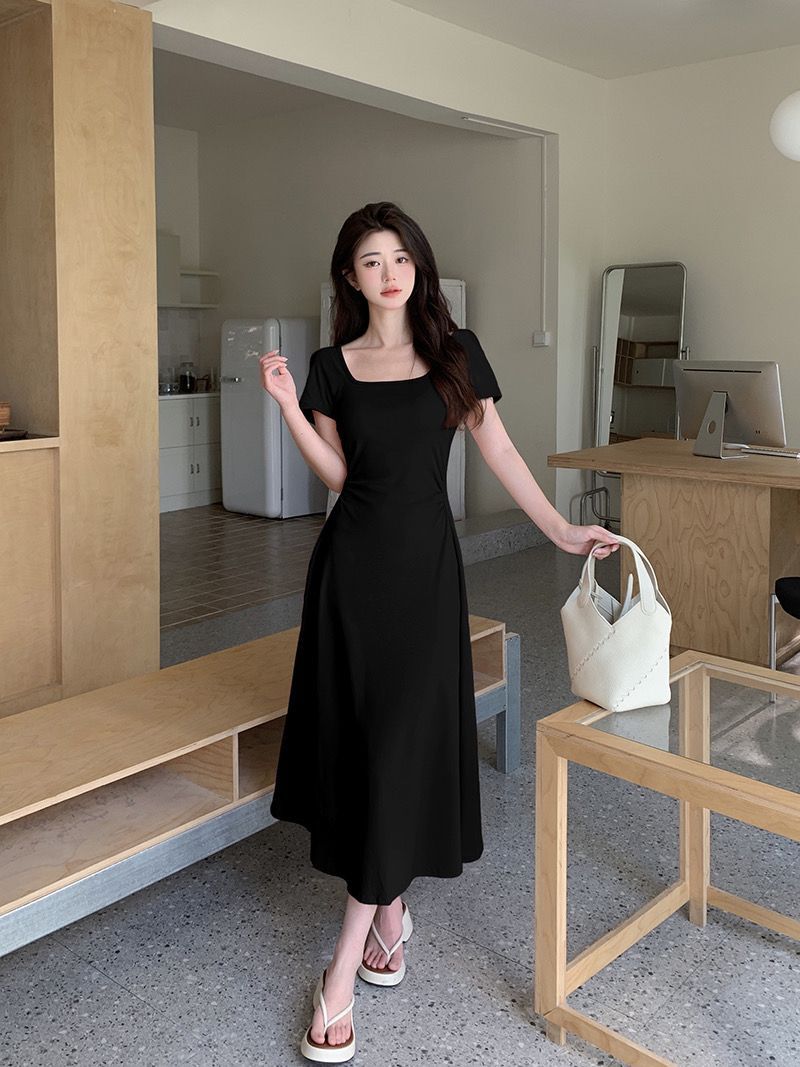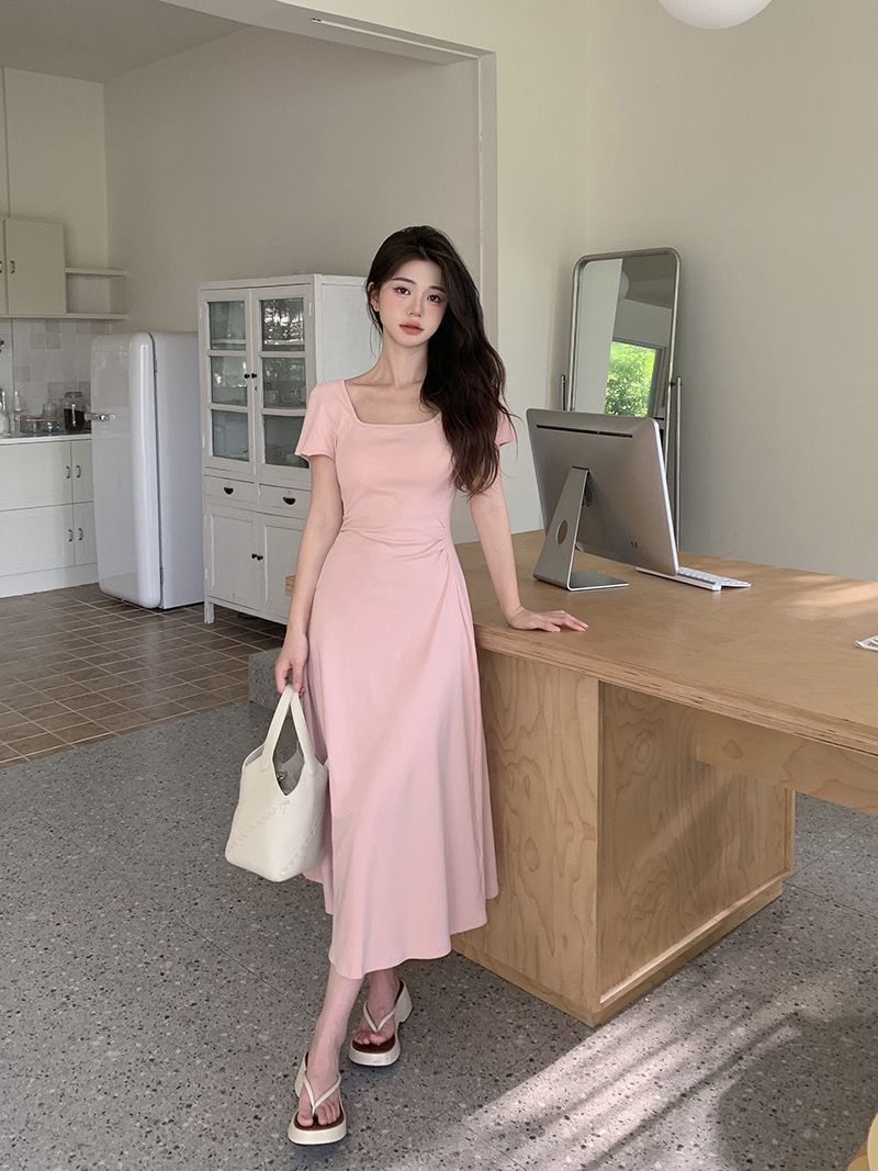 Женское летнее платье с короткими рукавами и открытой спиной в корейском стиле, новый стиль, с вырезом на спине и бантом, средней длины, с квадратным вырезом, юбка А-силуэта