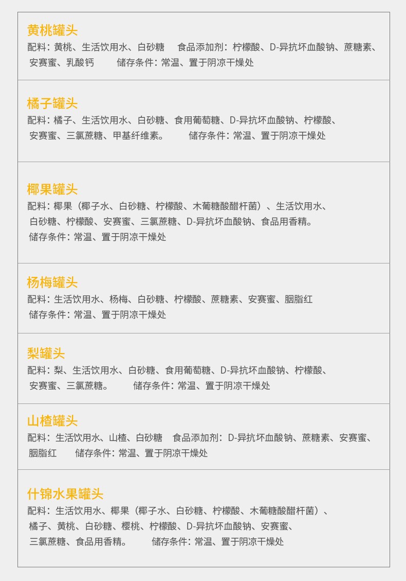 Шесть в одном (микс апельсина, персика, груши, кокоса); Желтый персик 256г*3+апельсин 256г*3; Желтый персик 256 г*6 бутылок; Апельсин 256 г*6 бутылок; Сидней 256 г*6 бутылок; Боярыня 256г*6 бутылок; Янмей 256 г*6 бутылок; Смешанные фрукты 256 г*6 бутылок; Кокос 256 г*6 бутылок; Ананас 248 г*6 бутылок; Желтый персик 256г*3+Груша 256г*3; Жёлтый персик 256 г*3 + Боязь 256 г*3; Желтый персик 256г*3+кокос 256г*3