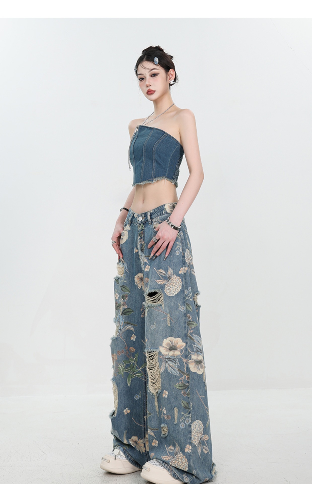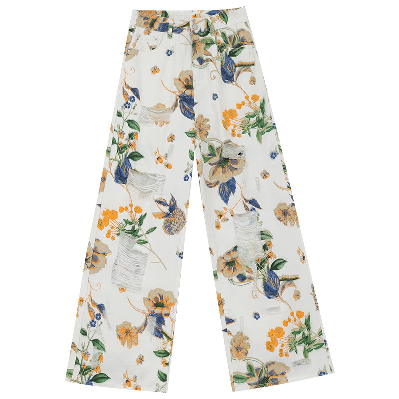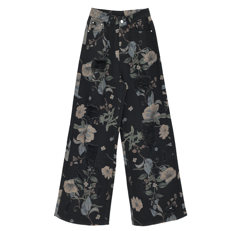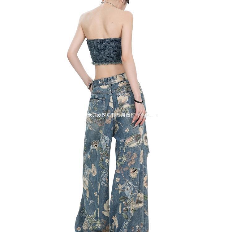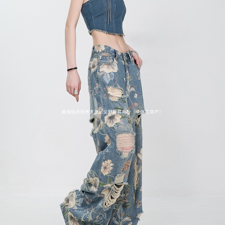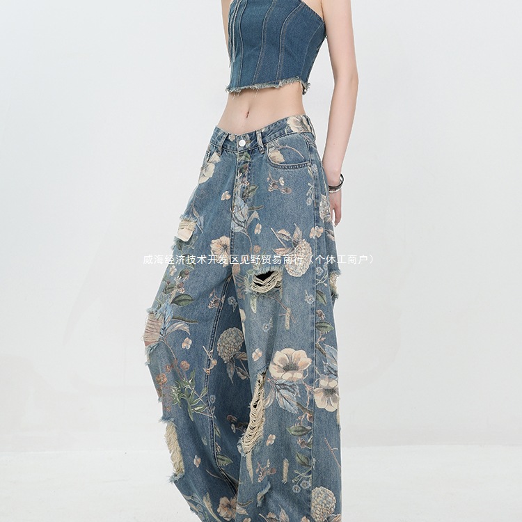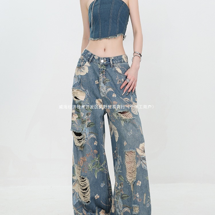 ABWEAR оригинальные летние новые рваные джинсы в американском стиле ретро с принтом, женские свободные прямые широкие брюки длиной до пола