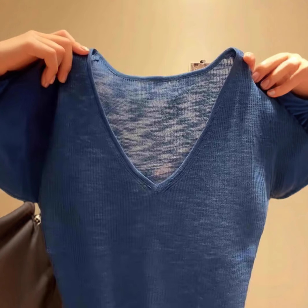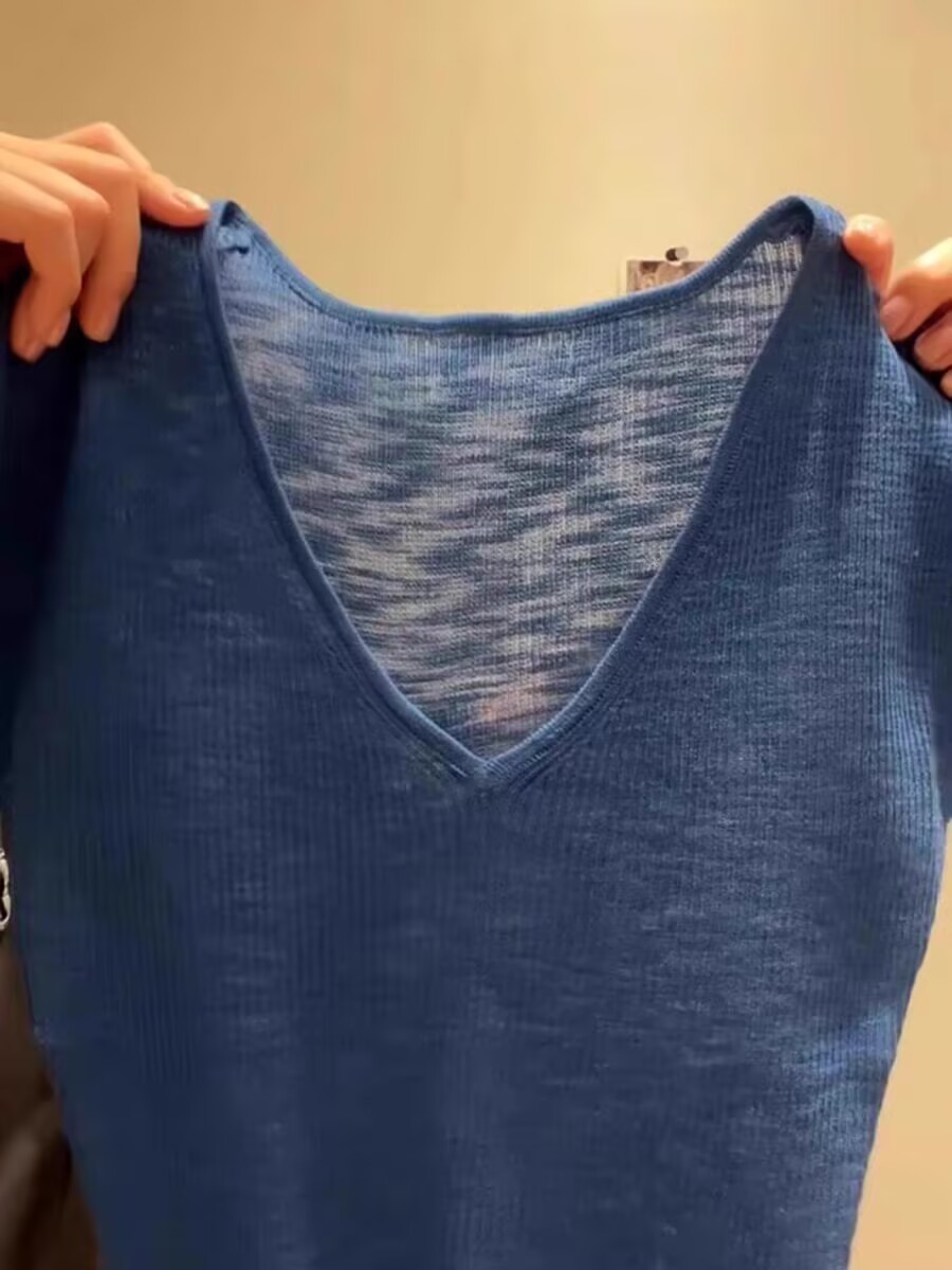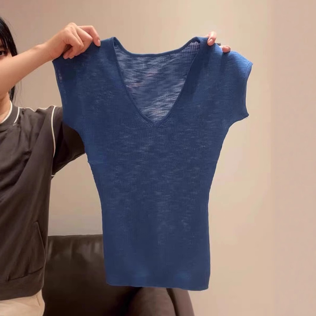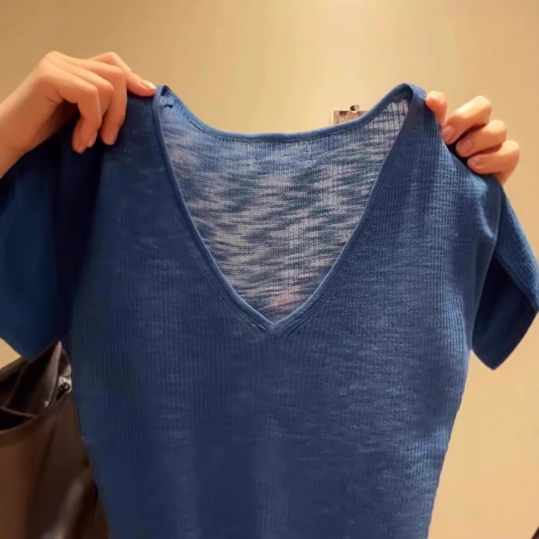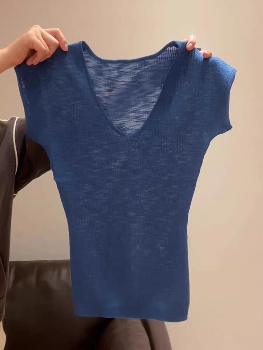 Синий трикотаж с v-образным вырезом и открытым ключицей, с короткими рукавами для женщин, новая летняя облегающая рубашка с тонким низом и элегантным верхом