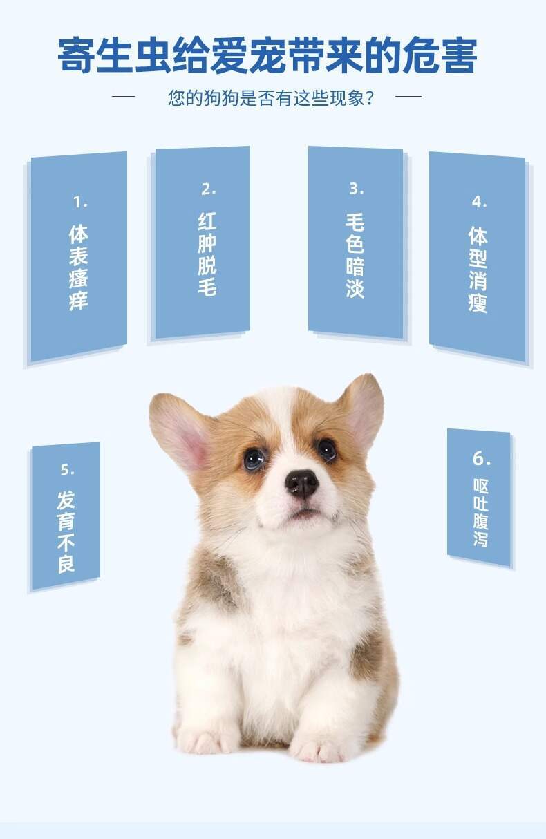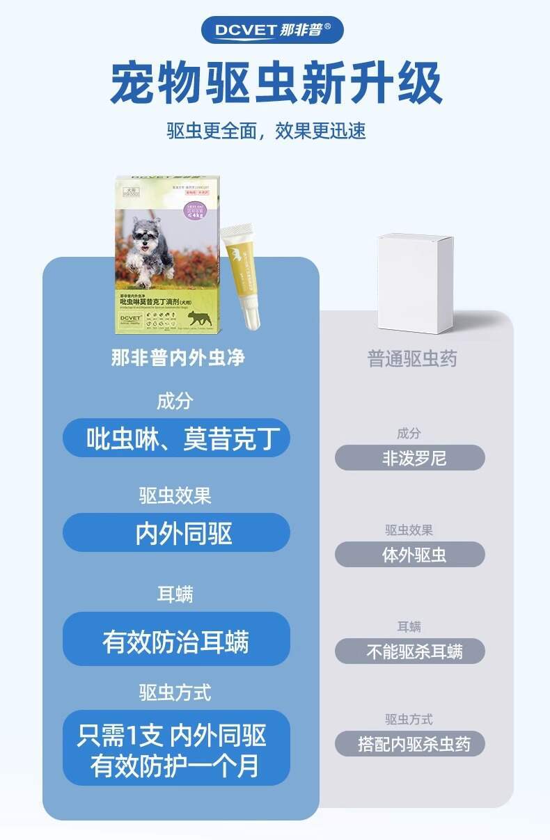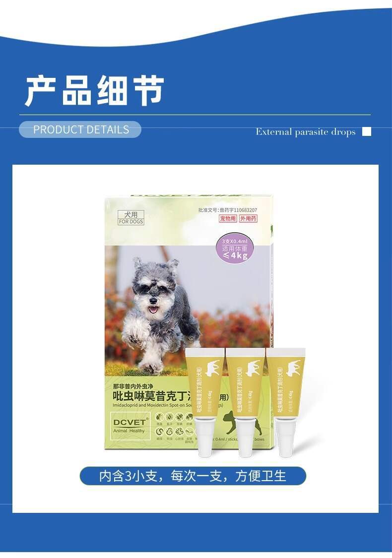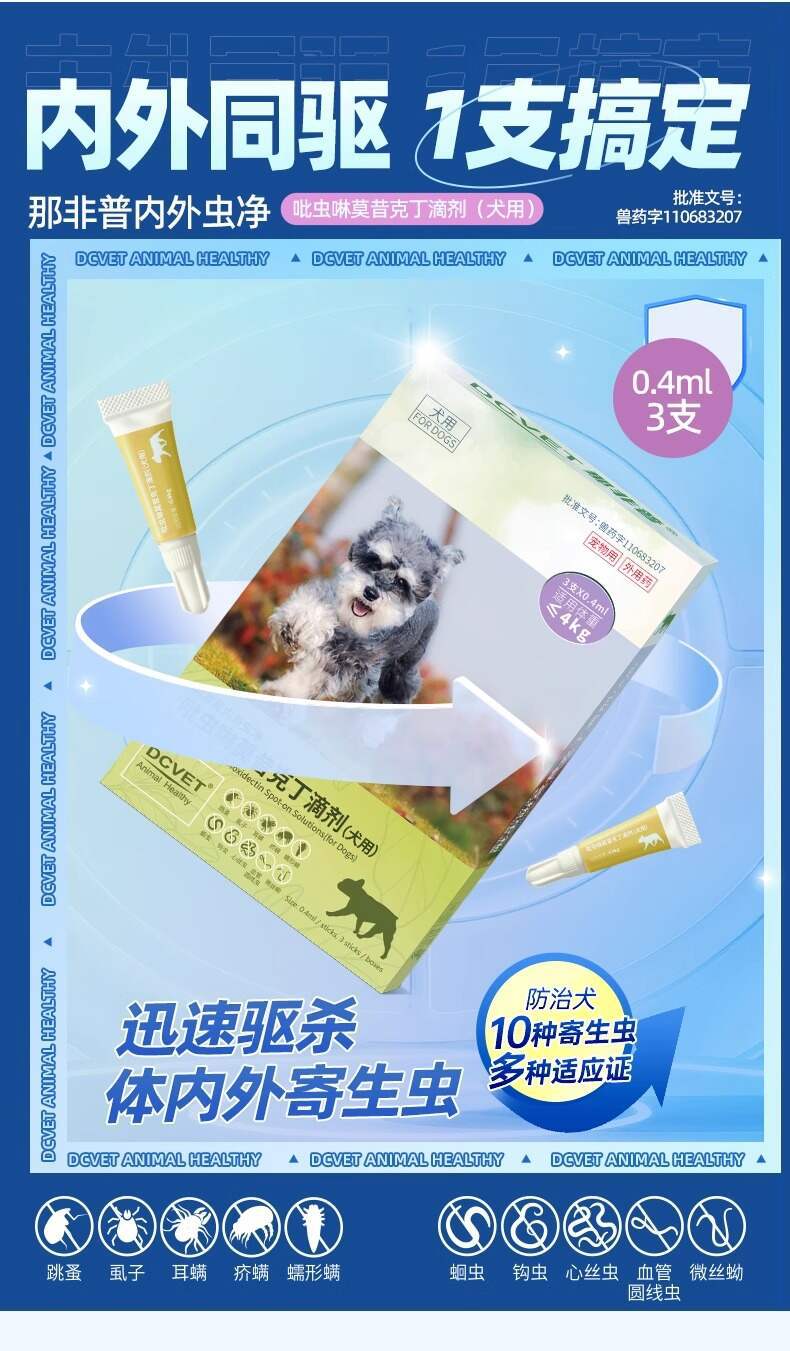 0,4 мл*3 шт. для маленьких собак — внутренний и внешний очиститель от червей (для использования в пределах 4 кг); 1 мл*3 флакона для собак среднего размера — внутренний и внешний очиститель от червей (на 4–10 кг)