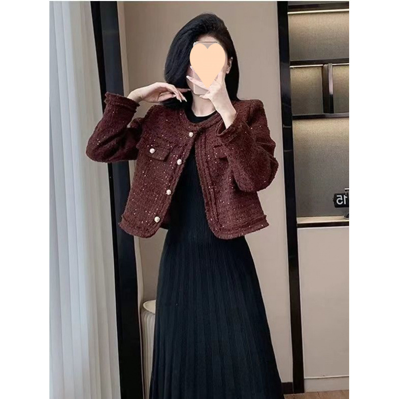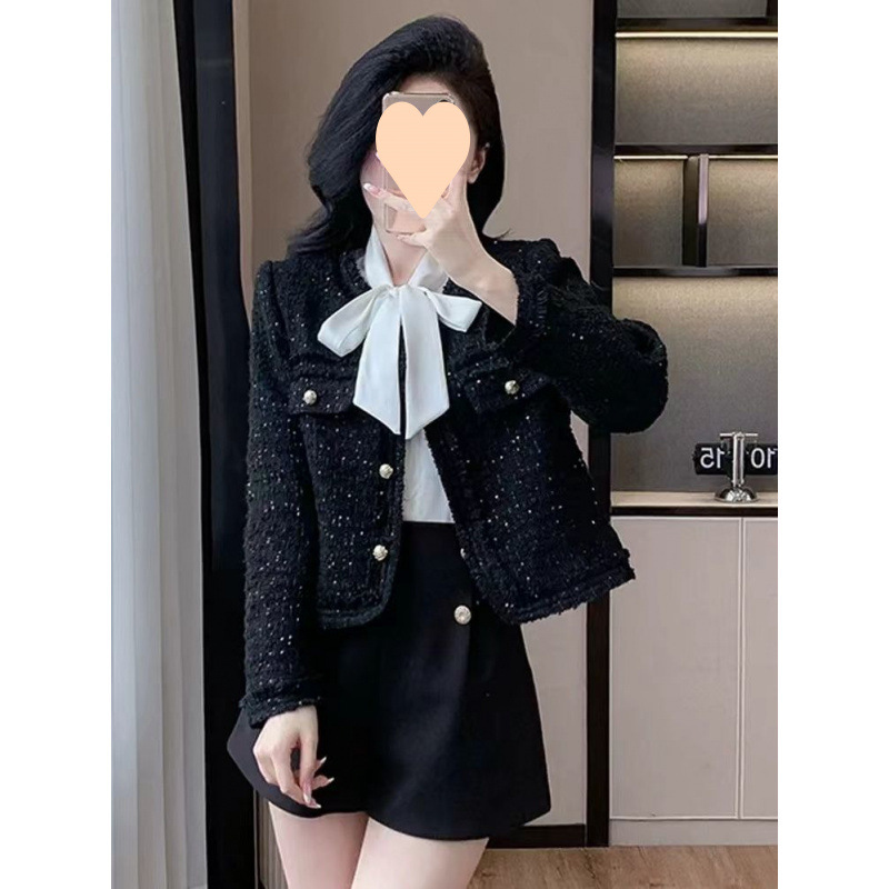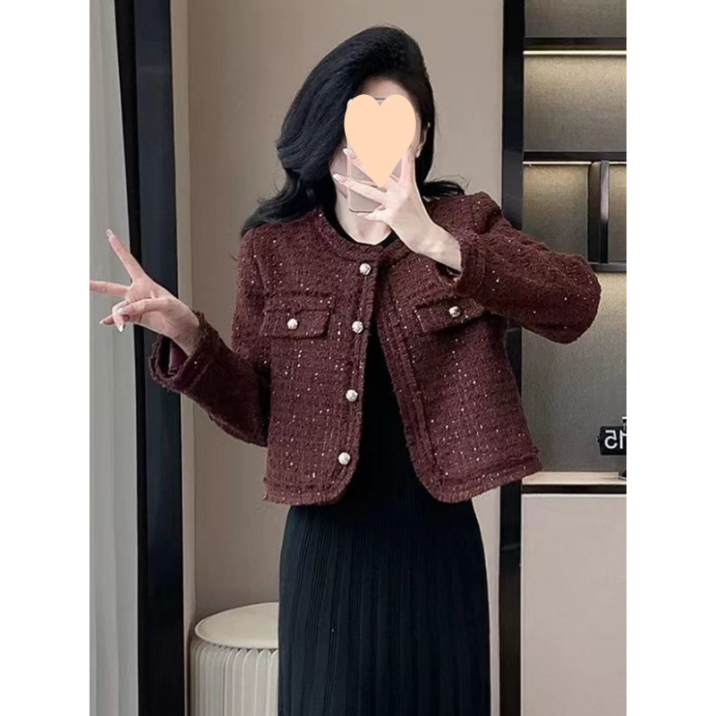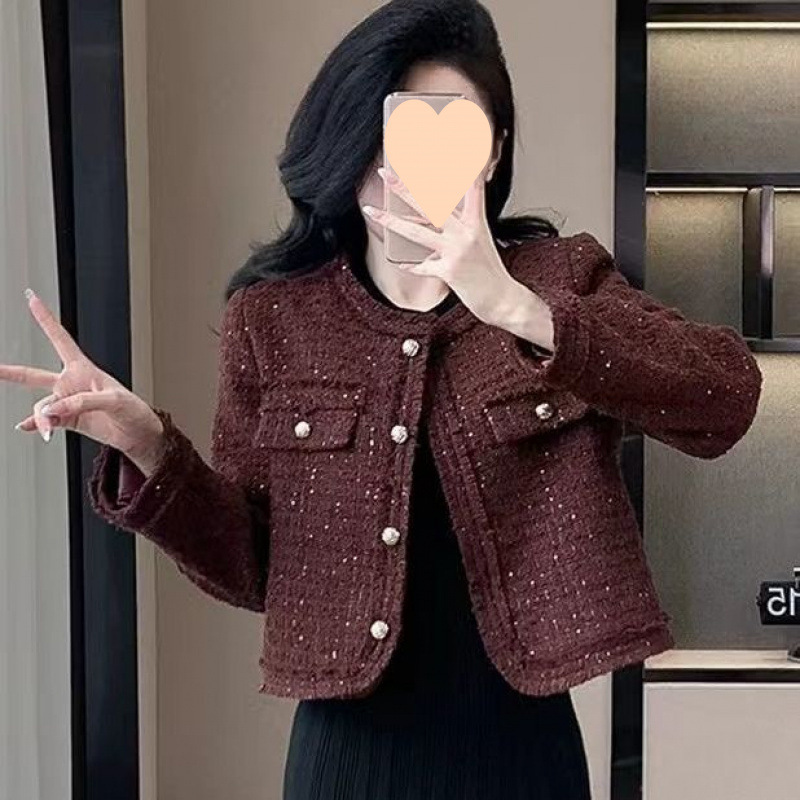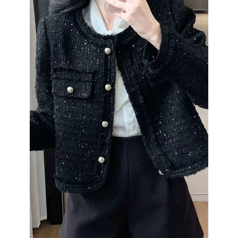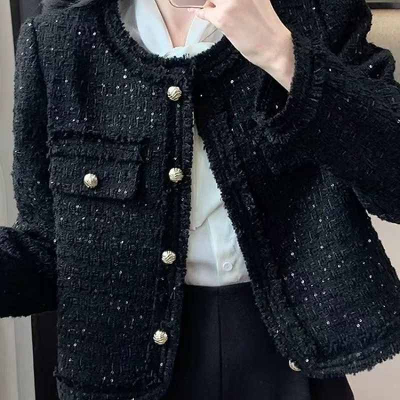 Твидовый жакет в новом корейском стиле, высококачественный твид, дизайн 2025 года, универсальный, приталенный, женственный, элегантный топ с пайетками