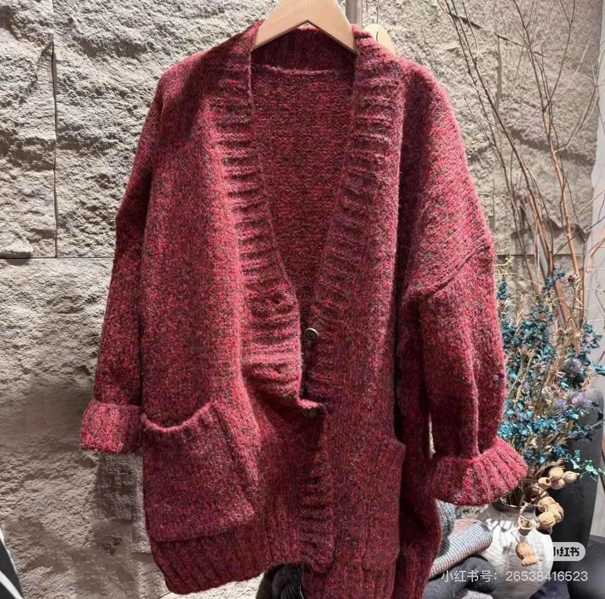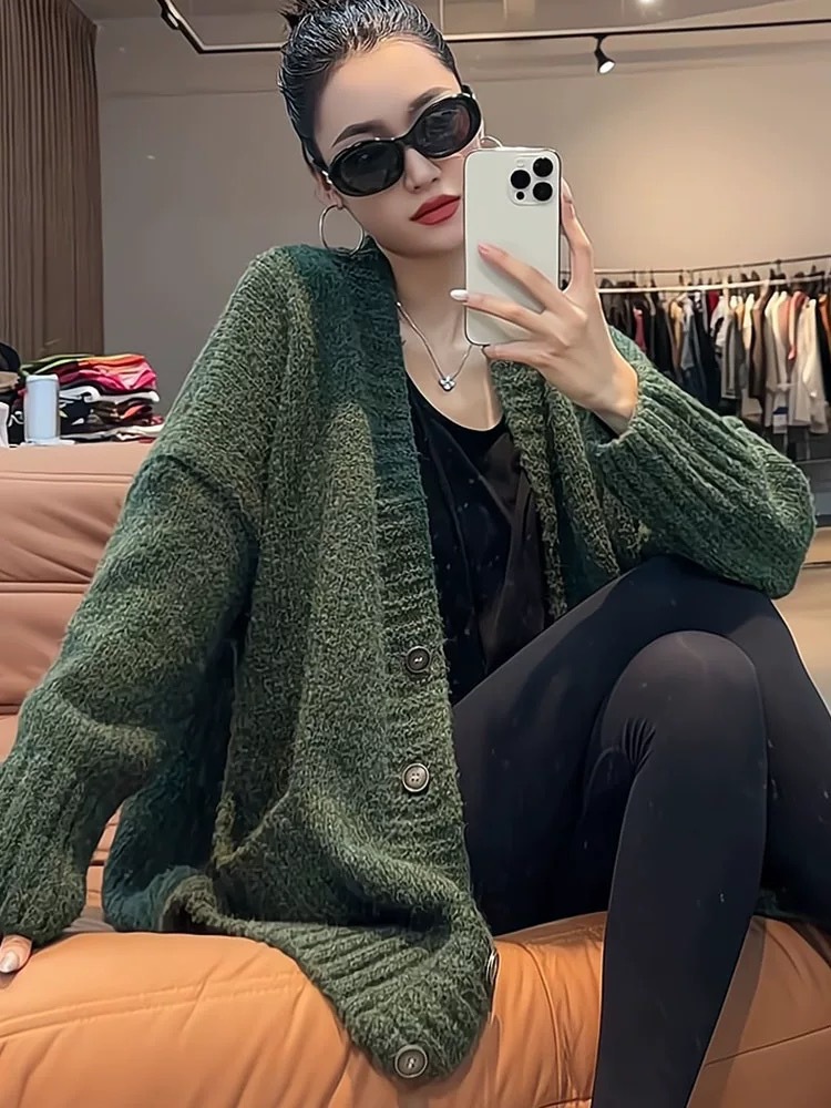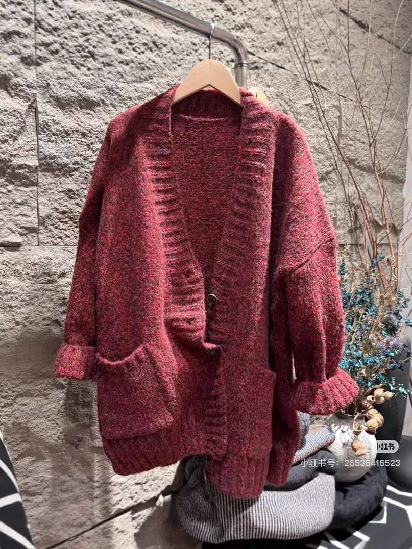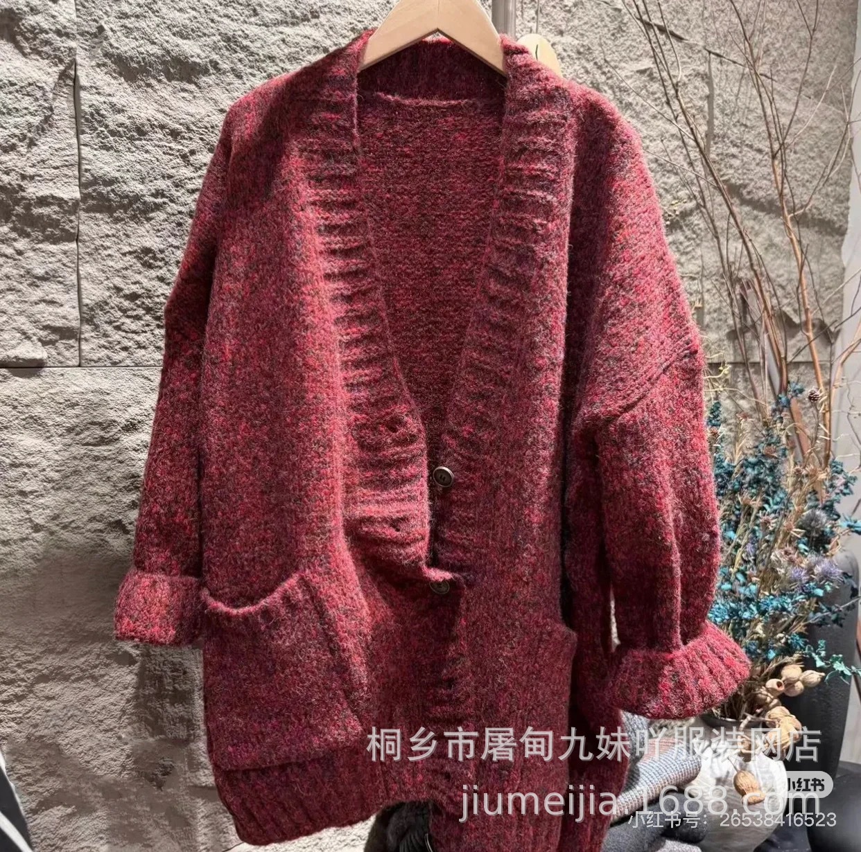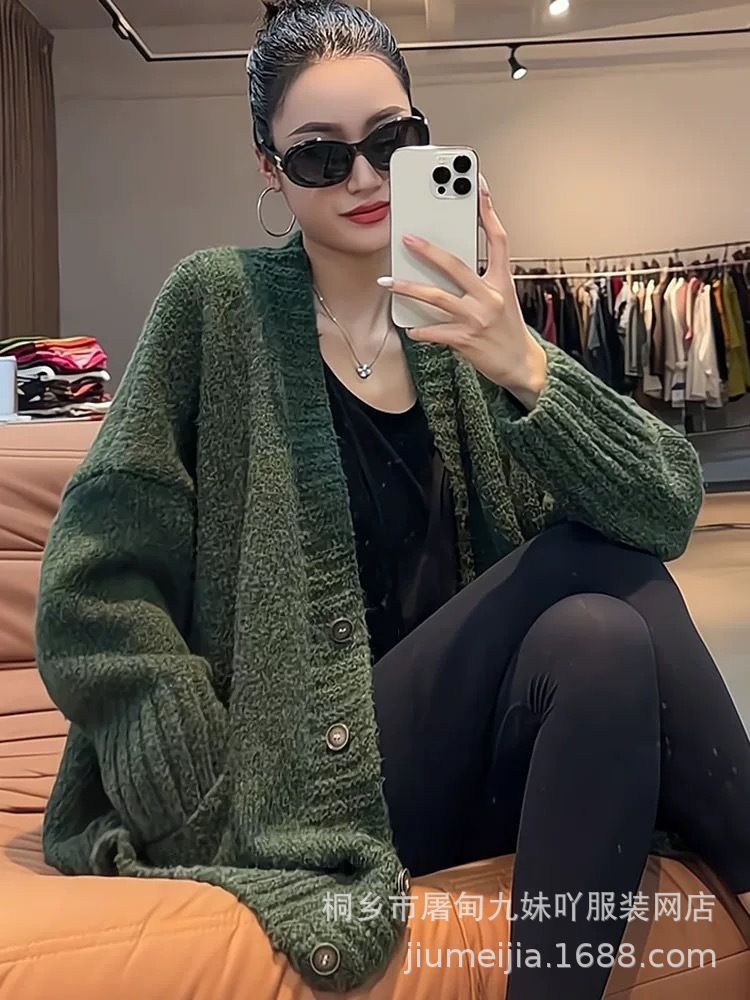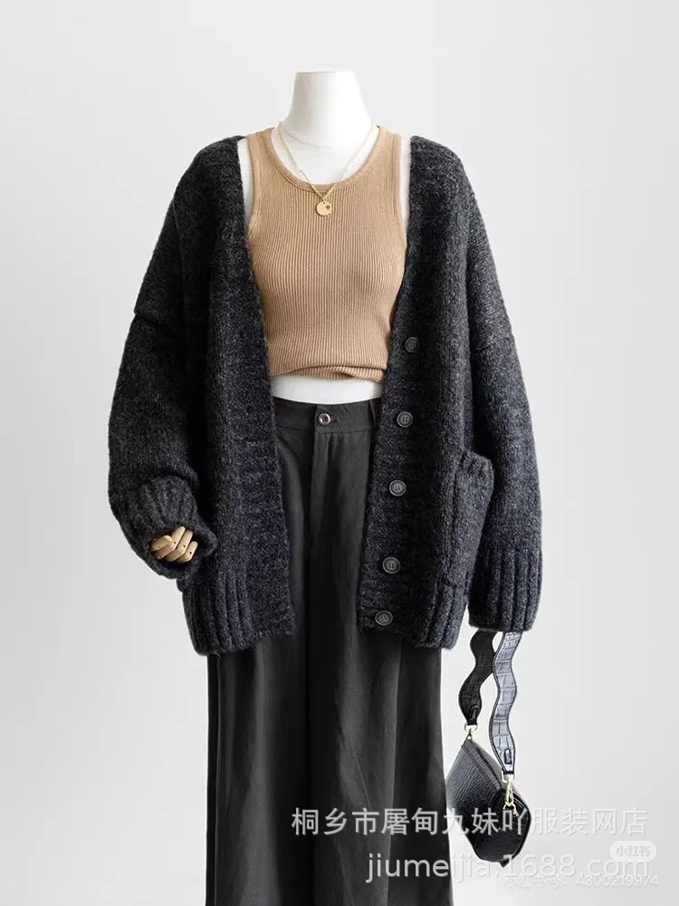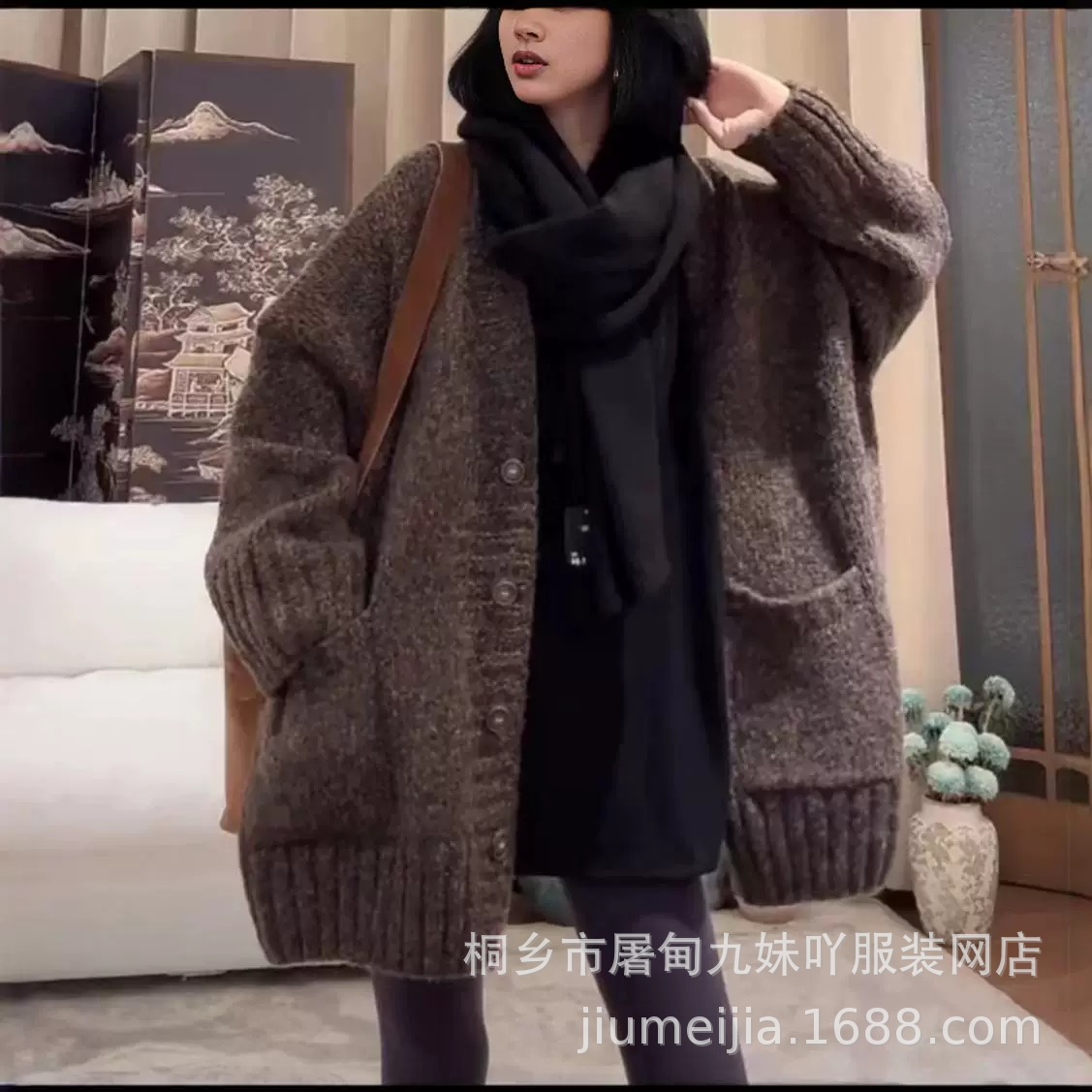 Европейская станция 2025 Осень/Зима Новая мода Универсальный свободный утягивающий свитер средней длины Толстый ленивый вязаный жакет.