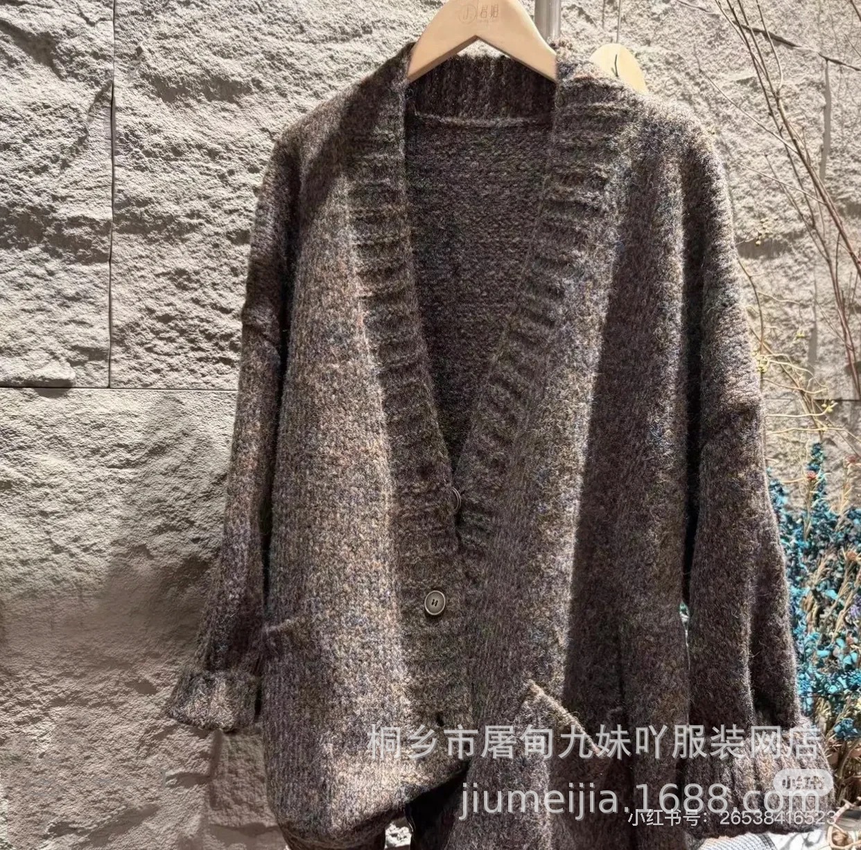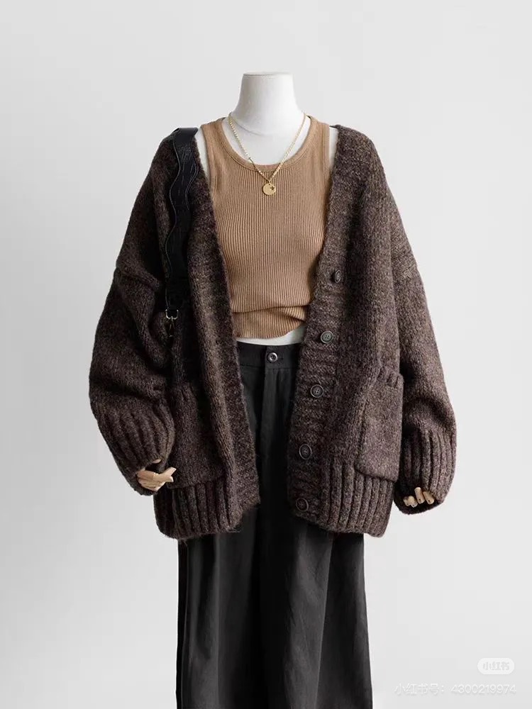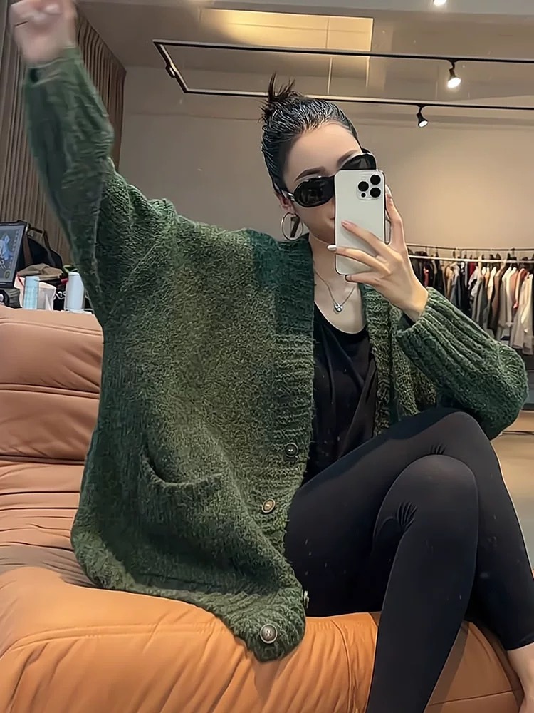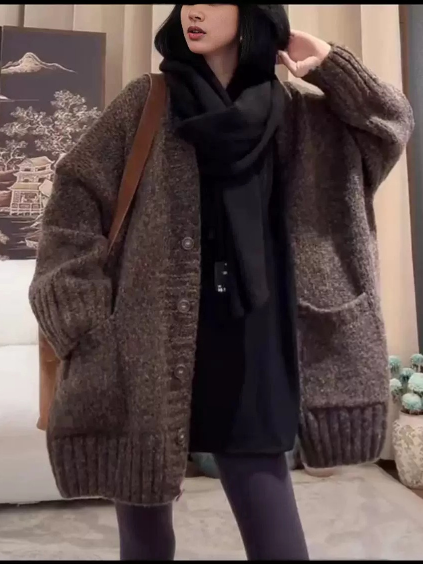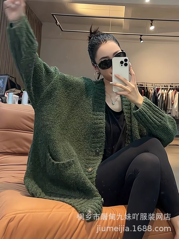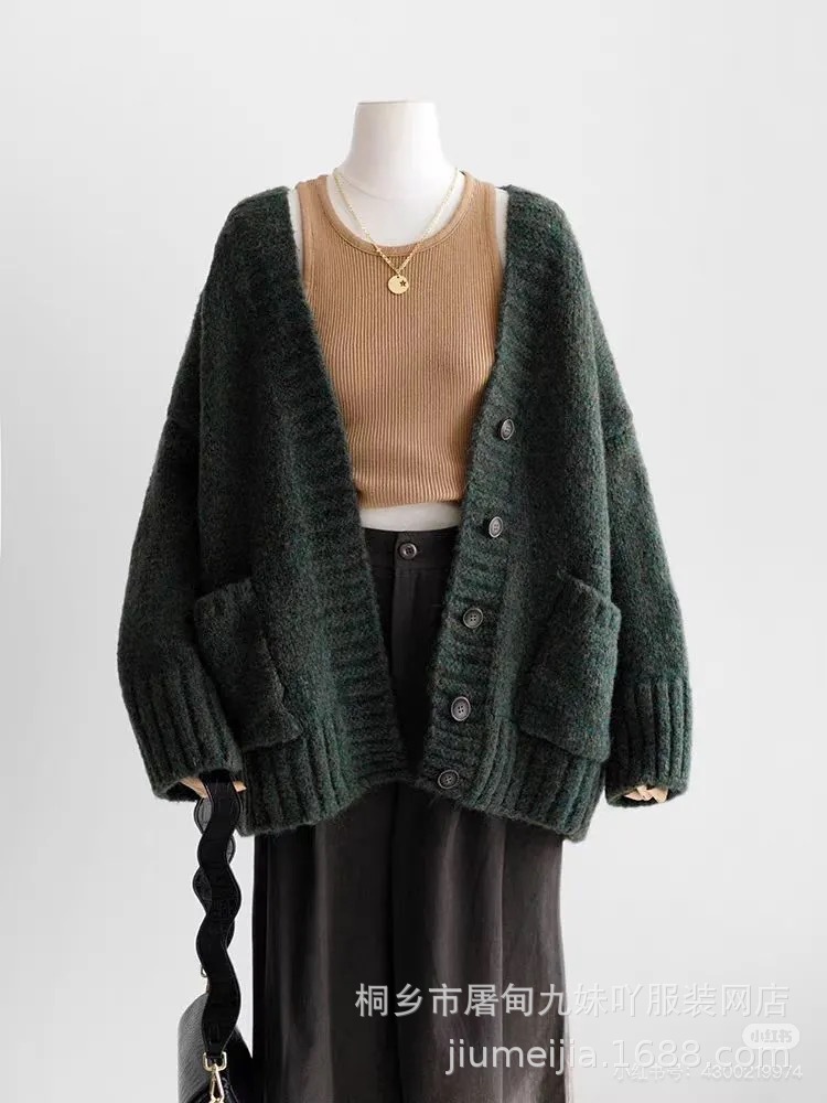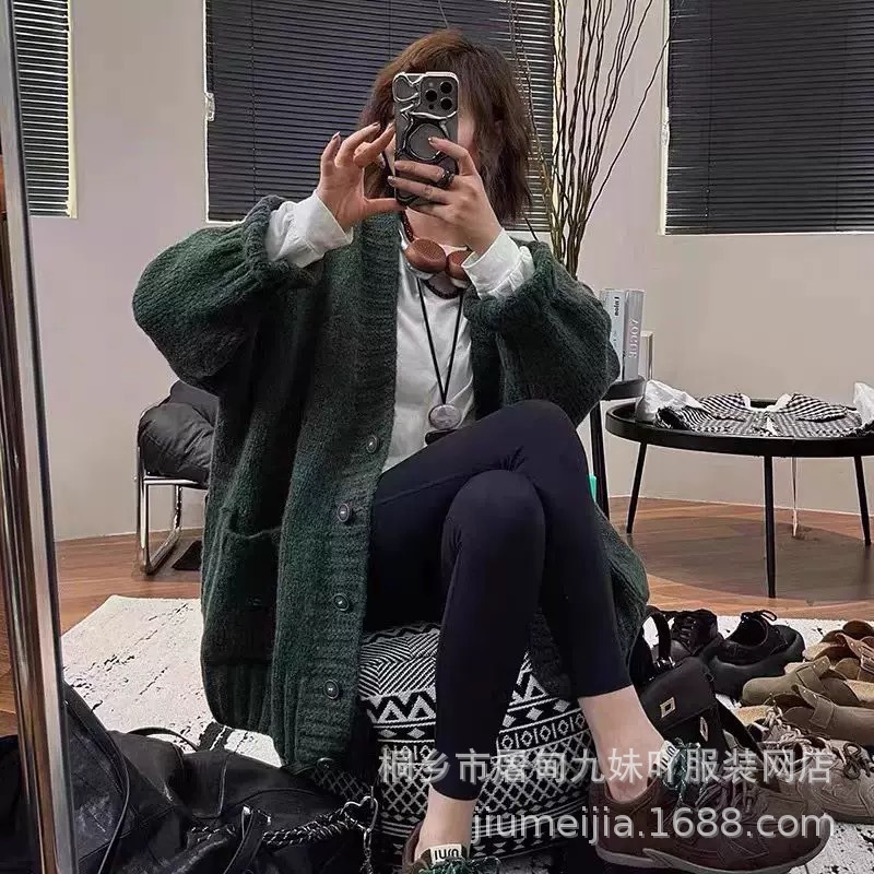 Европейская станция 2025 Осень/Зима Новая мода Универсальный свободный утягивающий свитер средней длины Толстый ленивый вязаный жакет.