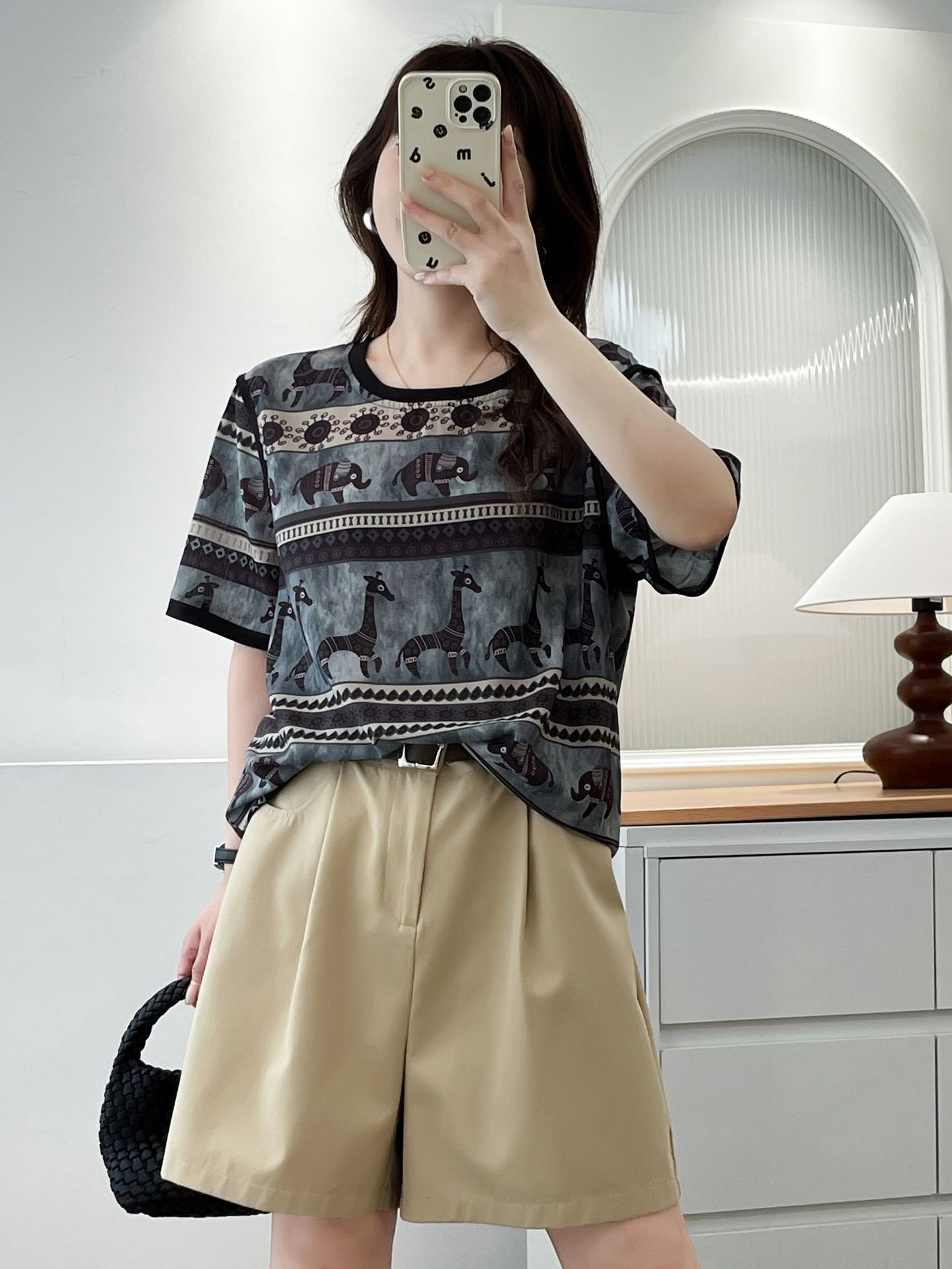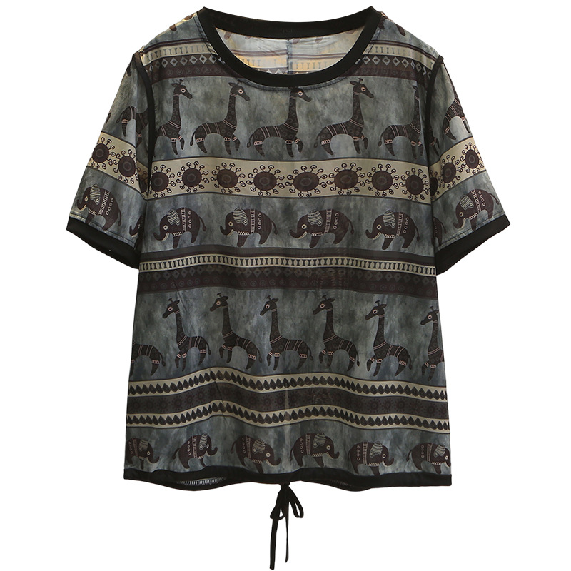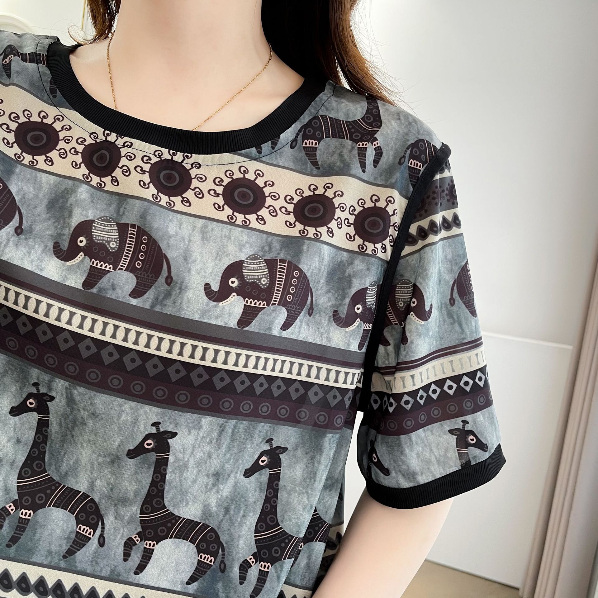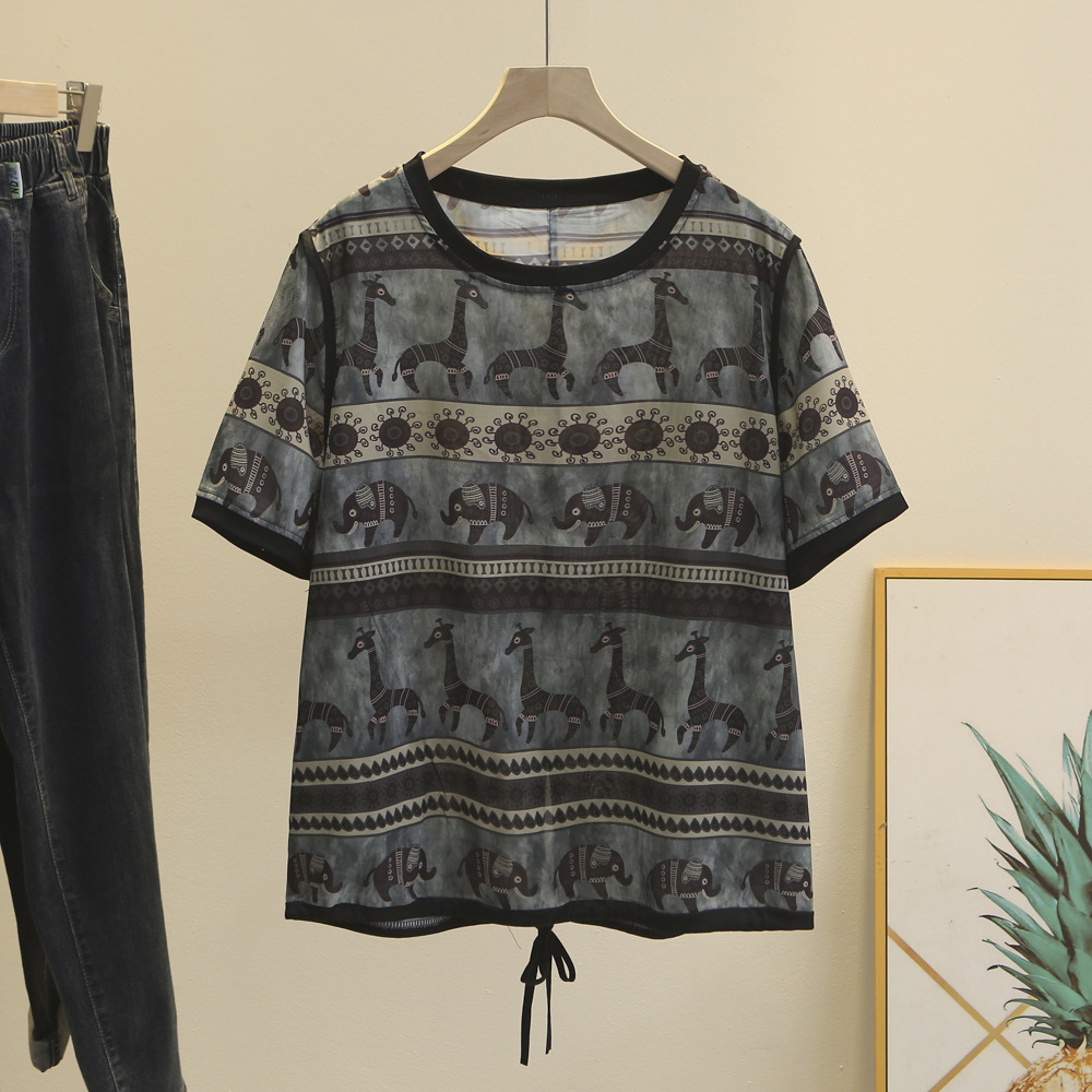Лето 2025, элегантная футболка большого размера с круглым вырезом и короткими рукавами с принтом, повседневная мода для полных девушек, свободный топ для женщин 8516