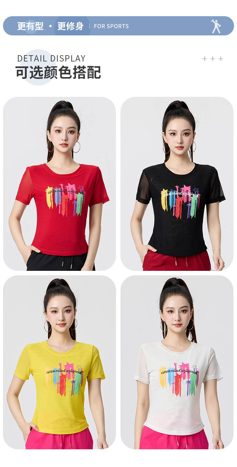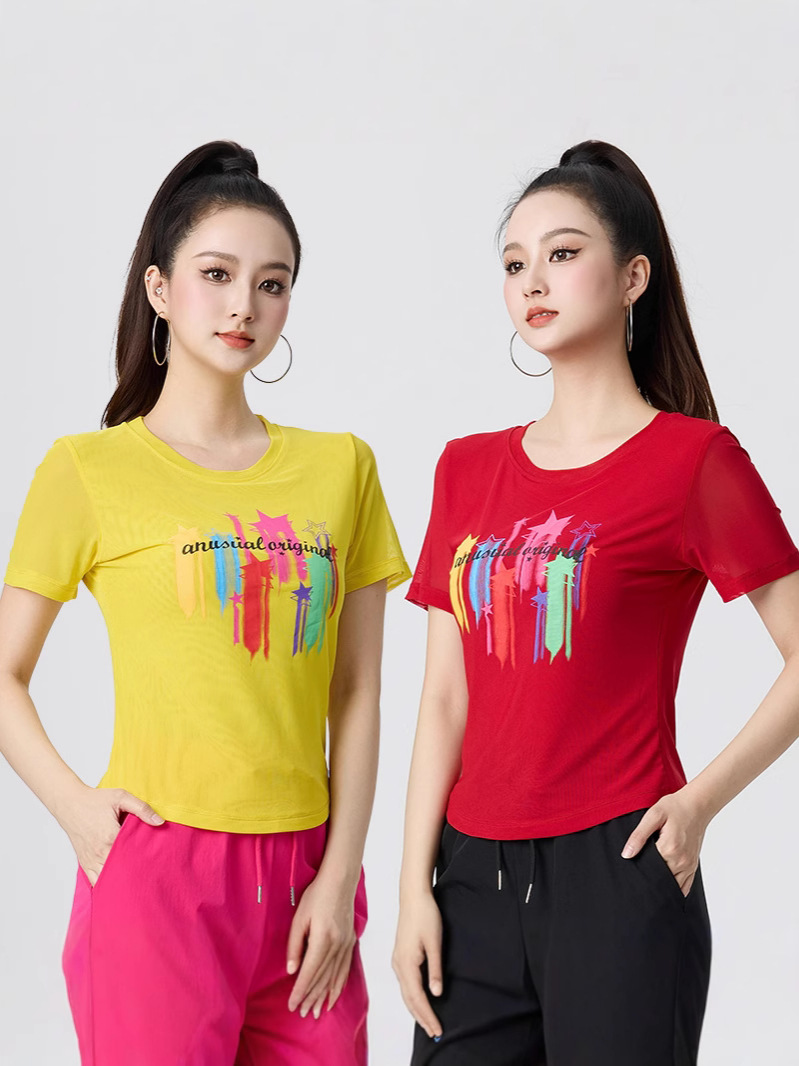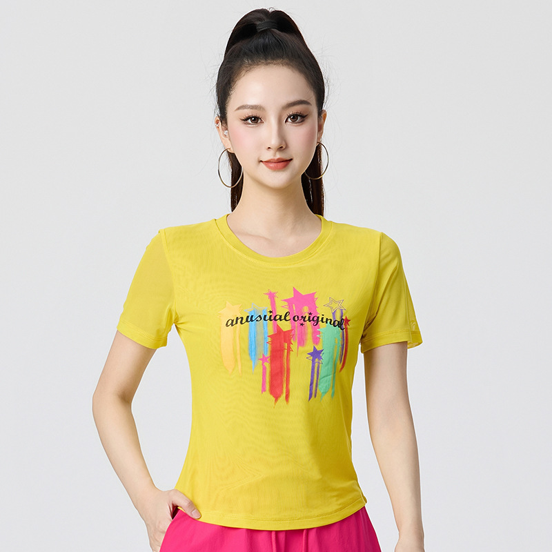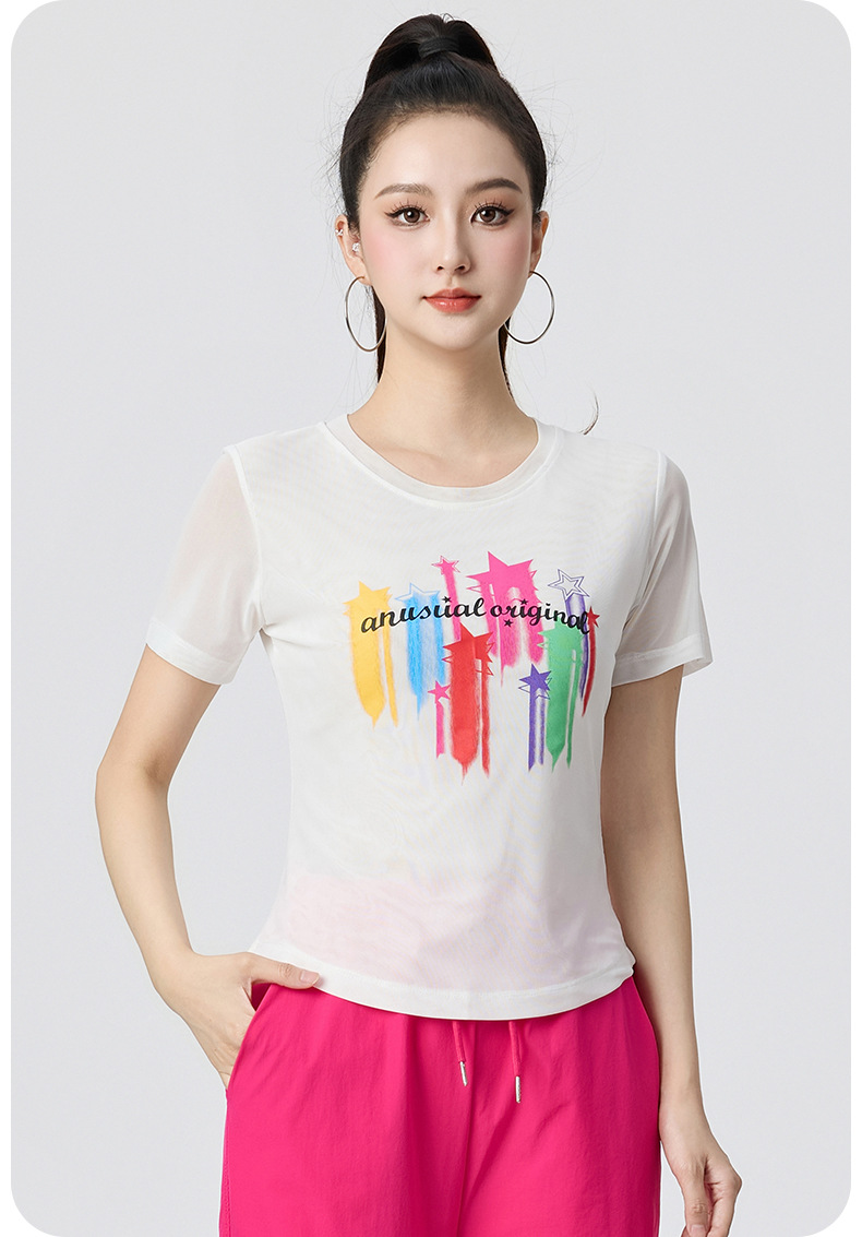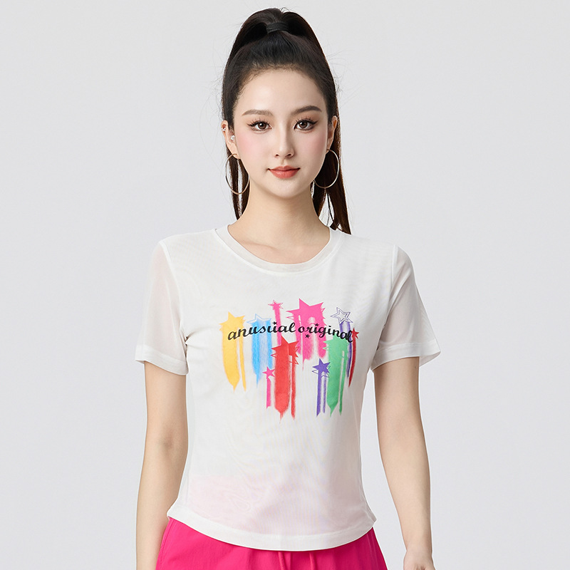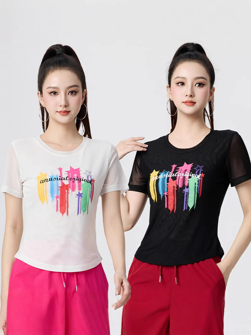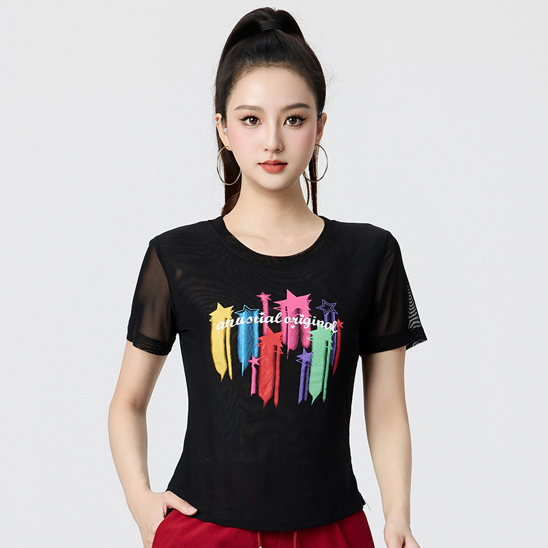 Новая летняя спортивная одежда, топы, двухслойная сетчатая одежда с круглым вырезом и принтом, высокоэластичная модная одежда для фитнеса в стиле хип-хоп, танцевальная одежда